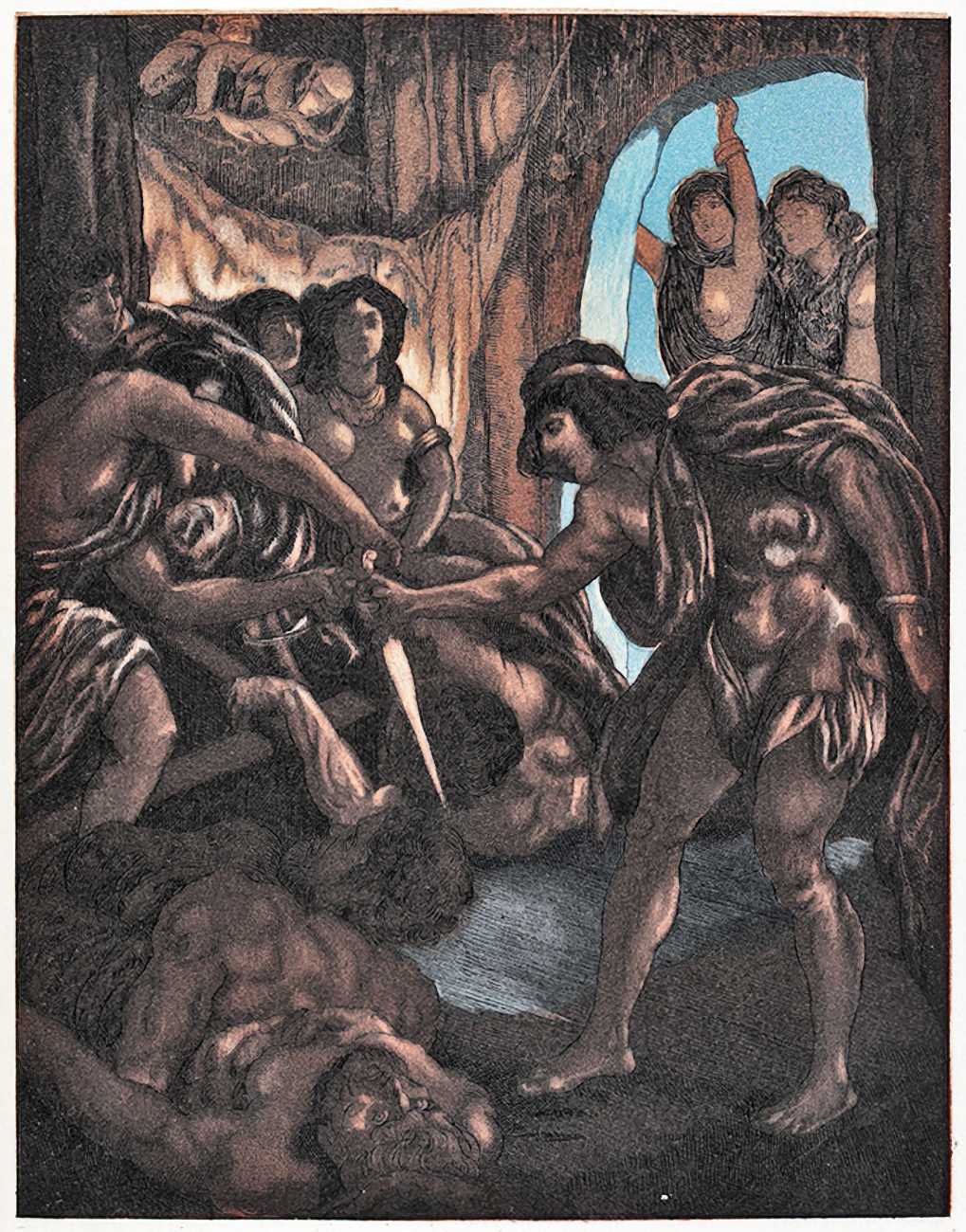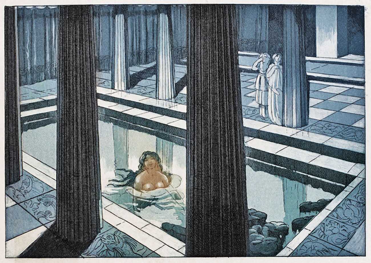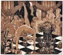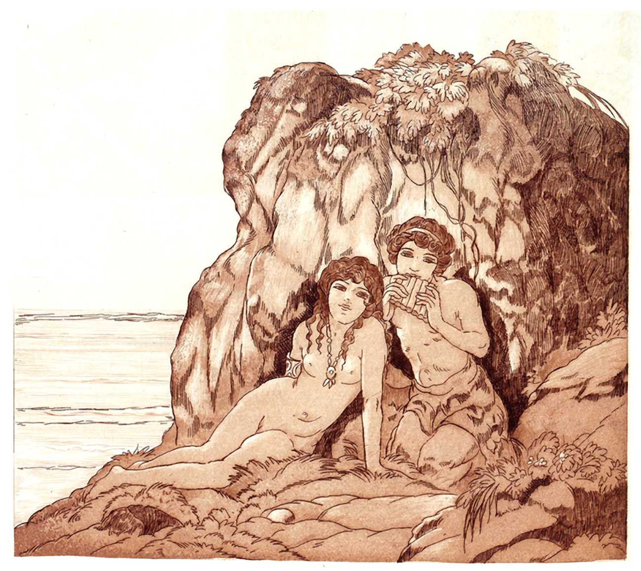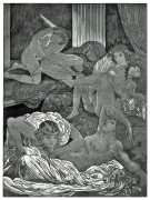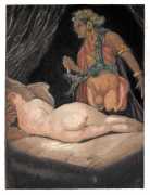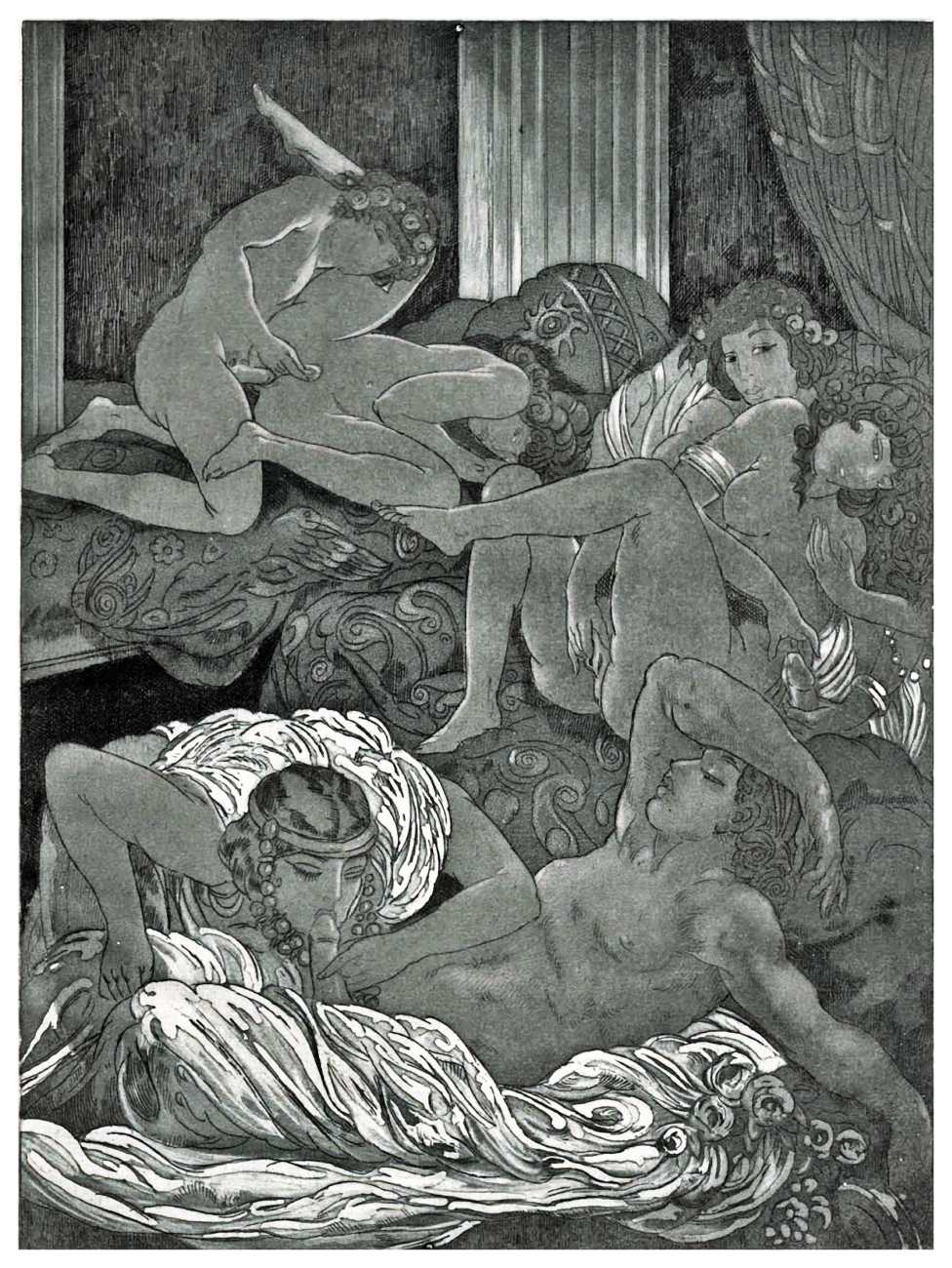 For his more erotic portfolios, starting with the privately-published Le moyen de parvenir in 1921, de Becque often signed his art with the pseudonym Maurice d’Attys, presumably related to the Greek and Phrygian god Attis, who through self-castration, death and resurrection represents the fruits of the earth which die in winter only to rise again in the spring.