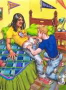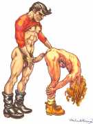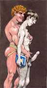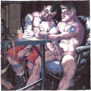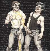 After moving to California in 2000, he spent a year as the Artist in Residence with the Tom of Finland Foundation. Michael enjoyed an inspirational relationship with the work and history of Tom, and maintained a supportive relationship with the Foundation, which is dedicated to the education and preservation of erotic art for all artists. These years would provide Michael with the most important friendships and partnerships, and saw him creating some of the best work of his life. He was now free to draw for his pleasure, to pay the rent, and for fans commissioning erotic scenes via his website. Michael always felt he was visually documenting every variety and scenario in gay and straight sexual activities. His inspirations for drawing his characters came from the everyday, regular people he encountered on the street, on the bus, in parks and markets, in seedy bars, and in dark alleys where names were not exchanged but furtive fun was found. Michael’s drawings exposed the fevered excitement and erotic beauty in every body and face; he always said he did not draw ‘pretty’ guys because he knew regular guys had better sex.