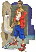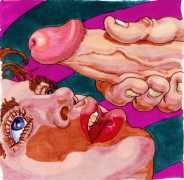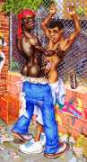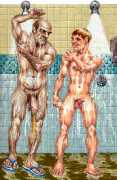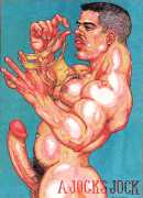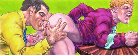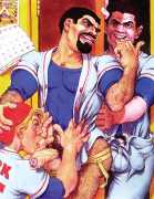 While still at Spellman, Michael married his high school sweetheart and six months later became a father. Later that year he was denied a diploma because he had hurled a jelly donut at the back of his religious instructor’s head (she was an ex-nun). With a family to support, Michael worked for six years in the shipping and receiving area at Gimbels department store. At the end of the 1970s his marriage dissolved under the combined weight of his irresponsible attitude and continuing homosexual shenanigans, and in 1980, embracing his newly found gay identity, he went to work at the St Mark’s Baths, a sperm-splashed institution in the East Village. Michael rose quickly through the ranks from laundry boy to management through being an inept but endearing presence. Encouraged by Bruce Mailman, owner of both the baths and the magnificent and historic Saint dance club, Michael rediscovered art and in particular his skill at drawing the naked men surrounding him at work. In 1986 Michael realised that the AIDS epidemic would soon end the heyday of the tubs. It was during this time that his works were first published in Stroke magazine. He next worked for two years at the GVC porn video distributorship, until the company profits vanished up the executive’s nostrils.