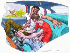 Raised in the Washington Heights district of New York, he attended the St Rose of Lima Catholic School from first through fifth grades. Even though he rarely had art supplies, from an early age he drew on paper bags with ballpoint pens, and filled small stenography pads with drawings. He was buck-toothed and regularly called a sissy, but didn’t really care as long as he could draw more inviting worlds on A&P supermarket bags. He became part of an innovative programme developed by the Archdiocese of New York whereby particularly bright boys were taught rigorous, in-depth college courses by the Christian Brothers. So he spent the sixth, seventh and eighth grades travelling downtown to West 83rd street to attend the Monsignor Kelly experimental school. Here his artistic abilities were recognised and he flourished. Upon graduation however, he found that there was no available next step, and was horrified when he started freshman year at Cardinal Spellman High School in the Bronx and understood that he’d have to endure four years of being badly taught what he already knew by inferior teachers. Young Kirwan became irreverent and manipulative, displaying a caustic wit when insulting his superiors.