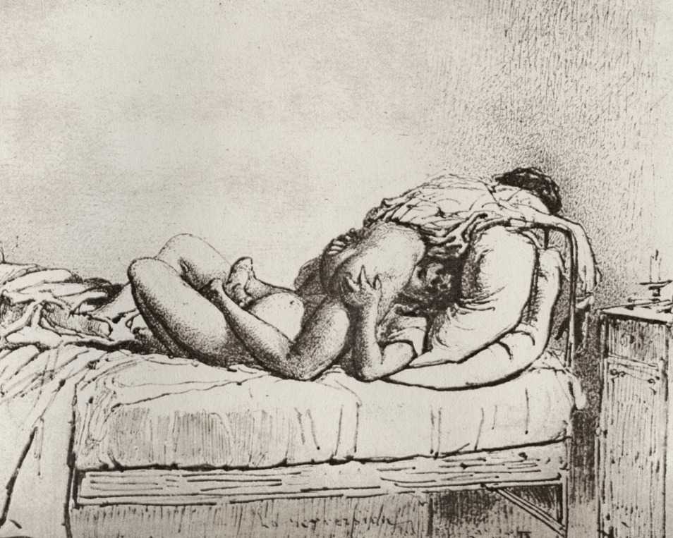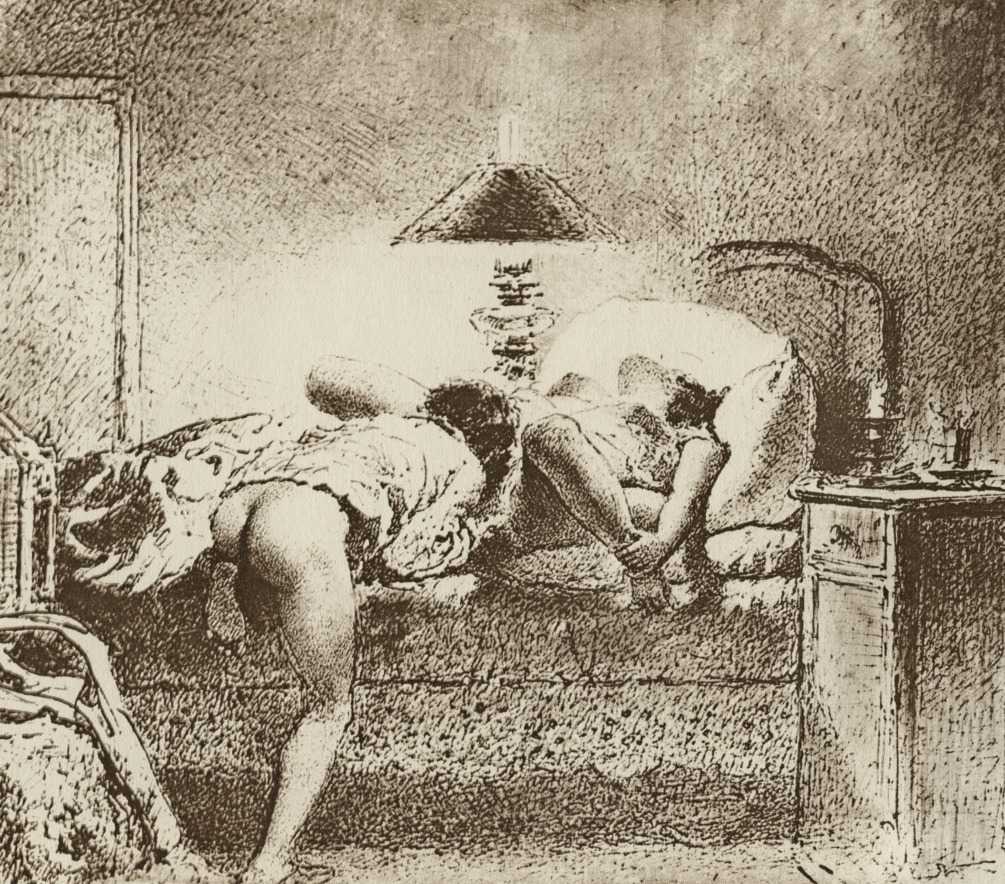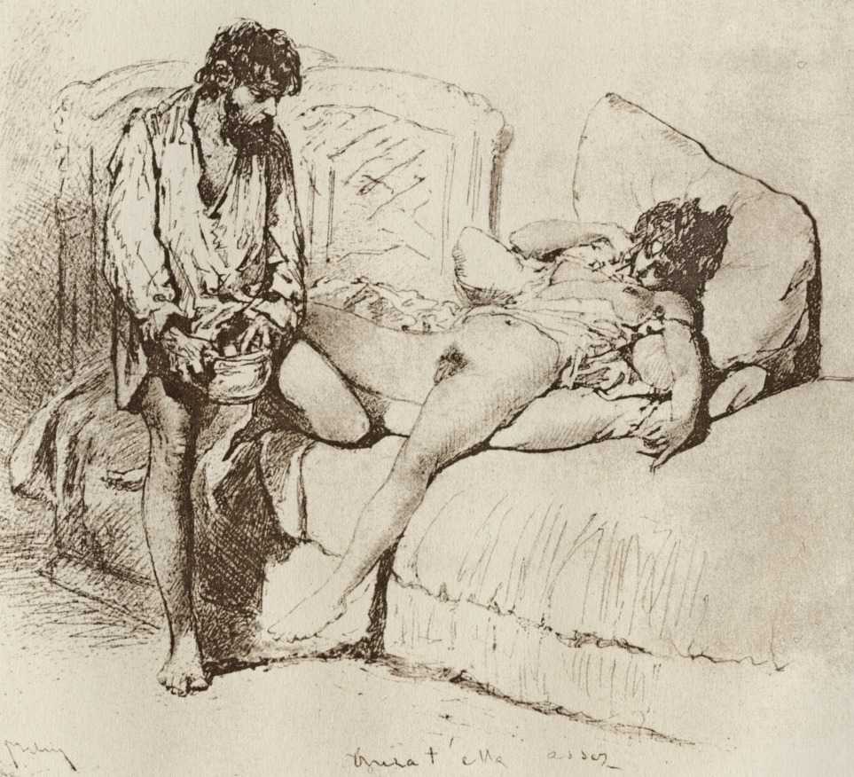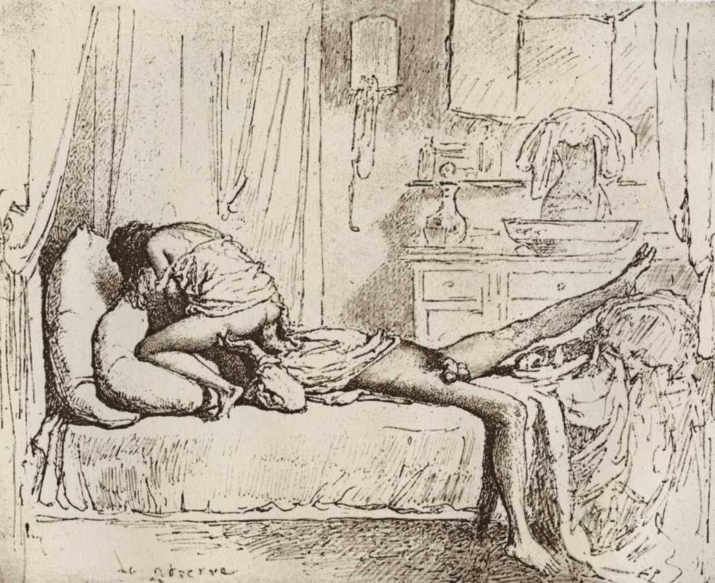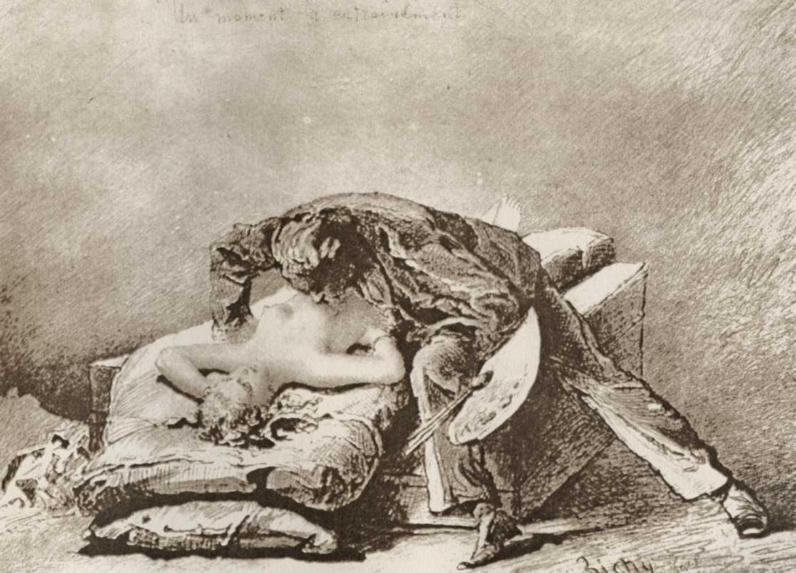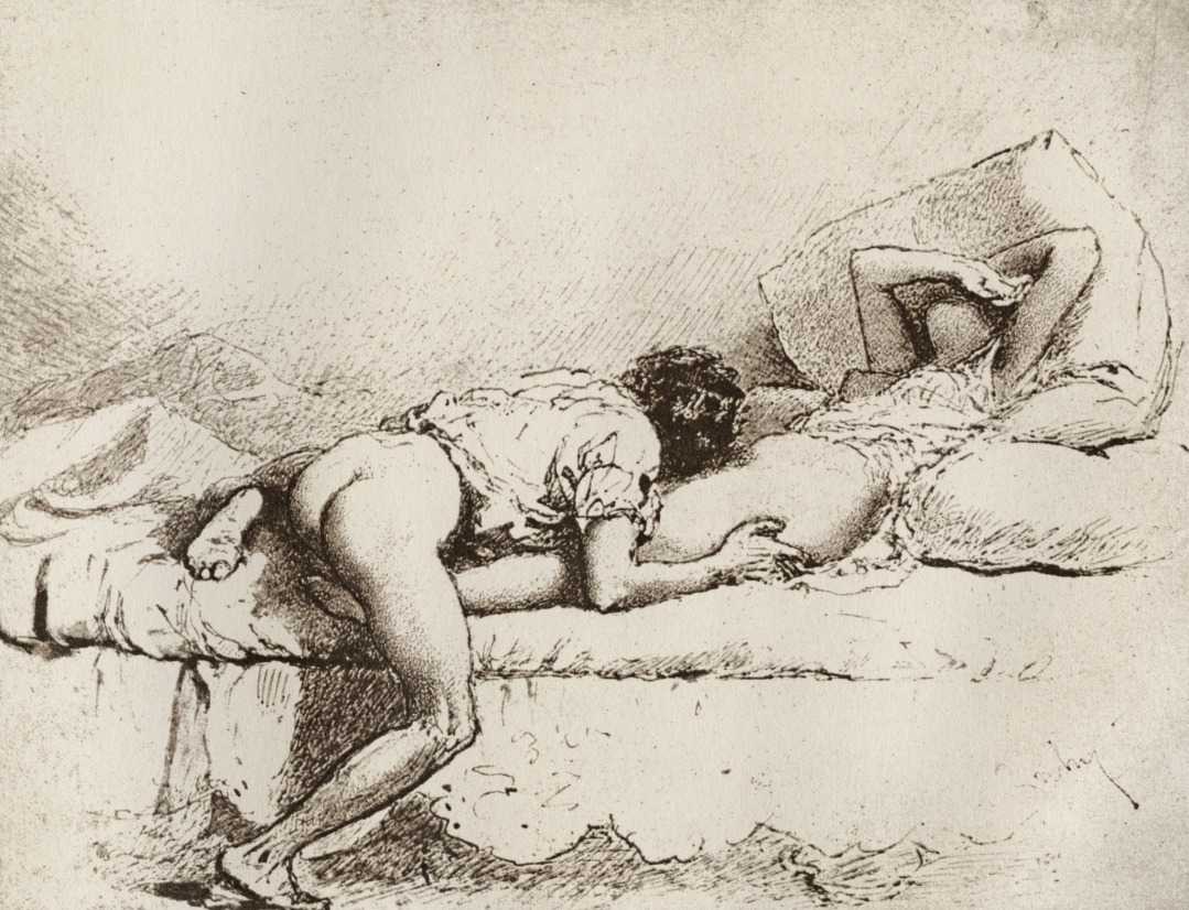 Alongside his paintings, however, he had also been maintaining a portfolio of drawings portraying intimate scenes of ordinary people enjoying sexual and sensual intimacy, a portfolio which was only made public after his death. They appear mostly to date from the 1870s, when he was in Paris, and are clearly drawn from life; they have a particular warm intensity in which the individuals portrayed are clearly enjoying themselves and each other. More than fifty of these drawings are known, and prints made from them circulated widely during the early 1900s.