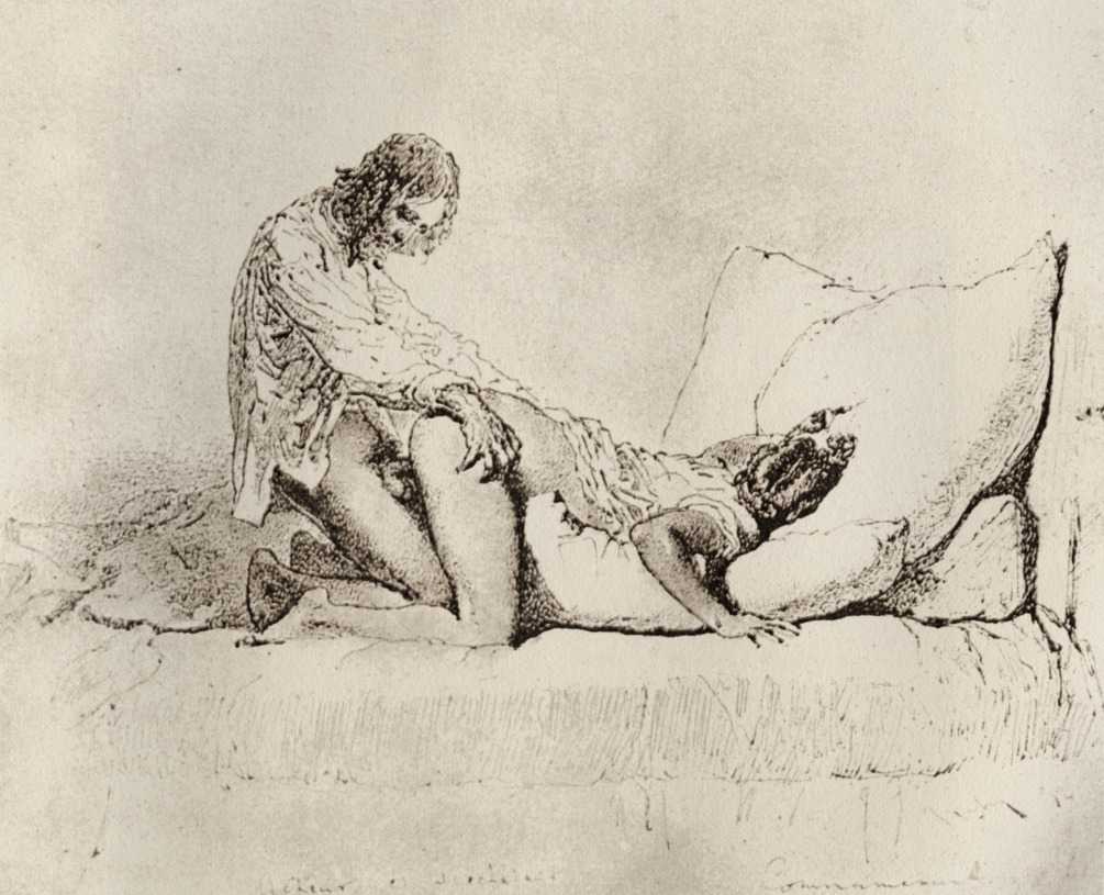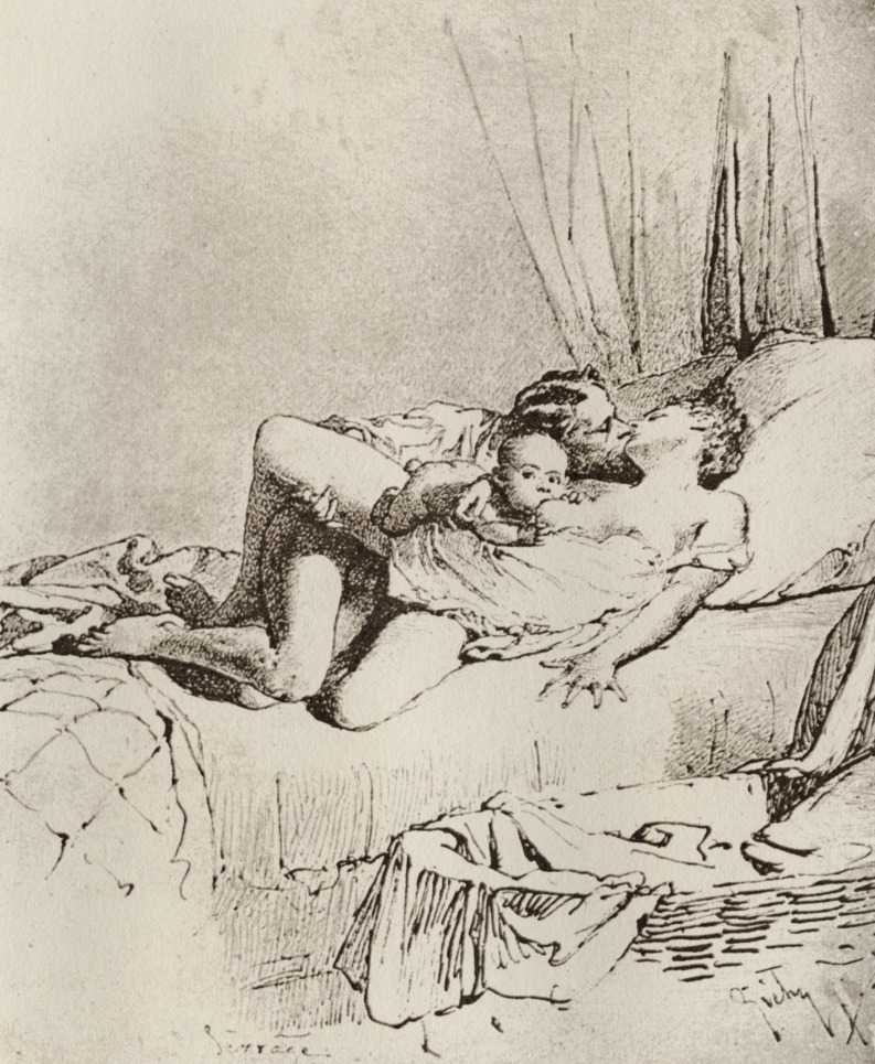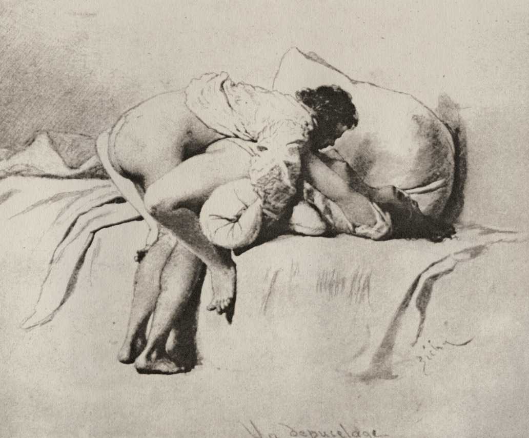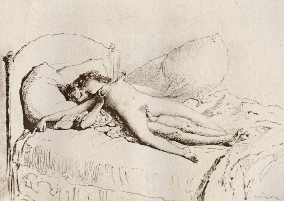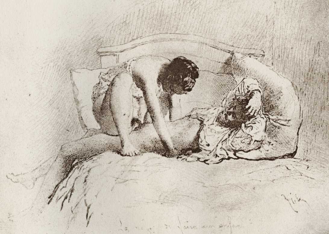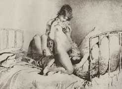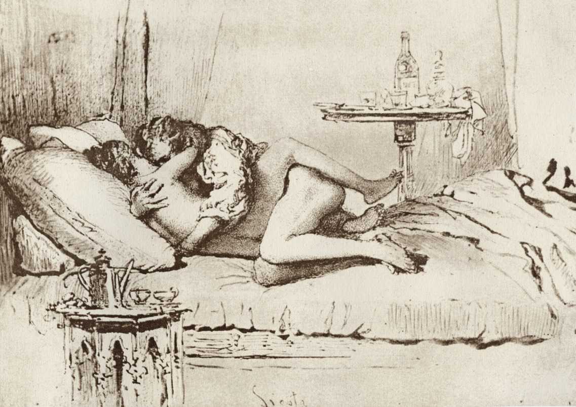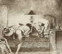 Alongside his paintings, however, he had also been maintaining a portfolio of drawings portraying intimate scenes of ordinary people enjoying sexual and sensual intimacy, a portfolio which was only made public after his death. They appear mostly to date from the 1870s, when he was in Paris, and are clearly drawn from life; they have a particular warm intensity in which the individuals portrayed are clearly enjoying themselves and each other. More than fifty of these drawings are known, and prints made from them circulated widely during the early 1900s.