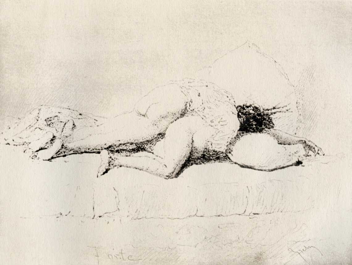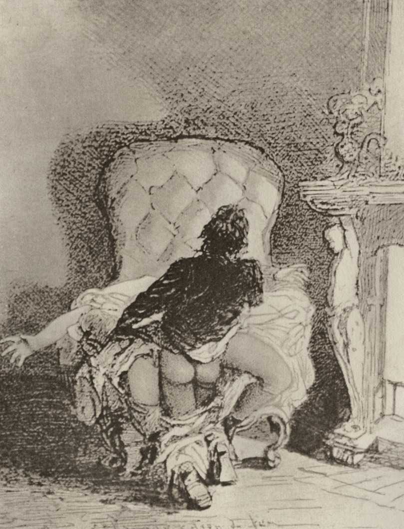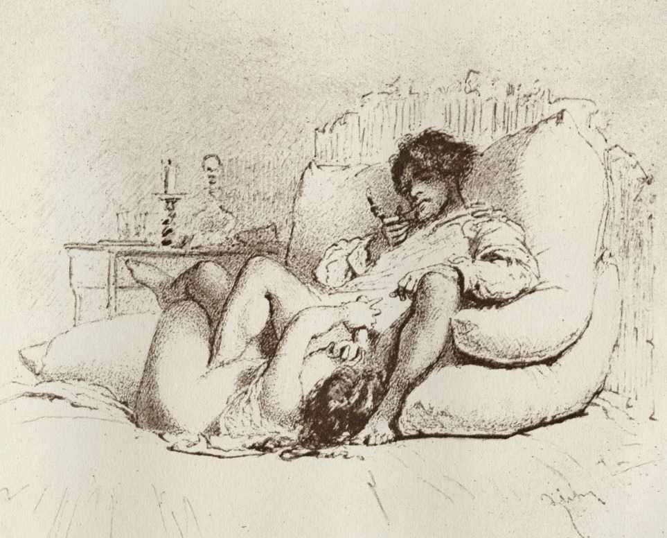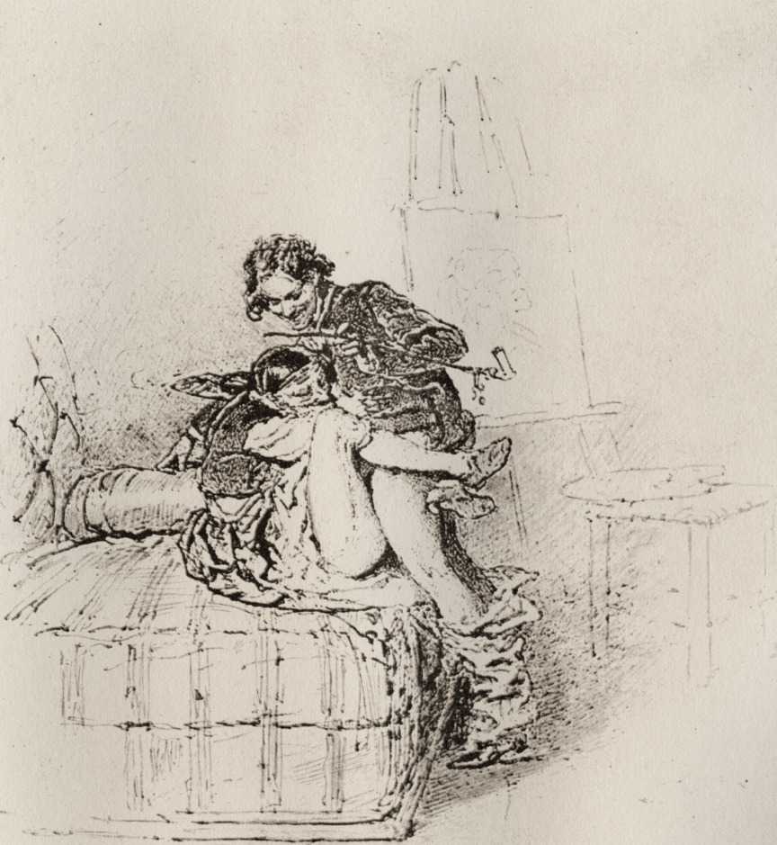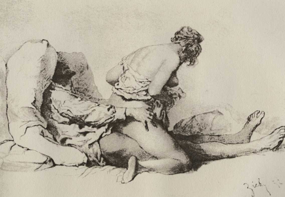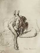 Alongside his paintings, however, he had also been maintaining a portfolio of drawings portraying intimate scenes of ordinary people enjoying sexual and sensual intimacy, a portfolio which was only made public after his death. They appear mostly to date from the 1870s, when he was in Paris, and are clearly drawn from life; they have a particular warm intensity in which the individuals portrayed are clearly enjoying themselves and each other. More than fifty of these drawings are known, and prints made from them circulated widely during the early 1900s.