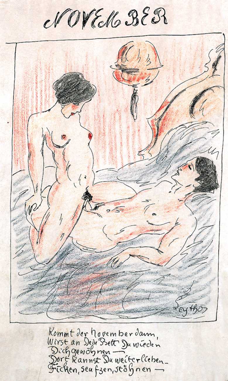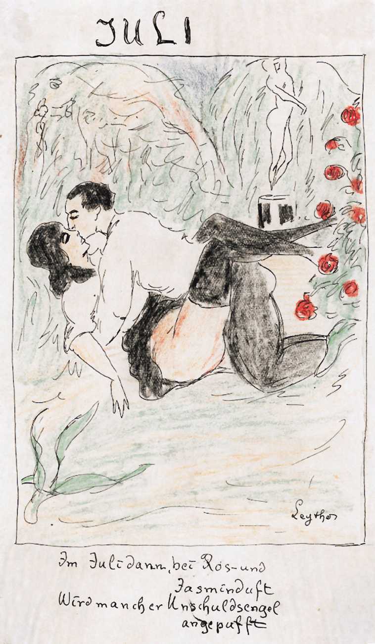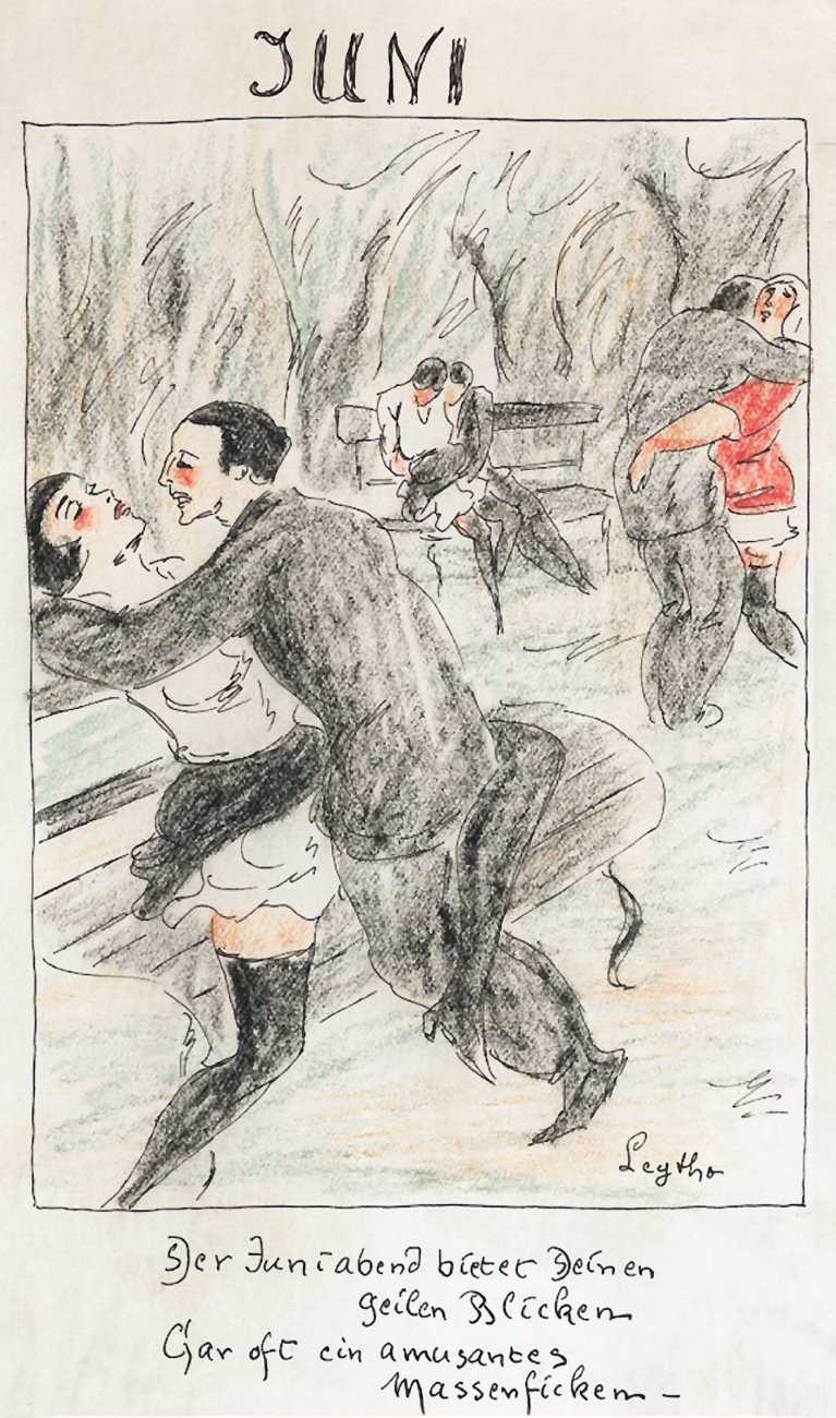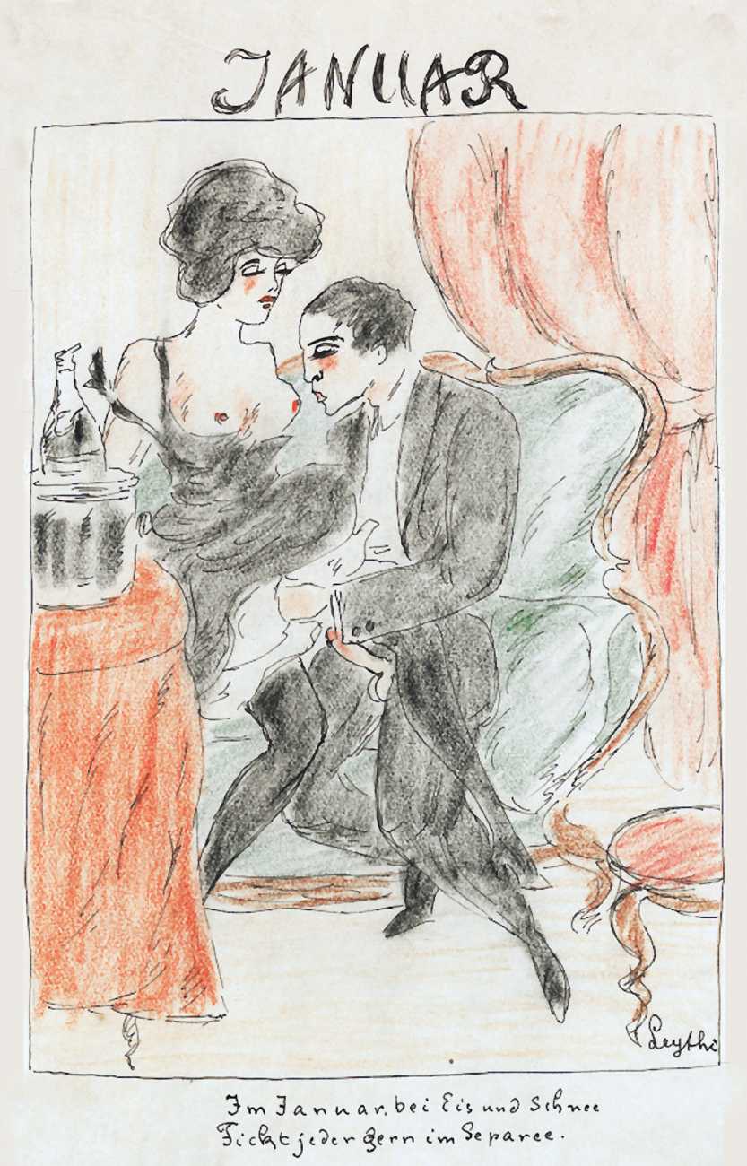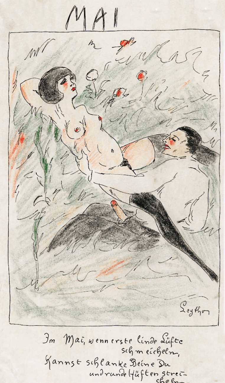 There are a few clues. ‘Mitja’ is a Slovene first name, suggesting an eastern European provenance. The reference to the February Fasching festival in the 1923 Kalender points to a southern German setting, possibly Munich. And there are certain similarities with the equally-mysterious erotic artist ‘E. Bénis’, whose work you can see here – sad-looking men with square chins and slim women with small pointy breasts. As the 1931 Bilderlexicon der Erotik said of Bénis’s output, Leytho managed to produce ‘obscene pictures of great amateurism’, a description which describes much of the erotic illustration of the last hundred years.