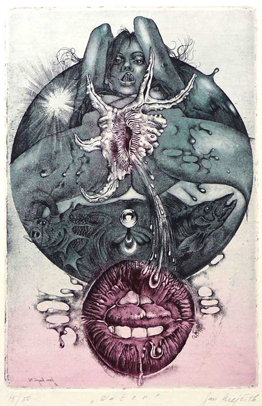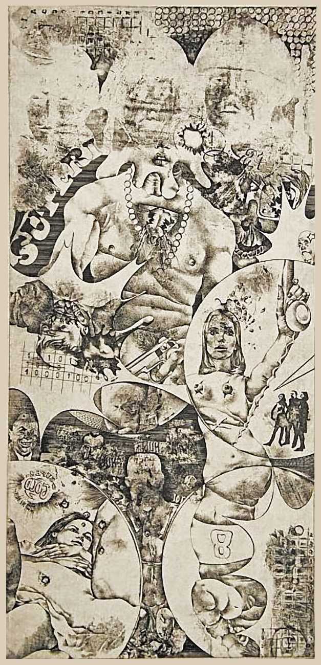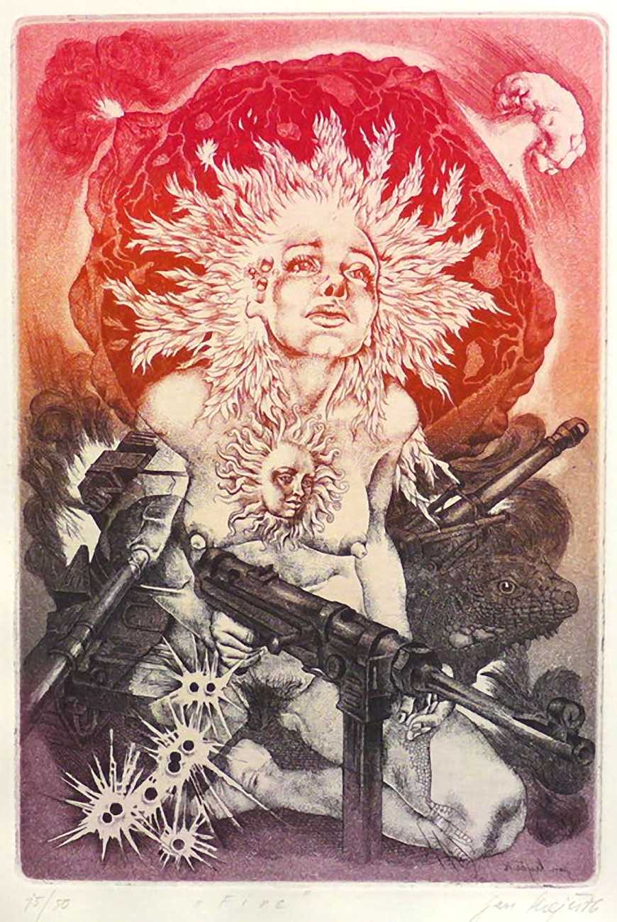 In a graphic cycle created between 1968 to 1971 he included a distorted portrait of Joseph Stalin, perforated five-pointed red stars, and the joyful faces of socialist workers turned into hideous grins. In 1971 he was arrested by the ŠtB (Štátna Bezpečnosť, the State Secret Police), and charged with imprisoned ‘for defamation of the allied socialist states’; eleven of his graphics were identified as ‘ideologically dangerous’ and condemned to destruction. However the prosecutors kept the prints for themselves, tantamount to government-sanctioned theft. As Kulhánek later commented, ‘I realised that one’s situation in life, even if a tragic one, never lacks a touch of humour, though usually very black humour.’ Kulhánek spent a month in prison and was interrogated regularly for next two years, during which time he was prohibited from publishing.