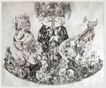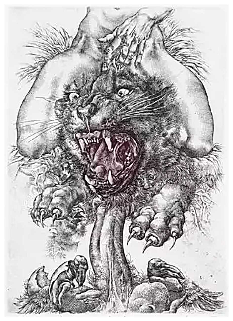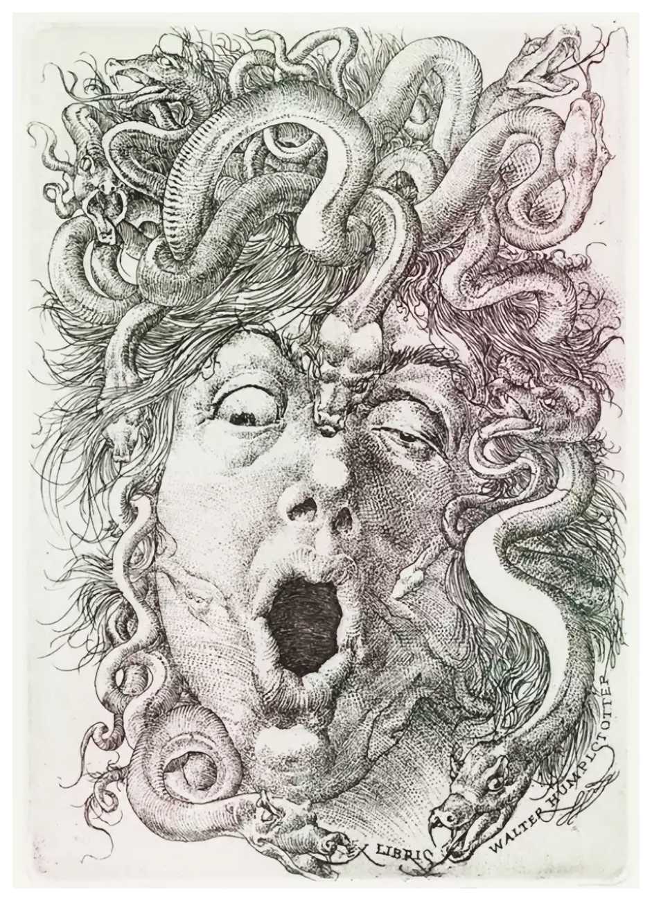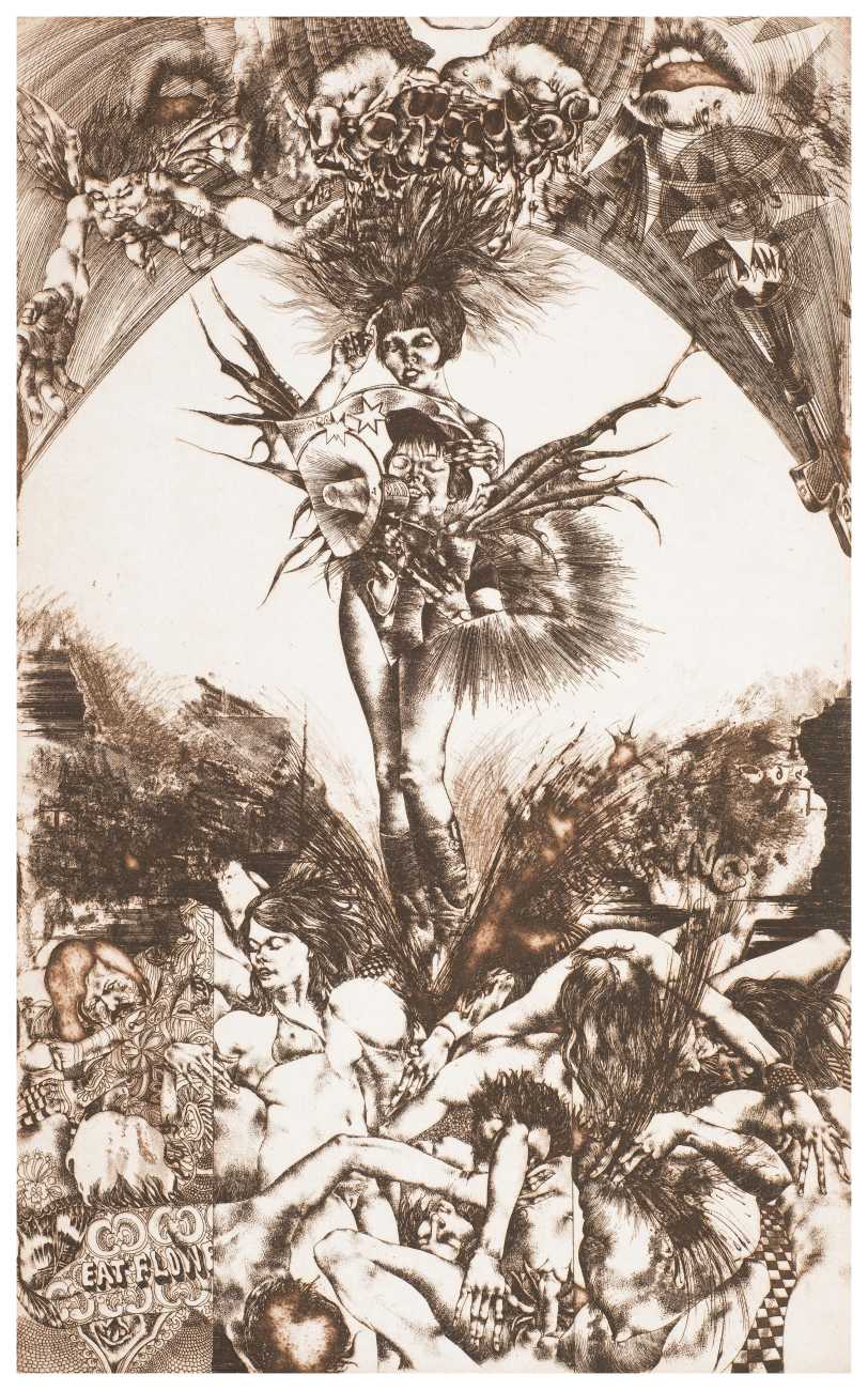 In a graphic cycle created between 1968 to 1971 he included a distorted portrait of Joseph Stalin, perforated five-pointed red stars, and the joyful faces of socialist workers turned into hideous grins. In 1971 he was arrested by the ŠtB (Štátna Bezpečnosť, the State Secret Police), and charged with imprisoned ‘for defamation of the allied socialist states’; eleven of his graphics were identified as ‘ideologically dangerous’ and condemned to destruction. However the prosecutors kept the prints for themselves, tantamount to government-sanctioned theft. As Kulhánek later commented, ‘I realised that one’s situation in life, even if a tragic one, never lacks a touch of humour, though usually very black humour.’ Kulhánek spent a month in prison and was interrogated regularly for next two years, during which time he was prohibited from publishing.
