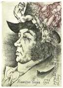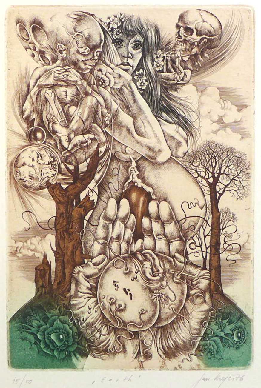 The Czech artist Oldřich Kulhánek is best known in his home country as the designer of his country’s banknotes and postage stamps, which demonstrate his consummate skill as an engraver in a format used in daily life. He was, however, also deeply committed to social and political – and human – freedom. Kulhánek grew up in Prague, and in 1958 started his studies at the Academy of Arts, Architecture and Design, in the atelier of Karel Svolinský. He graduated in 1964, already having illustrated the poetry of Vladimír Holan and Christian Morgenstern.