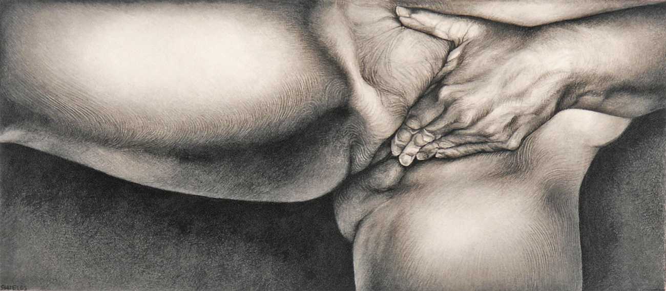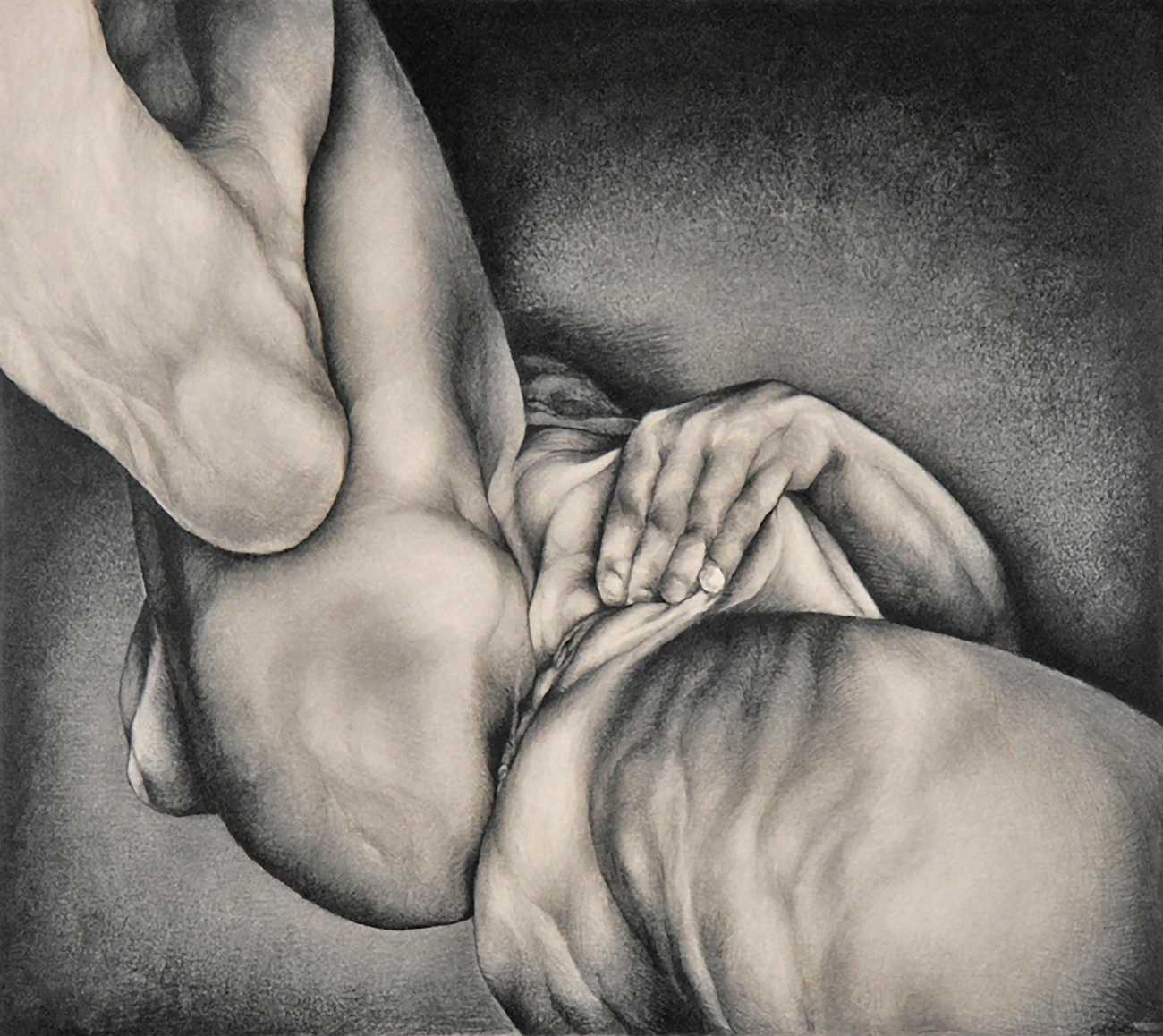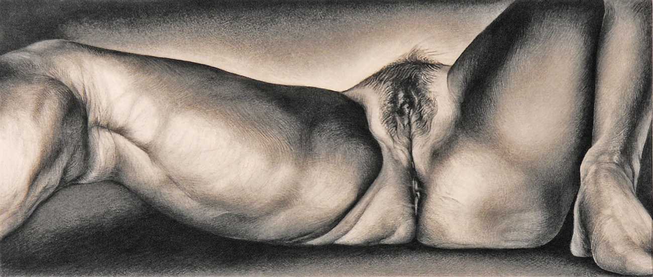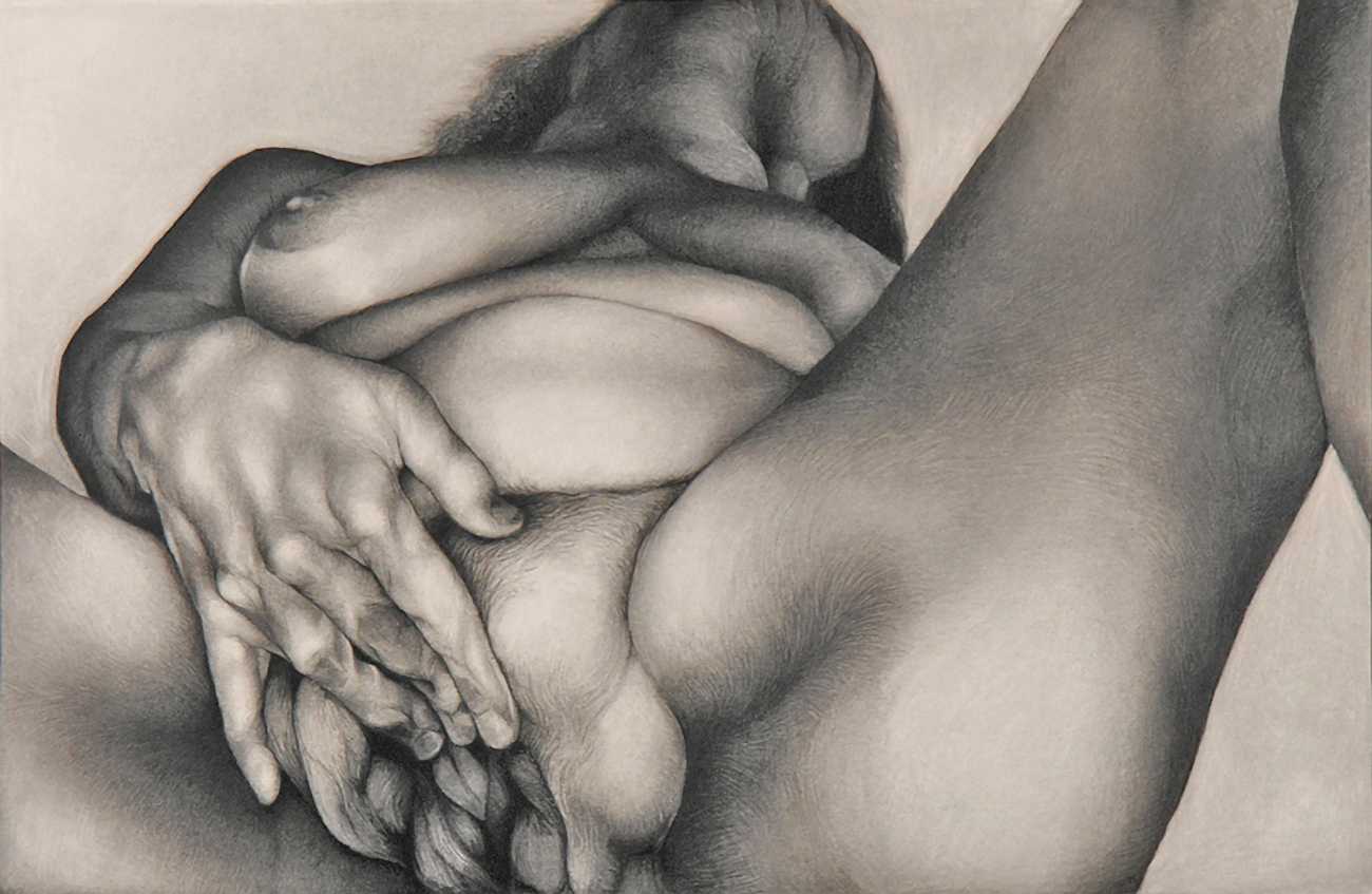 Based in a small town in rural Pennsylvania, Pam Shields is a self-taught figurative artist, who created mostly portraits and landscapes until she turned sixty and recognised that her most important mission was to explore the too-often-hidden world of older female sexuality. She works mainly in charcoal on watercolour paper, slowly applying layer upon layer of charcoal, to create dense, weighty images. After completing the masturbation series One Body in 2014, she decided to extend her practice to include other women.