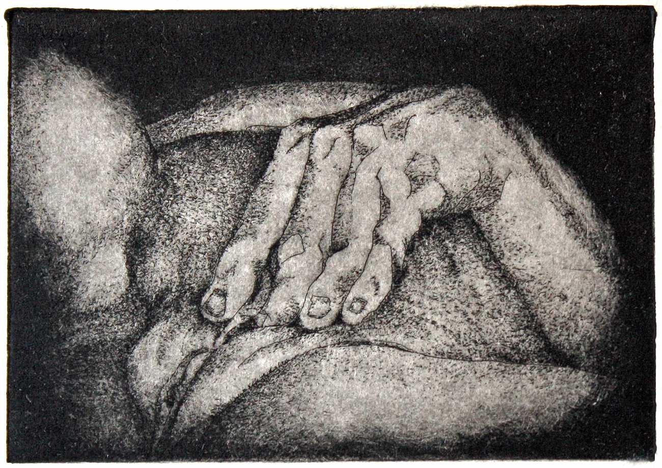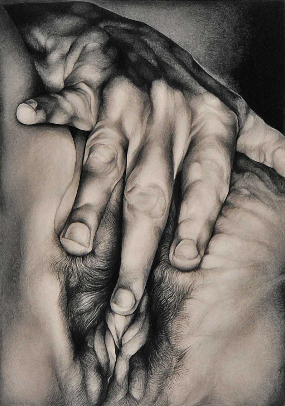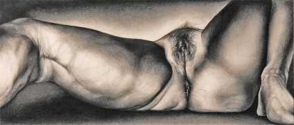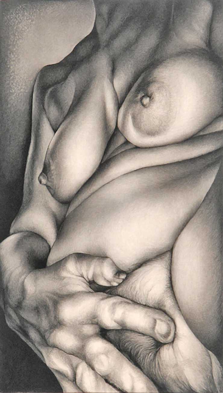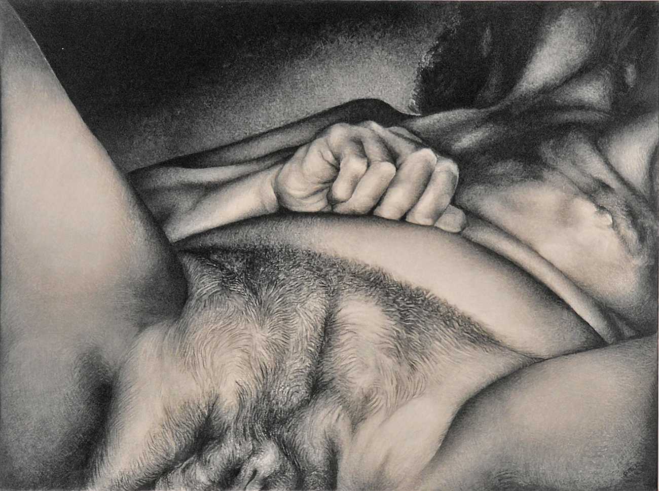 Based in a small town in rural Pennsylvania, Pam Shields is a self-taught figurative artist, who created mostly portraits and landscapes until she turned sixty and recognised that her most important mission was to explore the too-often-hidden world of older female sexuality. She works mainly in charcoal on watercolour paper, slowly applying layer upon layer of charcoal, to create dense, weighty images. After completing the masturbation series One Body in 2014, she decided to extend her practice to include other women.