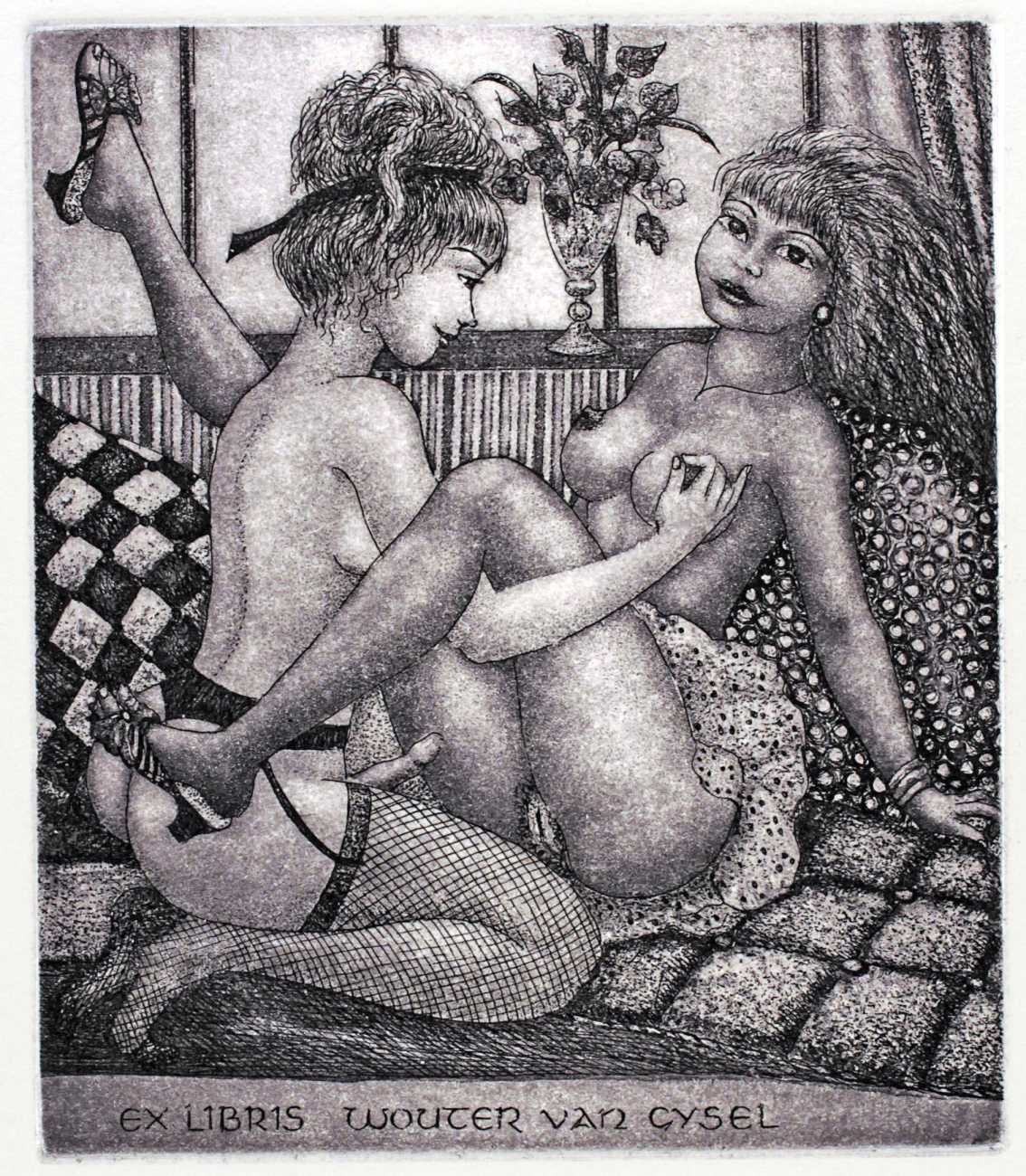 Patricia Nik-Dad, whose family is of Iranian origin, grew up in Croissy-sur-Seine on the western outskirts of Paris. She graduated in drawing, painting and engraving from the Ecole Supérieure des Beaux-Arts in Paris, and subsequently studied at L’Academie Roederer. Nik-Dad specialises in miniature etchings, most often bookplates or ex libris, which almost always feature naked young women in a wide variety of activities, but she has also produced paintings, and in 2010 illustrated Lebanese writer, poet and journalist Joumana Haddad’s autobiographical short story Les amants ne devraient porter que des mocassins (Lovers Should Only Wear Moccasins), about the tangled and contradictory desires that arise for a woman balancing Arab and Western culture during an initiation evening in a Parisian swingers’ club.