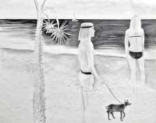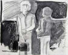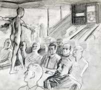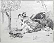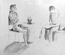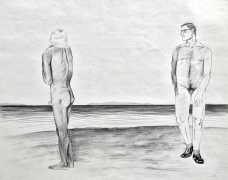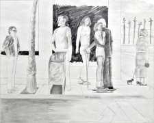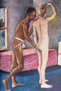 In 1974 a scholarship to the Santa Barbara Art Institute led him to discover the work of David Hockney, but when Angus moved to Hollywood in 1975 he discovered that the good gay life does not exist for poor people, ‘unless, of course they are beautiful’. Believing that he was sexually unattractive, he was hopelessly lonely. He made portraits of friends and acquaintances, and recorded with Hockney-like wit the Los Angeles scene around him, though mostly evading overtly gay subject matter.