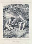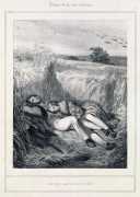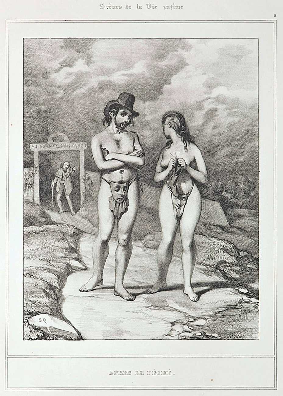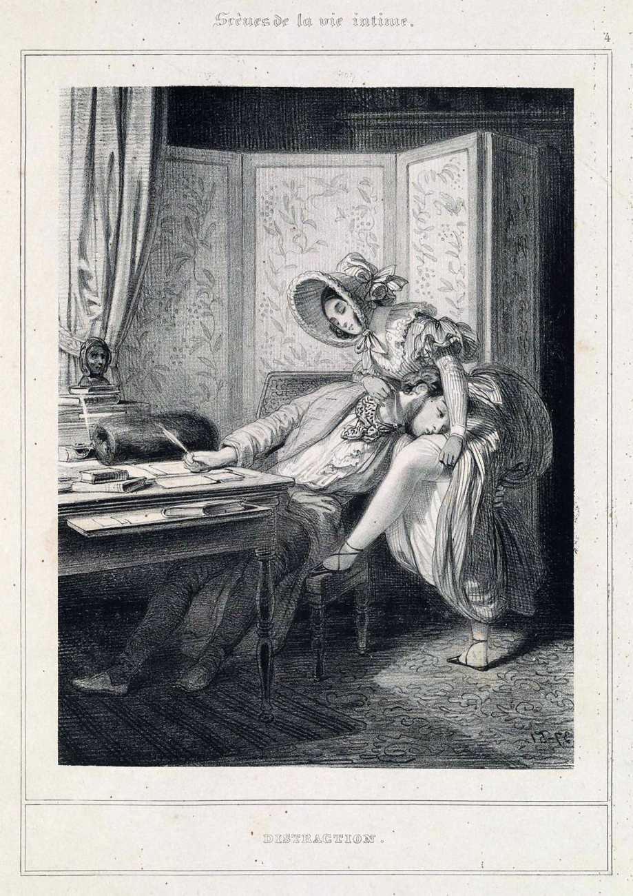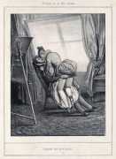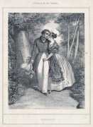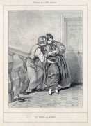 His sharp and witty drawings soon won him a name in fashionable circles. His speciality was sketches in which he portrayed the most striking characteristics, foibles and vices of the various classes of French society; most of his best work appeared in Le Charivari. Soon Gavarni was receiving regular commissions for book illustrations, including Eugene Sue’s Le Juif errant (The Wandering Jew, 1843), a new French translation of Hoffman’s tales (1843), and the first collected edition of Balzac’s works (1850). In addition to his magazine and book contributions, Gavarni produced portfolios of twelve engravings on popular subjects, with short and witty captions; these included Les lorettes (a lorette was a fashionable and liberal-minded young woman), Scènes de la vie intime, Les actrices, Les coulisses (Backstage Scenes), Les fasizionables, Les gentilshommes bourgeois, Les artistes, Les débardeurs (Dockworkers), Les étudiants de Paris, Les baliverneries parisiennes (Parisian Foibles), Les plaisirs champêtres (Rural Pleasures), Les bals masqués, Le carnaval, and La vie des jeunes hommes.