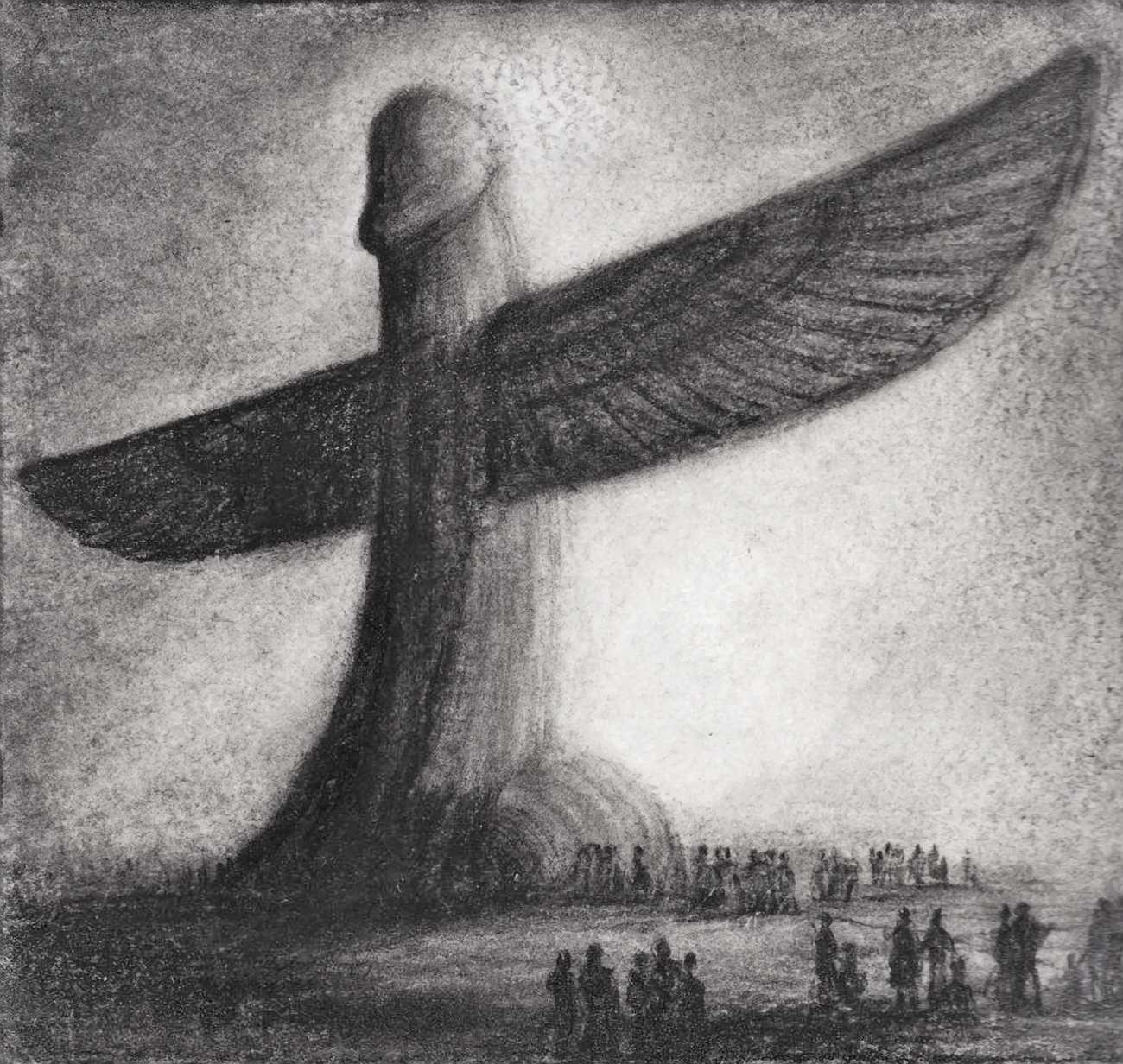 This is the tradition to which my work belongs, and when I am drawing I am aware of making connections with every strand of this tradition. The use of fantastic metaphor and poetic allusion allows me great freedom, to portray any idea from the exterior political to the interior psychological. And the materials I work with give me freedom; charcoal is very flexible, and can be wiped, erased, sandpapered and redrawn. It is open to chance effects that can lead to unanticipated directions and solutions. I make constant revisions and alterations. Even with a medium like pen and ink which would favour the permanent, spontaneous, linear mark, I have even found a way, by using sandpaper on card, of reworking whole sections, to end up with the textures, tones and atmospherics I am looking for.