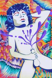 His trademark style is working in bright colours in solid blocks, geometric shapes and repeating patterns, mainly representing human figures. His favourite themes reveal human passions, with a particular emphasis on love, sex and food.