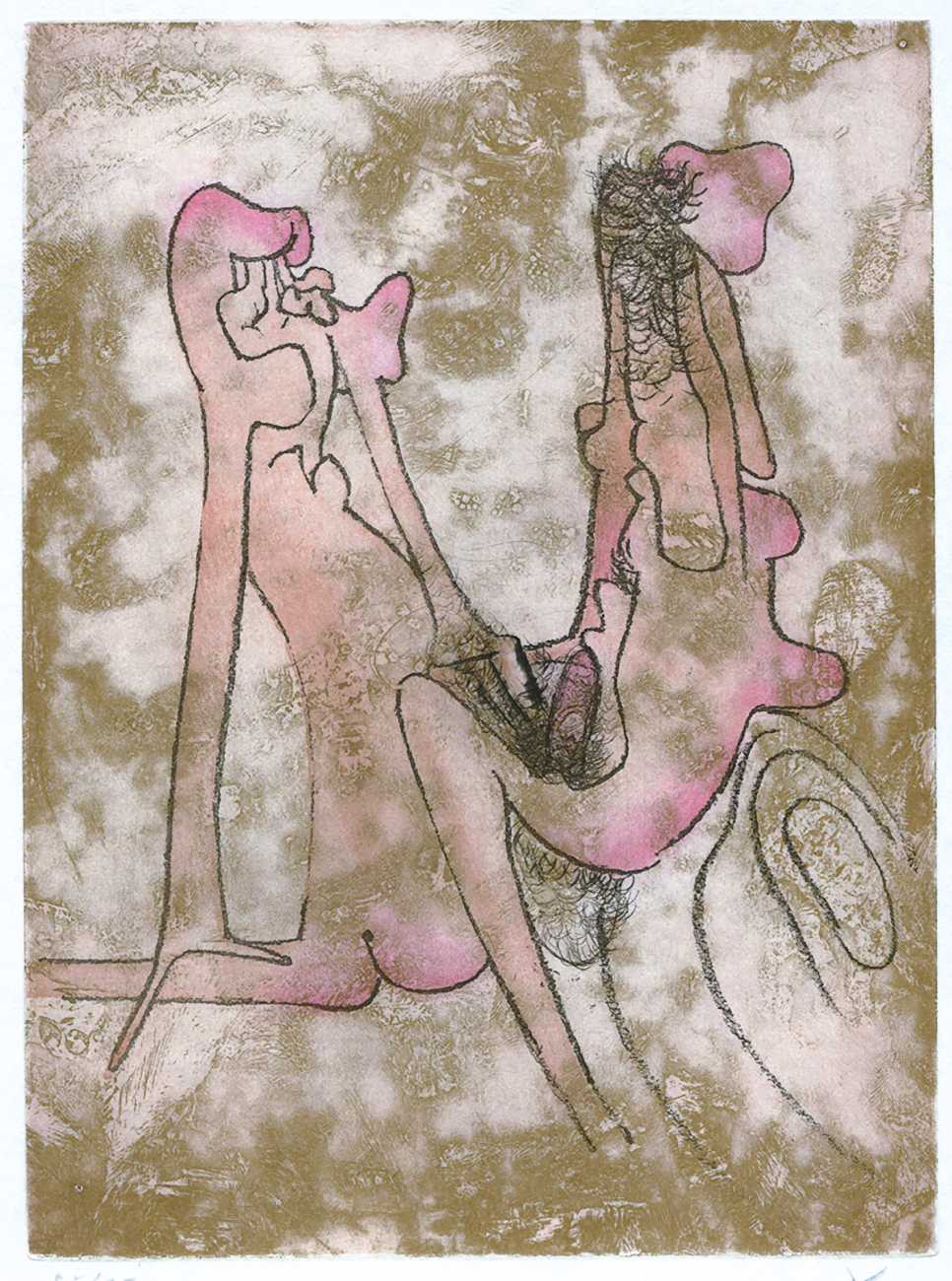 Breton was impressed enough to buy several of Matta’s drawings, and in 1937 invited him to join the Surrealist group, which led to his participation in the 1939 International Surrealist Exhibition in Paris. Influenced by his association with the Surrealists, Matta began to develop his own visual language and, with his early works, the Inscape series and the Psychological Morphologies, which explored themes of cosmic creation and destruction. The outbreak of war in 1939 drove Matta into exile in New York. Alongside Max Ernst, he began working with Art of the Century, Peggy Guggenheim’s influential gallery, where he exerted a strong influence on the emerging abstract expressionist painters. During the 1940s, Matta’s work featured machine-like and invertebrate shapes interacting in a dynamically charged cosmic space. In 1948 Matta returned to Europe and parted from the Surrealist group. He went first to Rome before settling in Paris in 1954. During the 1960s and 1970s Matta travelled extensively in Africa and South America, his paintings acquiring a new fluidity and a more controlled palette.