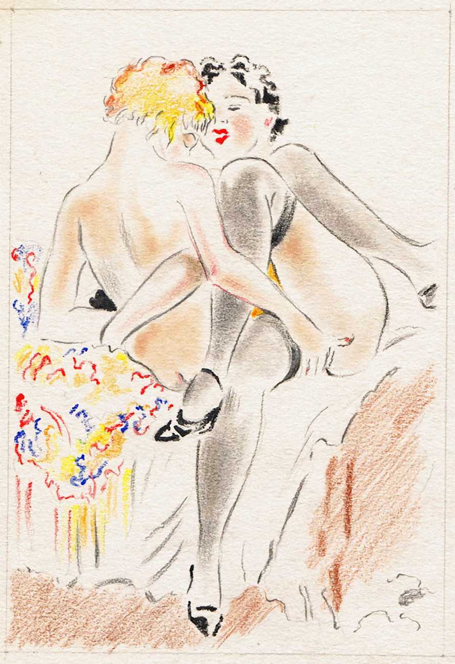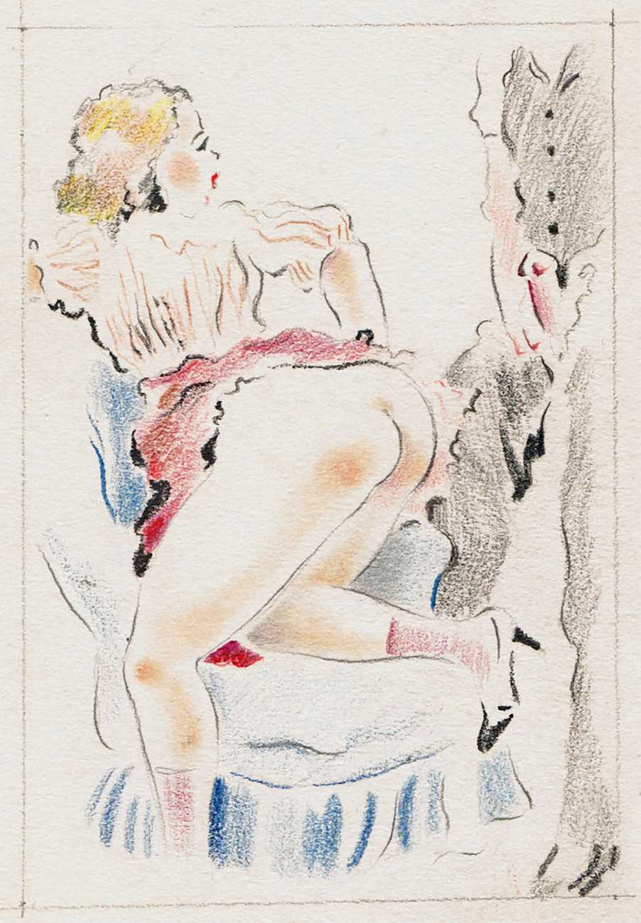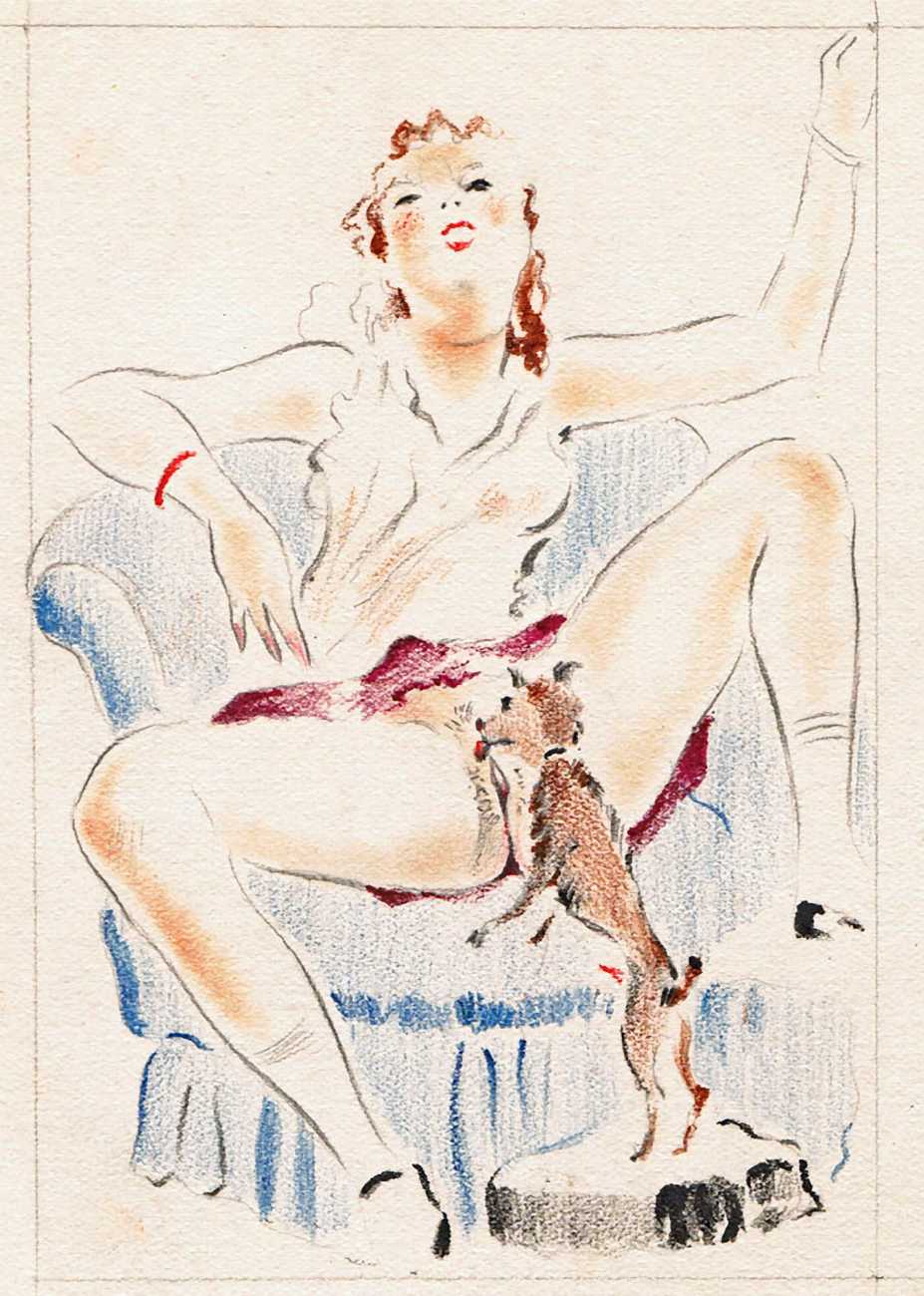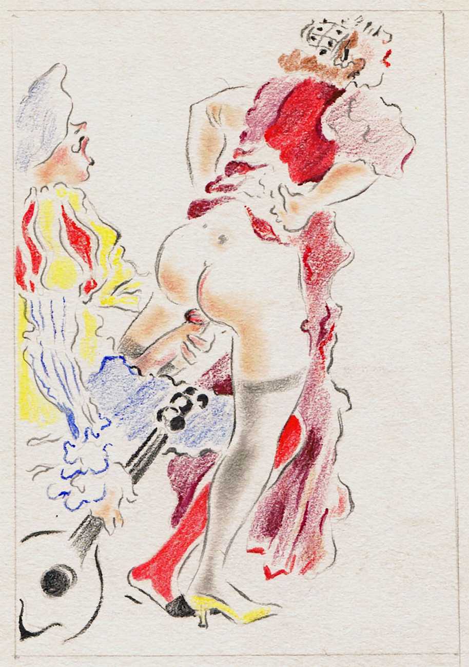 Rojankovski’s life neatly divides into three periods, the Russia/Poland years up until 1925; the Paris period from 1925 to 1941; and the rest of his life in America. All were characterised by an incredible productivity, and each contributed to his distinctive, brightly-coloured, spirited and stylish art. Here we concentrate on the erotic portfolios of his Paris years, though the list of works below shows that Rojan (the shortened version of his name he adopted when he arrived in France) was still producing some erotica after his wartime exodus to the USA.