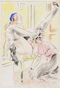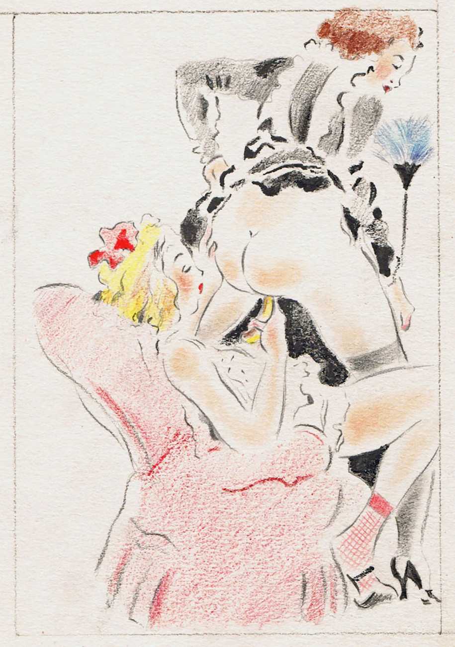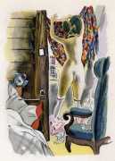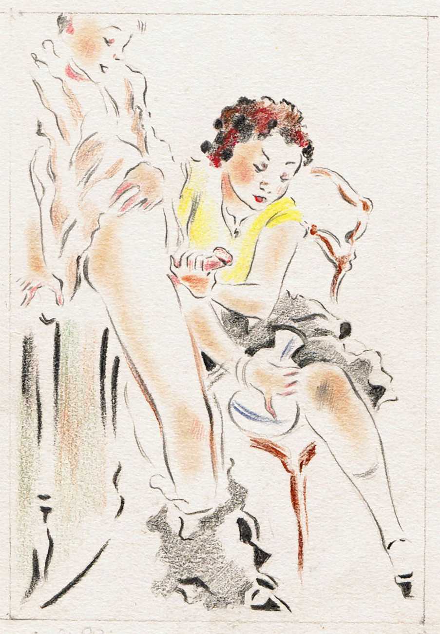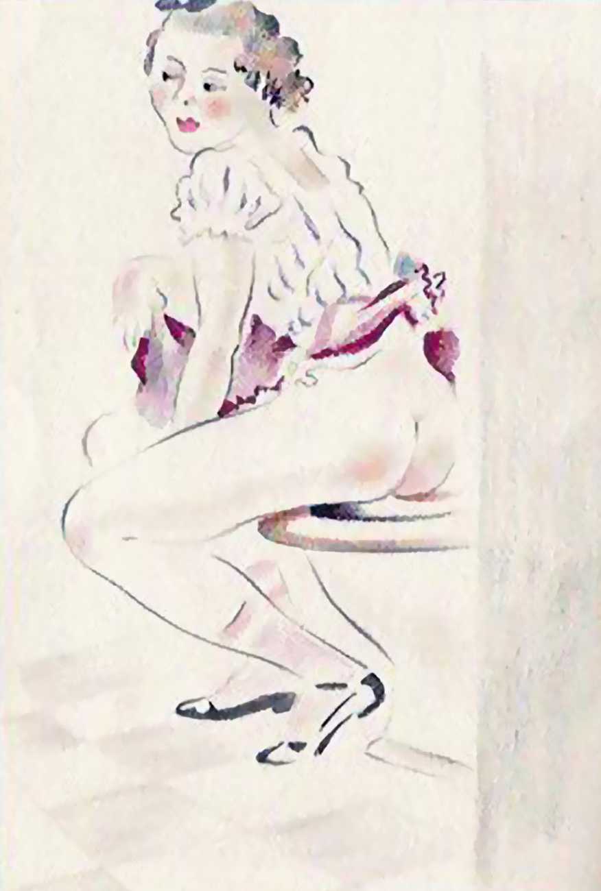 Rojankovski’s life neatly divides into three periods, the Russia/Poland years up until 1925; the Paris period from 1925 to 1941; and the rest of his life in America. All were characterised by an incredible productivity, and each contributed to his distinctive, brightly-coloured, spirited and stylish art. Here we concentrate on the erotic portfolios of his Paris years, though the list of works below shows that Rojan (the shortened version of his name he adopted when he arrived in France) was still producing some erotica after his wartime exodus to the USA.