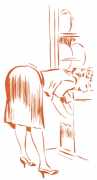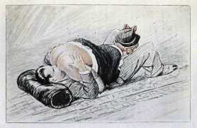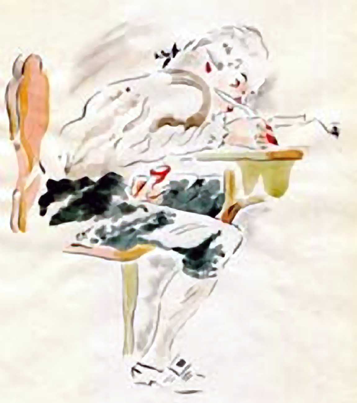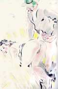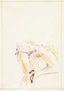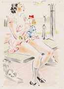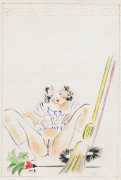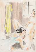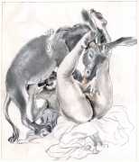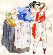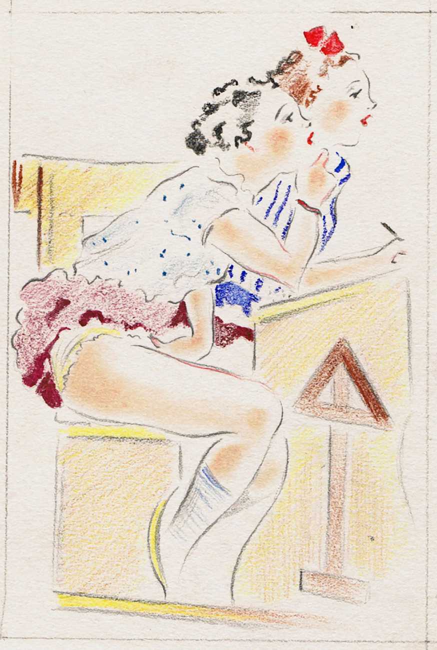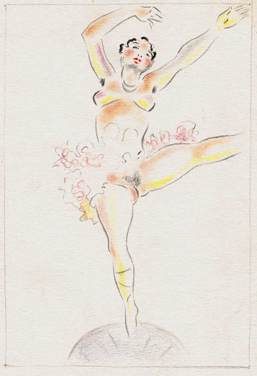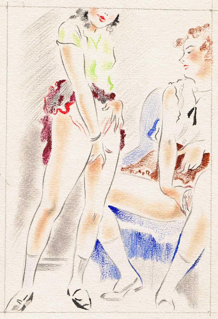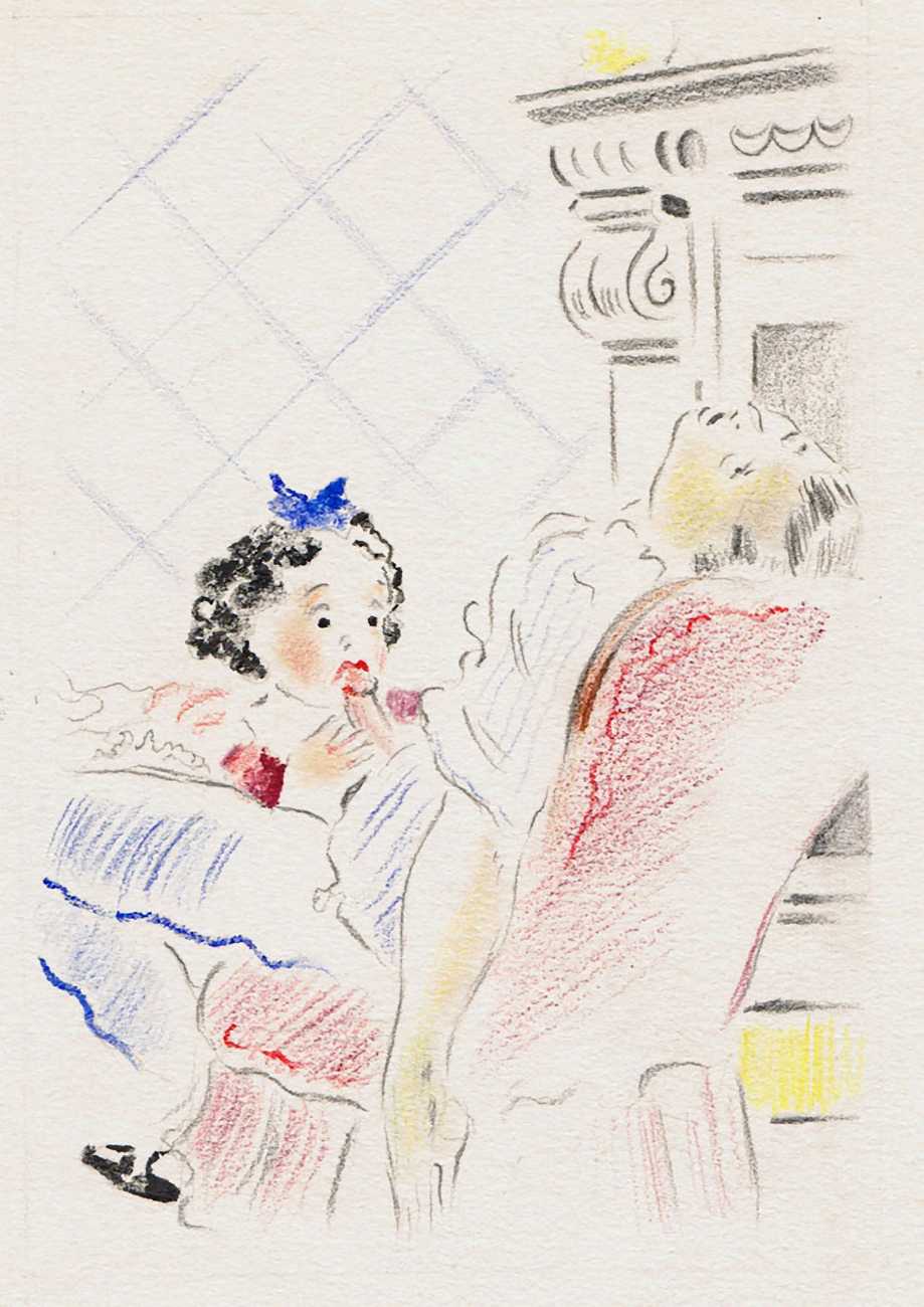 One of Rojankovsky’s favourite models in Paris was Anastasia (Nastenka) Minsekova, a young ballet student of Russian background who in the 1950s became a published illustrator. For several sketches and watercolours in the late 1930s, Rojankovsky drew Nastenka, Degas-like in a tutu, usually standing and viewed from the rear, and sometimes spied in informal moments.