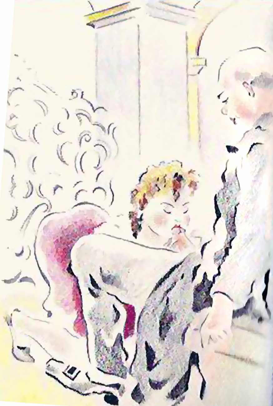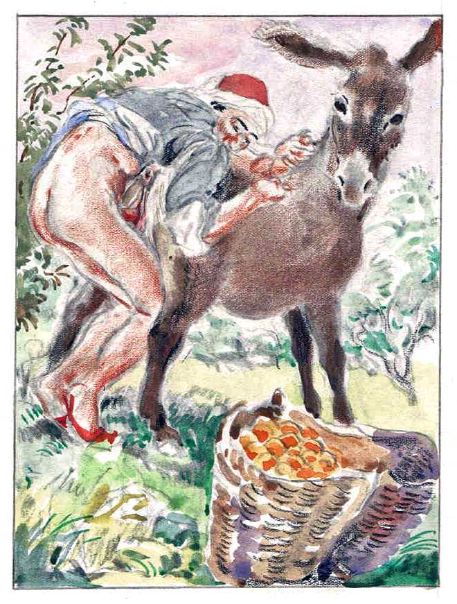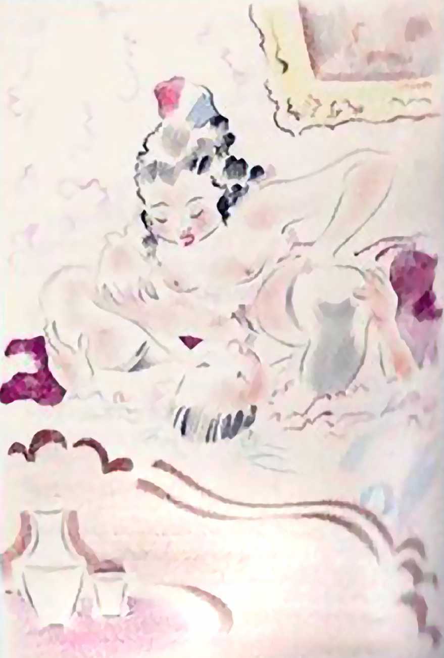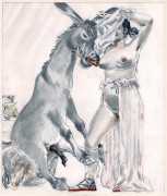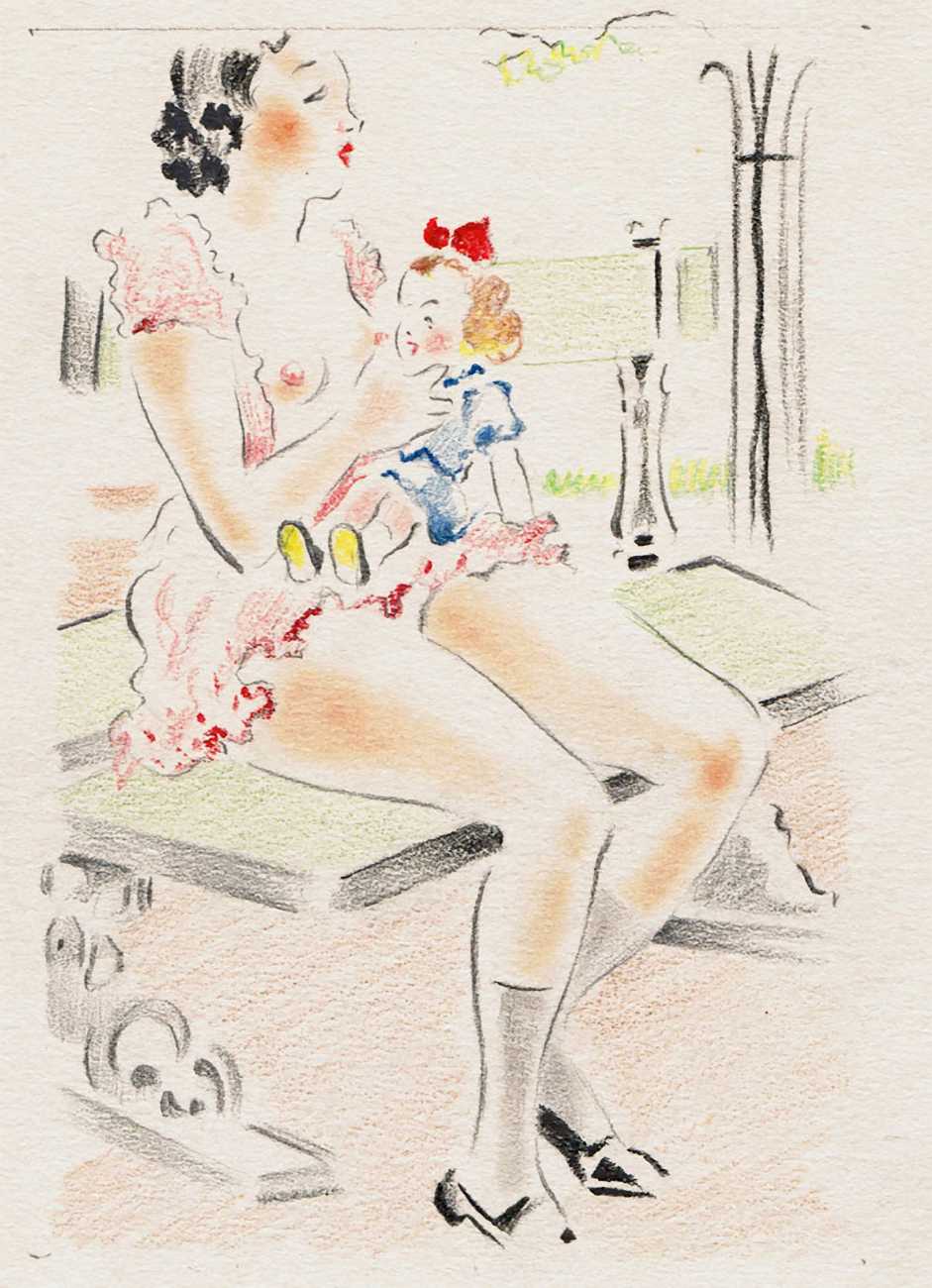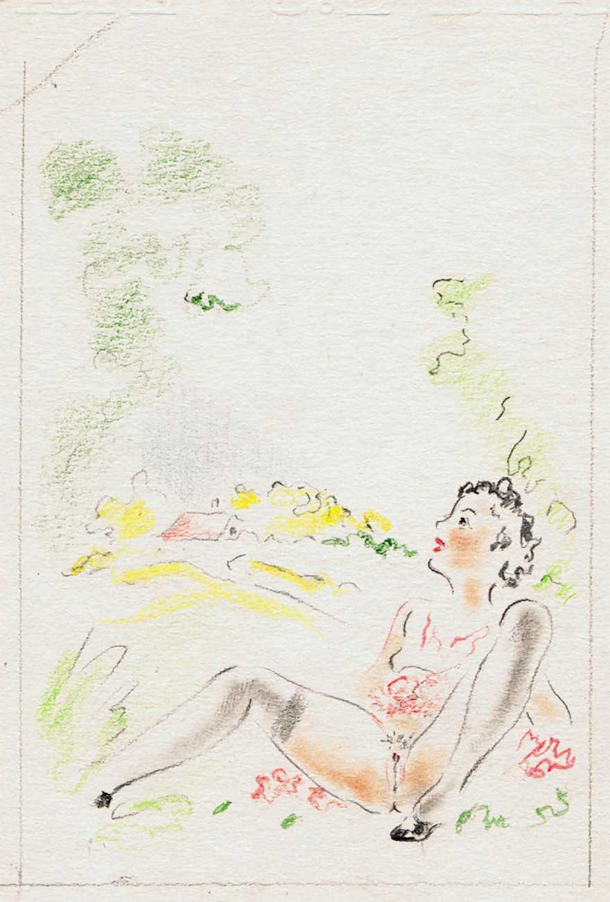 In 1930 Rojankovsky and a friend from his time in the Ukraine after the Revolution, the Russian sculptor Lev Schultz, took a trip to Algiers. Rojankovsky kept snapshots of himself and Schultz in a local park with a pretty algérienne model, she obligingly in native costume. It was surely she who posed in a harem outfit, bare-breasted, baggy pantaloons and all, for Rojan to paint; he reworked one such figure study for Béranger’s Chansons galantes.