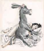 While it is true that many readers will remember Rojankovsky as the kindly children’s storytelling beaver Père Castor, and author of many of the Little Golden Books of the 1950s, published so successfully by Simon & Schuster that first print runs of 500,000 copies were common, that was not where he started his career, and not what those who know Rojan best for his trademark ‘naughty’ work are most familiar with. Downplaying those formative years in Paris is to overlook how his prodigious talent and experience were nurtured and honed. To be fair to the Irvings, they do say ‘This small and generally amusing body of work has long been known, valued, and collected; Rojankovsky lavished his best draftsmanship and colour work on these illustrations and they are among his most accomplished work.’