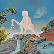 Her works deal with animality, the recurrent themes that often feature questioning our relationship with excess, loss of control, bestiality, male-female dynamics, domination and submission. She is fascinated by the fine line that exists between fear and desire, and how closely they are interrelated. Her subjects inhabit alluring, exotic landscapes filled with trees and wildlife, and are often depicted within the same plane as the flora and fauna. As Khatibi explains, ‘No matter how much society tries to cover it up, no matter how polite and educated we act, our impulses remain primitive.’