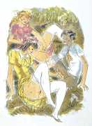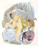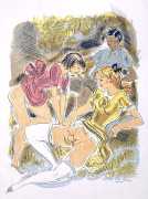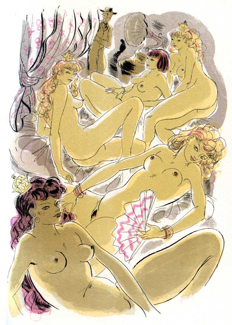 Among the mildly erotic titles illustrated by Schem are D.H. Lawrence’s Lady Chatterley (the French title for Lady Chatterley’s Lover), Le grant testament de Françoys Villon, Theophile Gautier’s Fortunio, and Paul Verlaine’s poetry. Apart from an edition of Pierre Louÿs’ Manuel de civilité, which may or may not be his work, we have only included here his illustrations for the 1936 L’histoire de Jérôme, the 1946 Le désir, the 1948 Petites cousines, Louÿs’ Roi Pausole, and Brantôme’s Les dames galantes, as his illustrations, while accomplished, tend to be very similar in style and rather characterless.