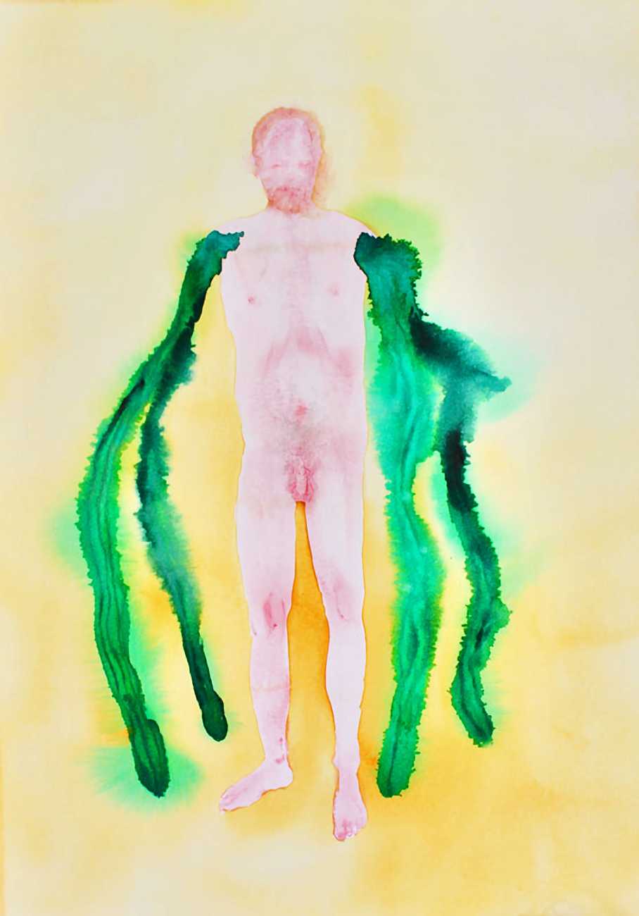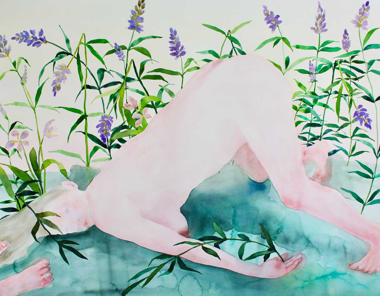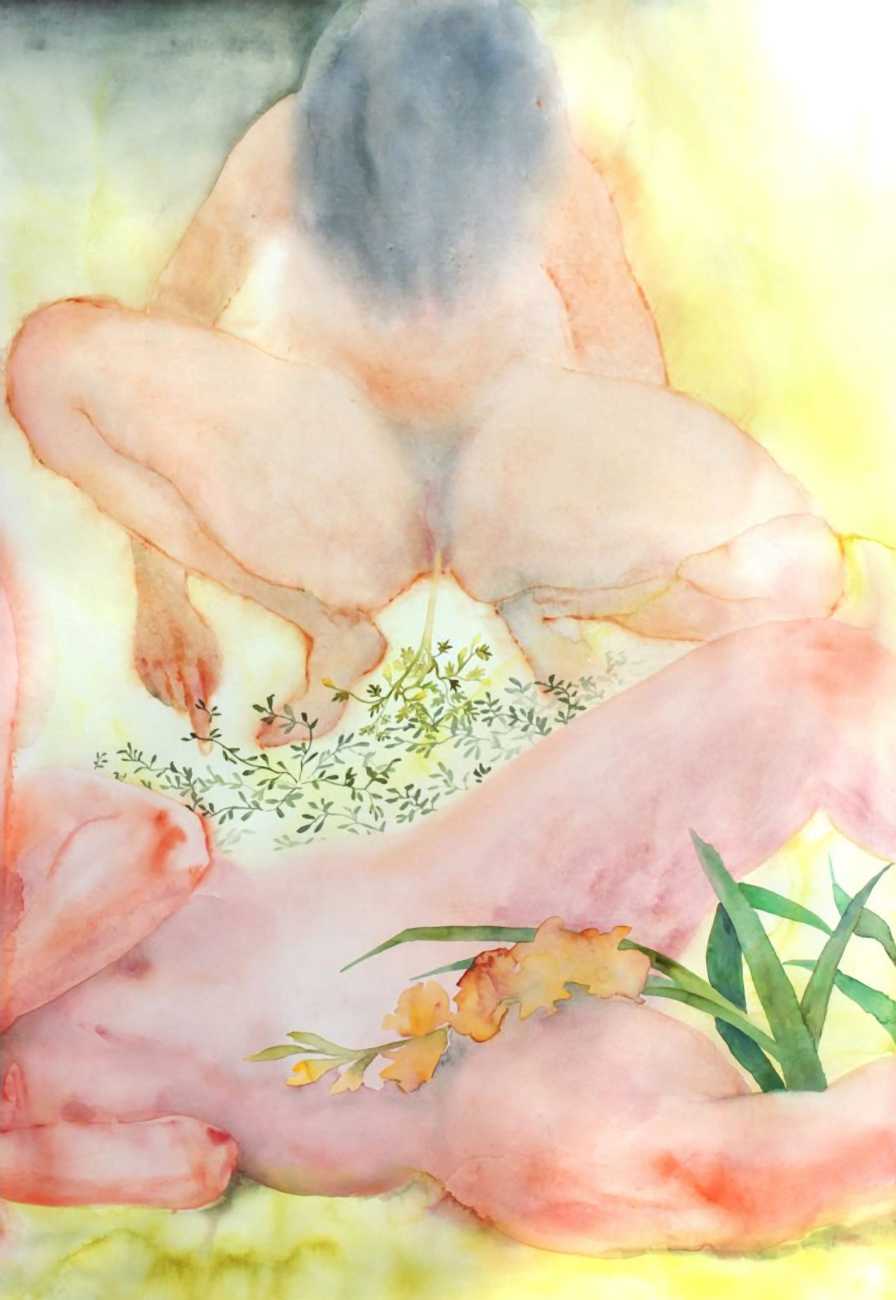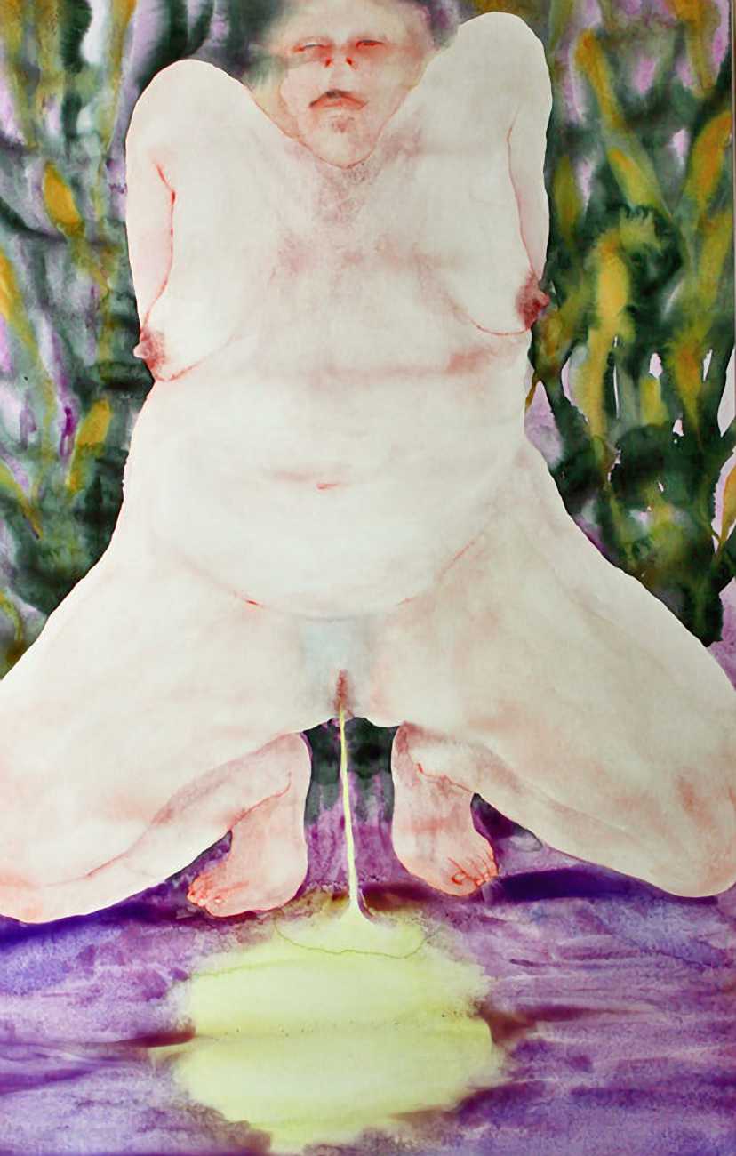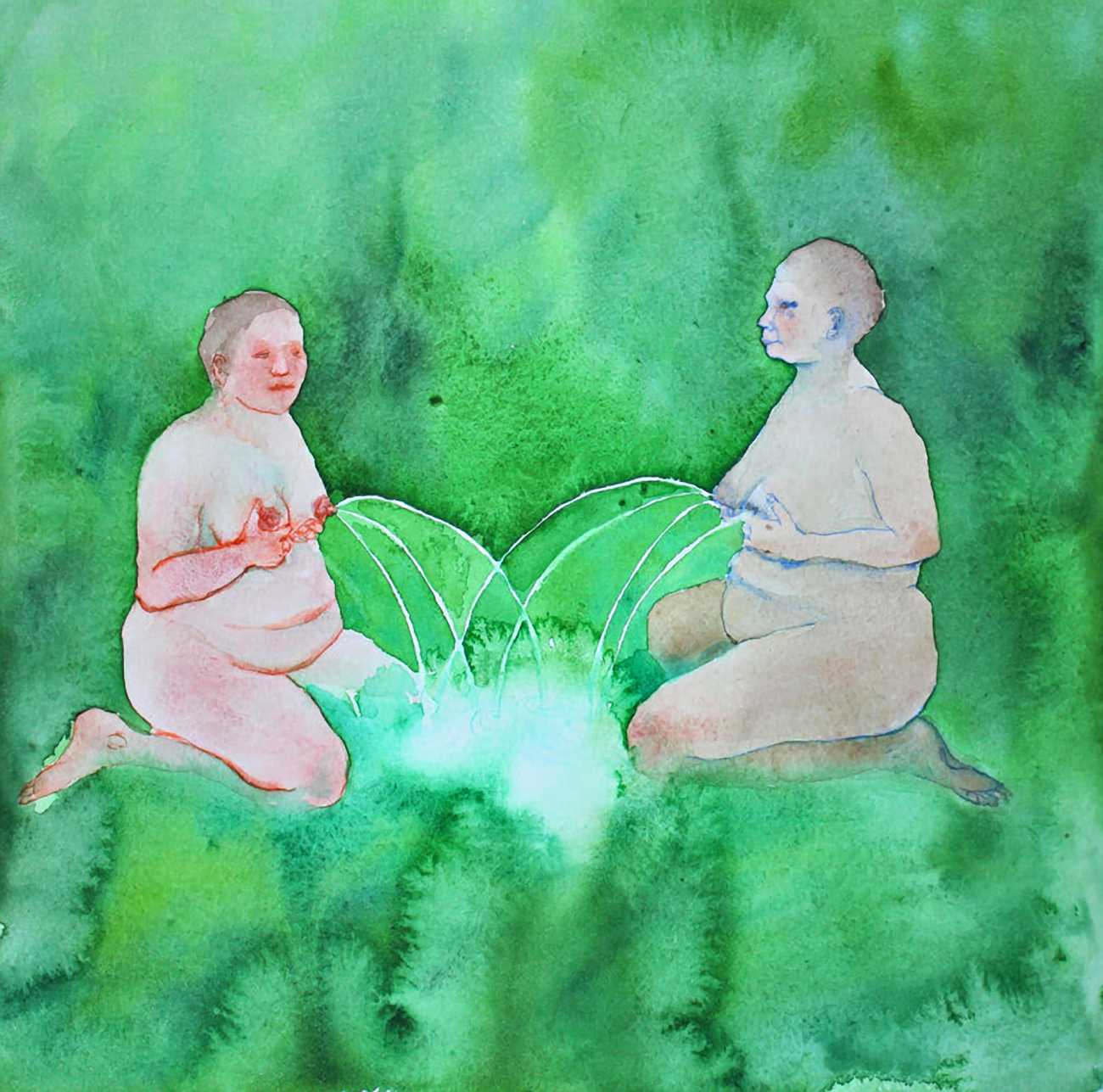 The majority of her watercolours include naked bodies, sometimes interacting with each other but more often in relationship with the natural world. Her subjects’ pale bodies relate intimately with plants and water, and she has a particular interest in pissing in the open air, which as she says ‘is a beautiful moment where the body is connected to nature. When you piss outside, your fluids are simultaneously in your body and on the ground.’