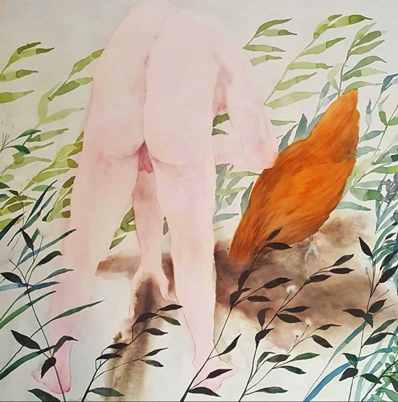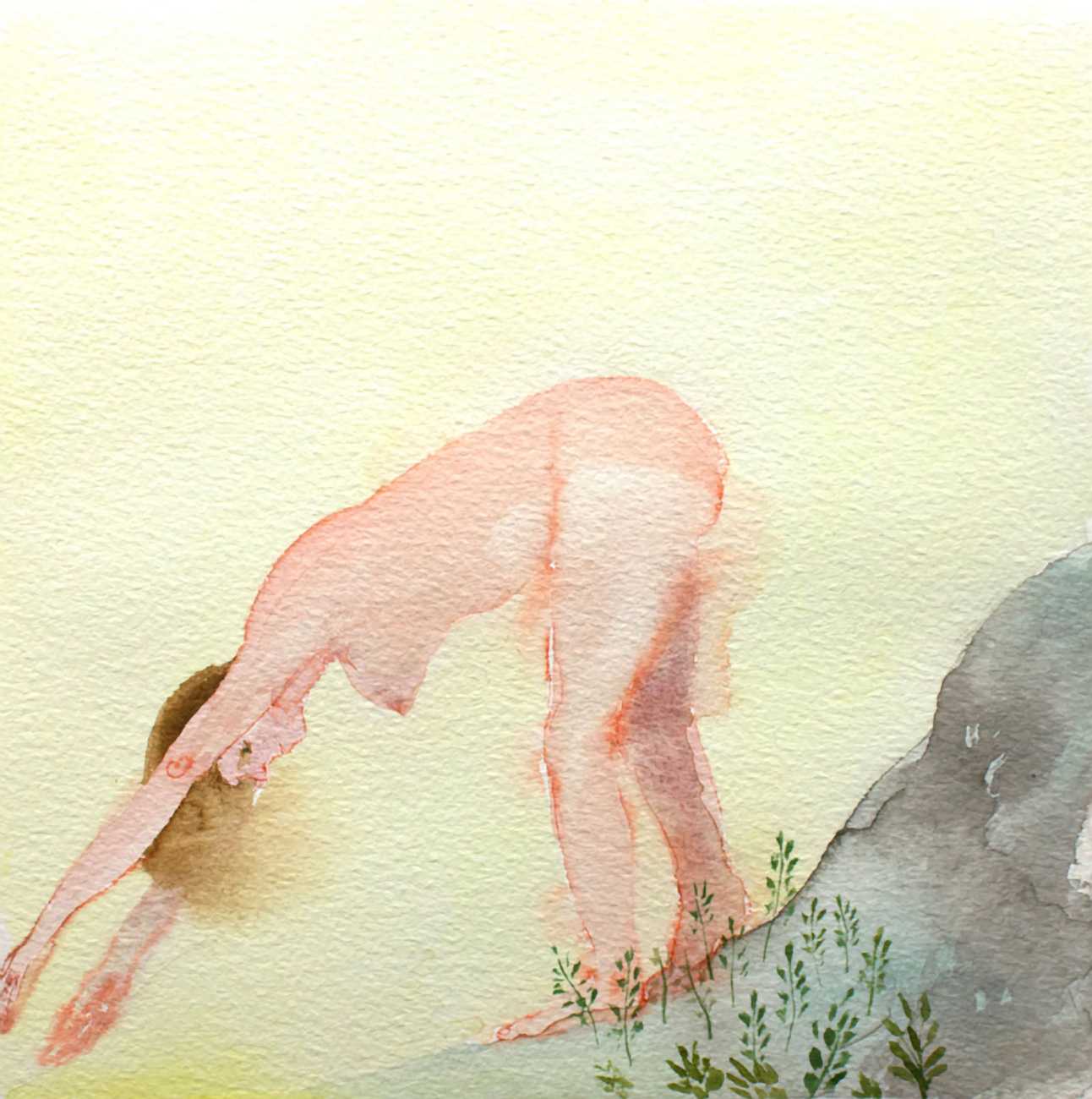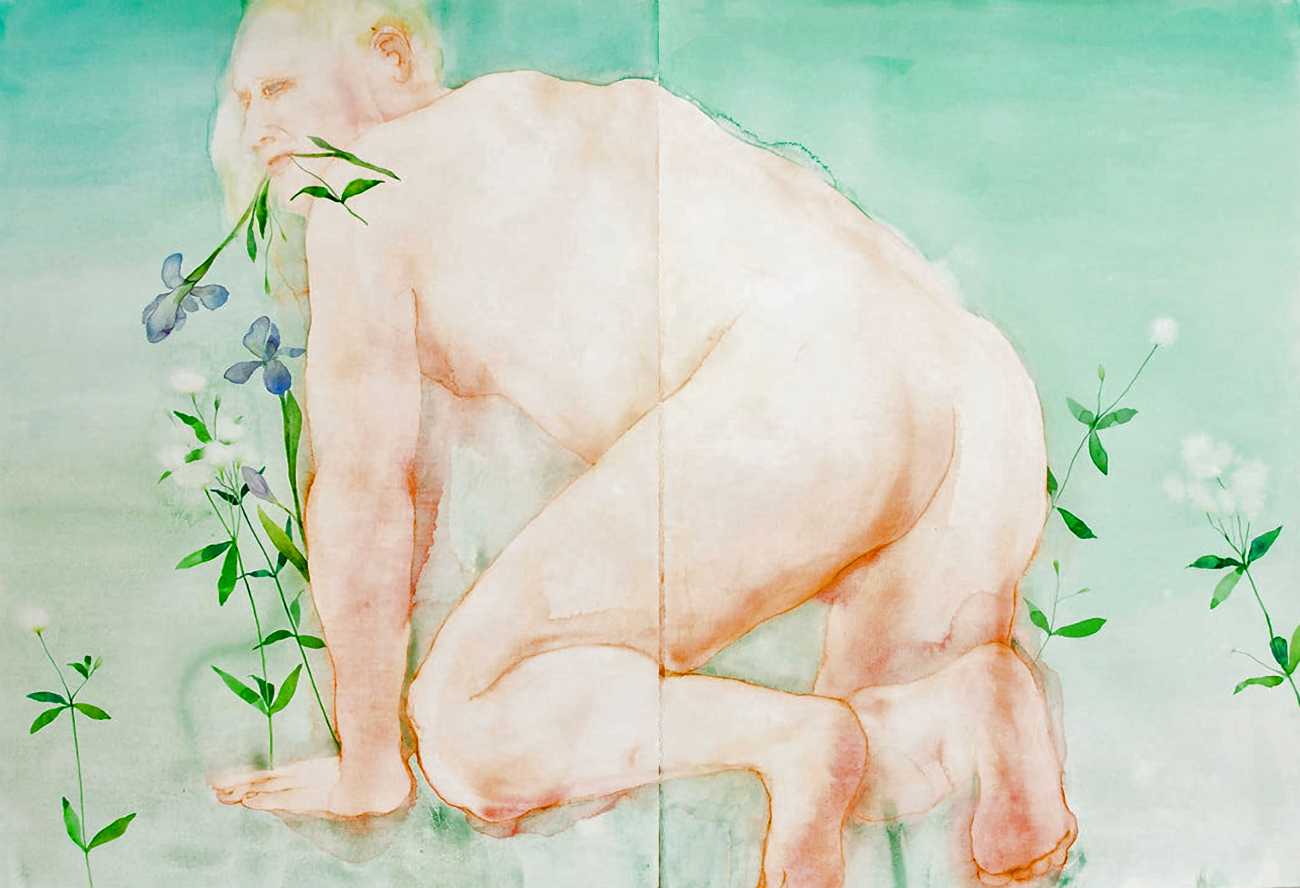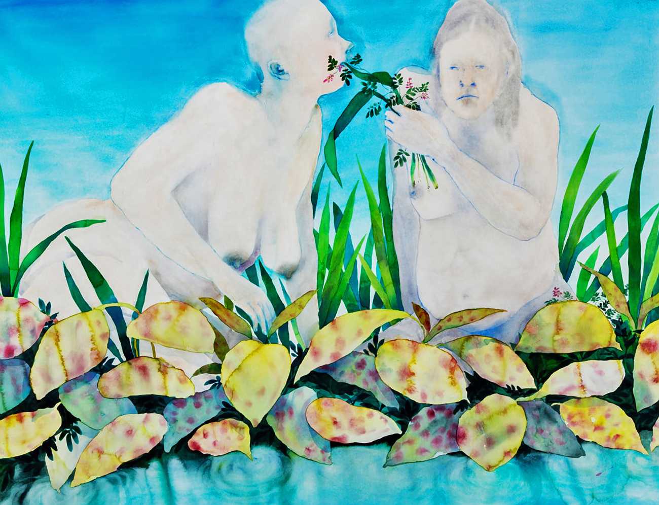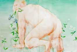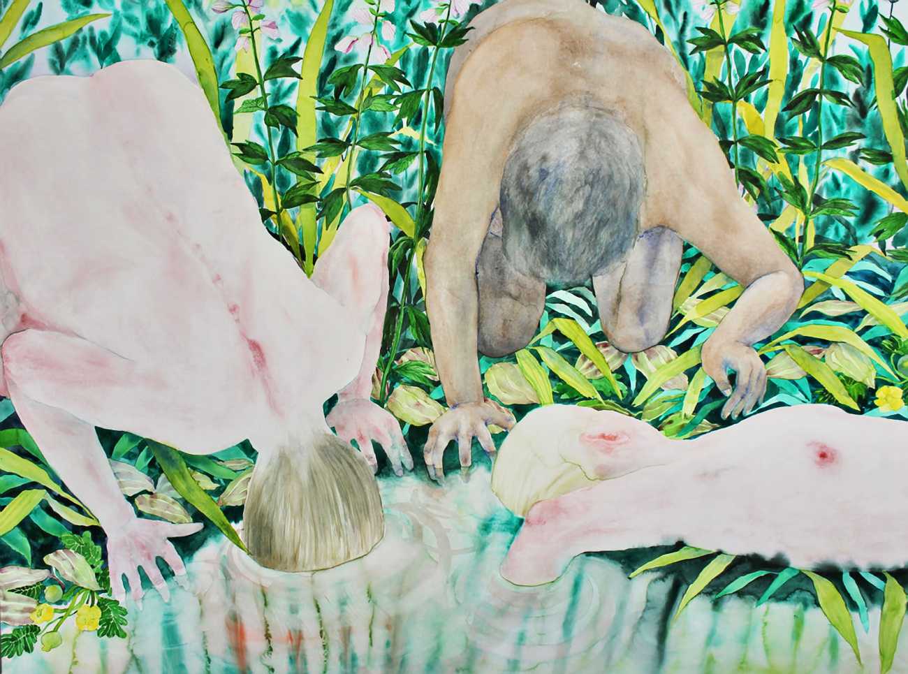 The majority of her watercolours include naked bodies, sometimes interacting with each other but more often in relationship with the natural world. Her subjects’ pale bodies relate intimately with plants and water, and she has a particular interest in pissing in the open air, which as she says ‘is a beautiful moment where the body is connected to nature. When you piss outside, your fluids are simultaneously in your body and on the ground.’