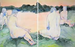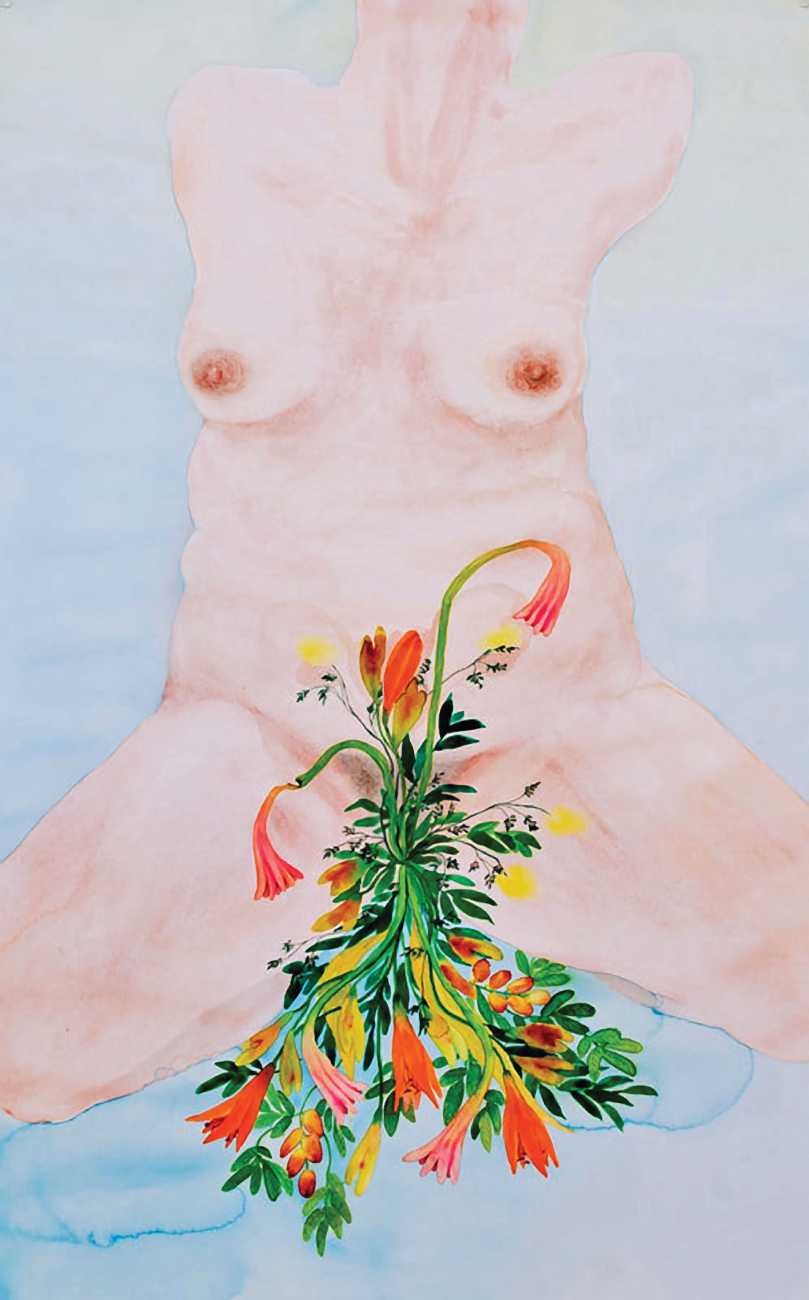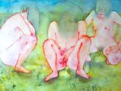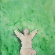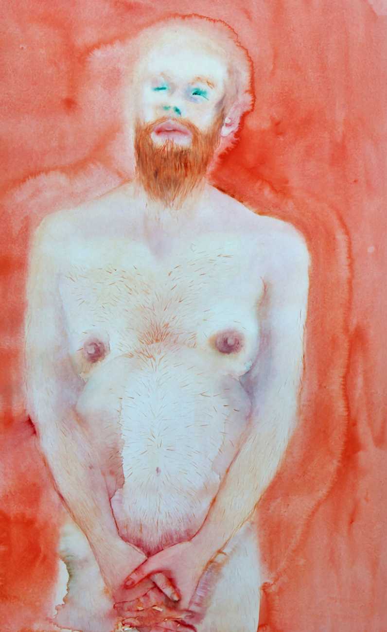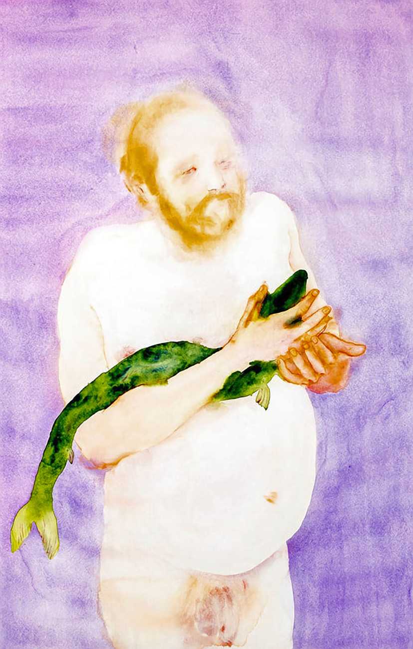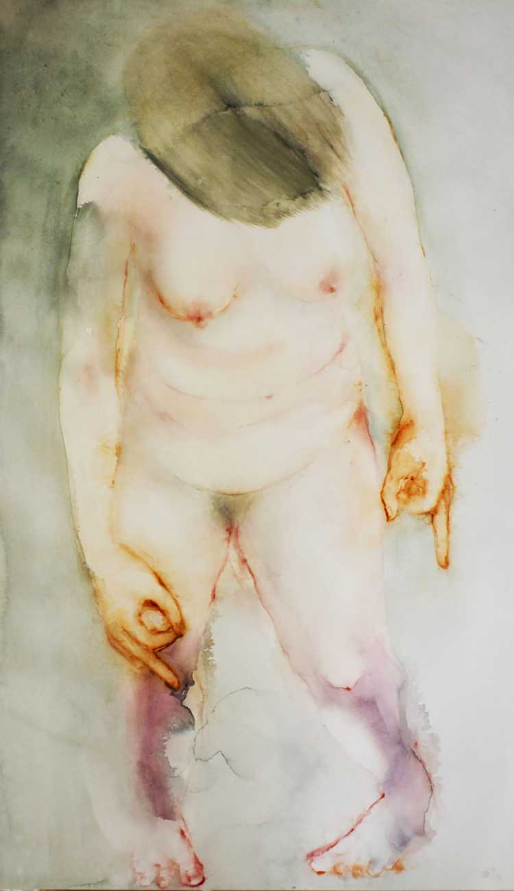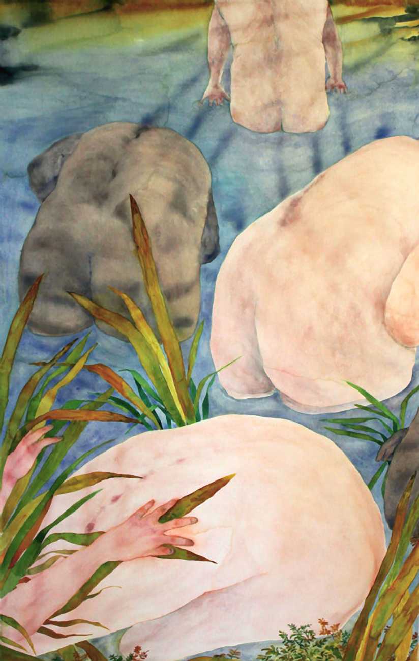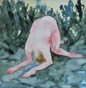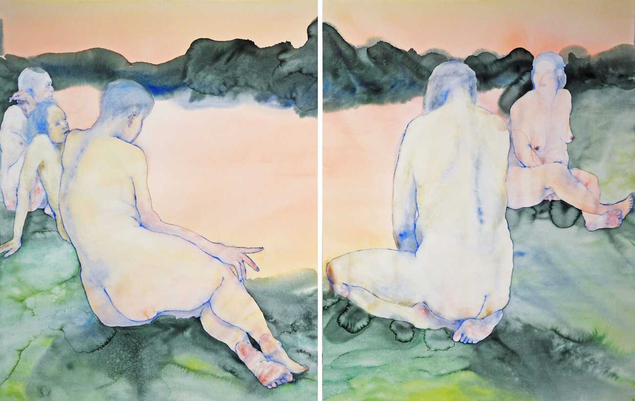The majority of her watercolours include naked bodies, sometimes interacting with each other but more often in relationship with the natural world. Her subjects’ pale bodies relate intimately with plants and water, and she has a particular interest in pissing in the open air, which as she says ‘is a beautiful moment where the body is connected to nature. When you piss outside, your fluids are simultaneously in your body and on the ground.’