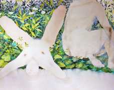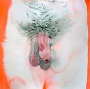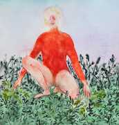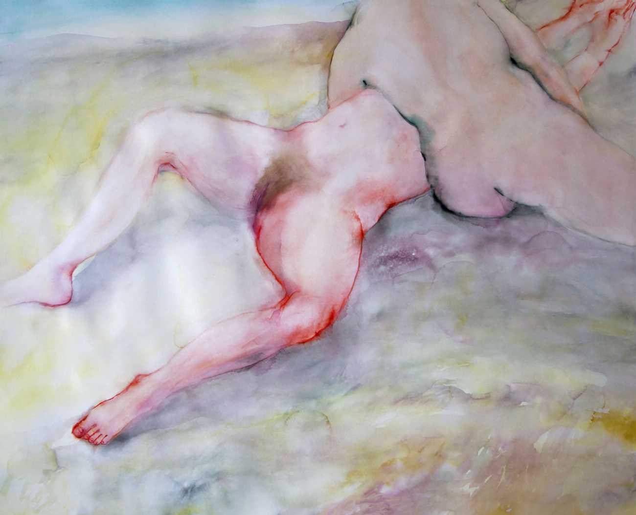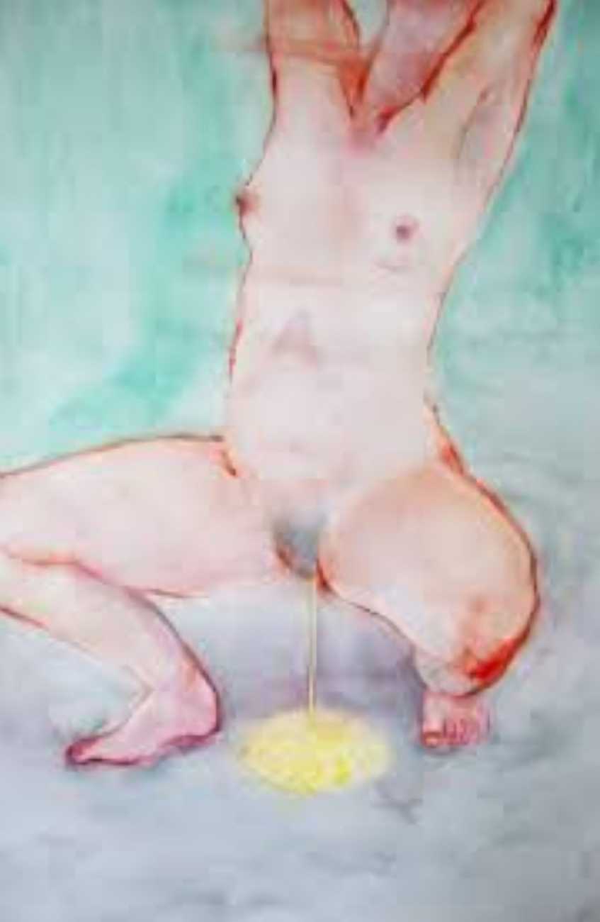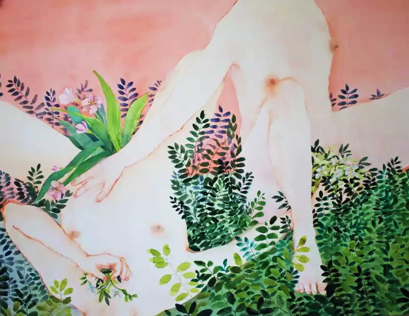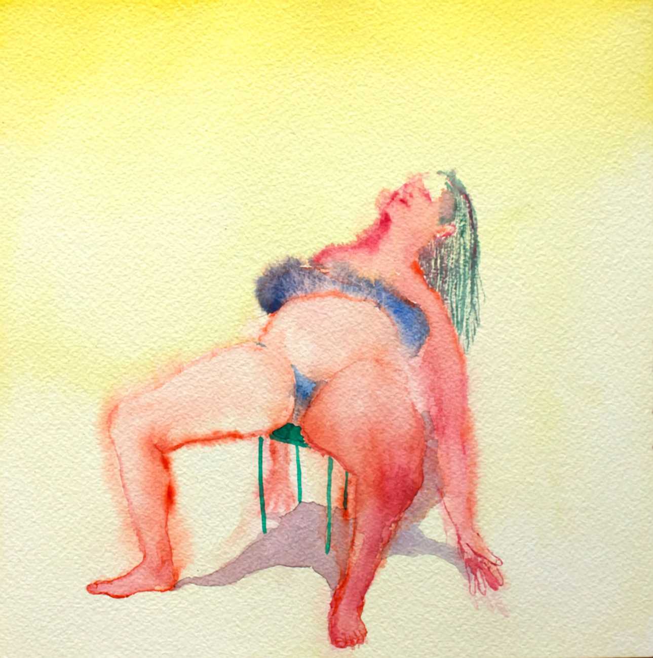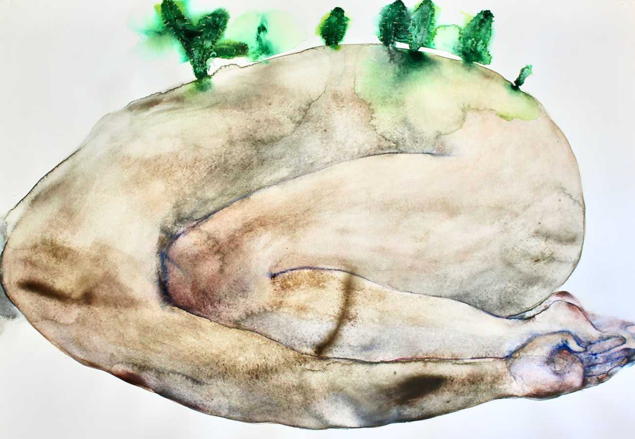 The majority of her watercolours include naked bodies, sometimes interacting with each other but more often in relationship with the natural world. Her subjects’ pale bodies relate intimately with plants and water, and she has a particular interest in pissing in the open air, which as she says ‘is a beautiful moment where the body is connected to nature. When you piss outside, your fluids are simultaneously in your body and on the ground.’
