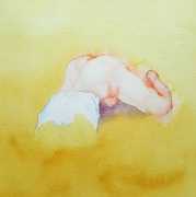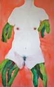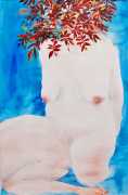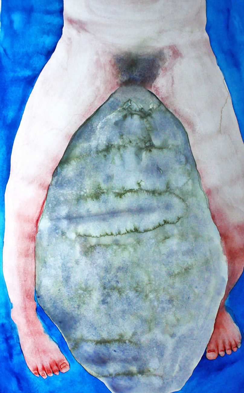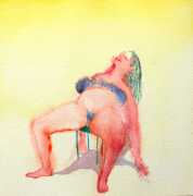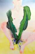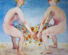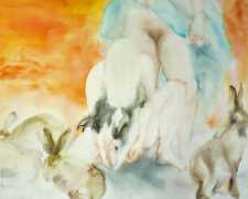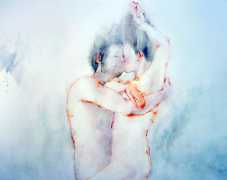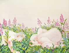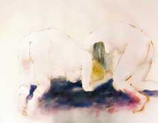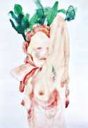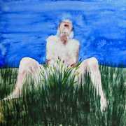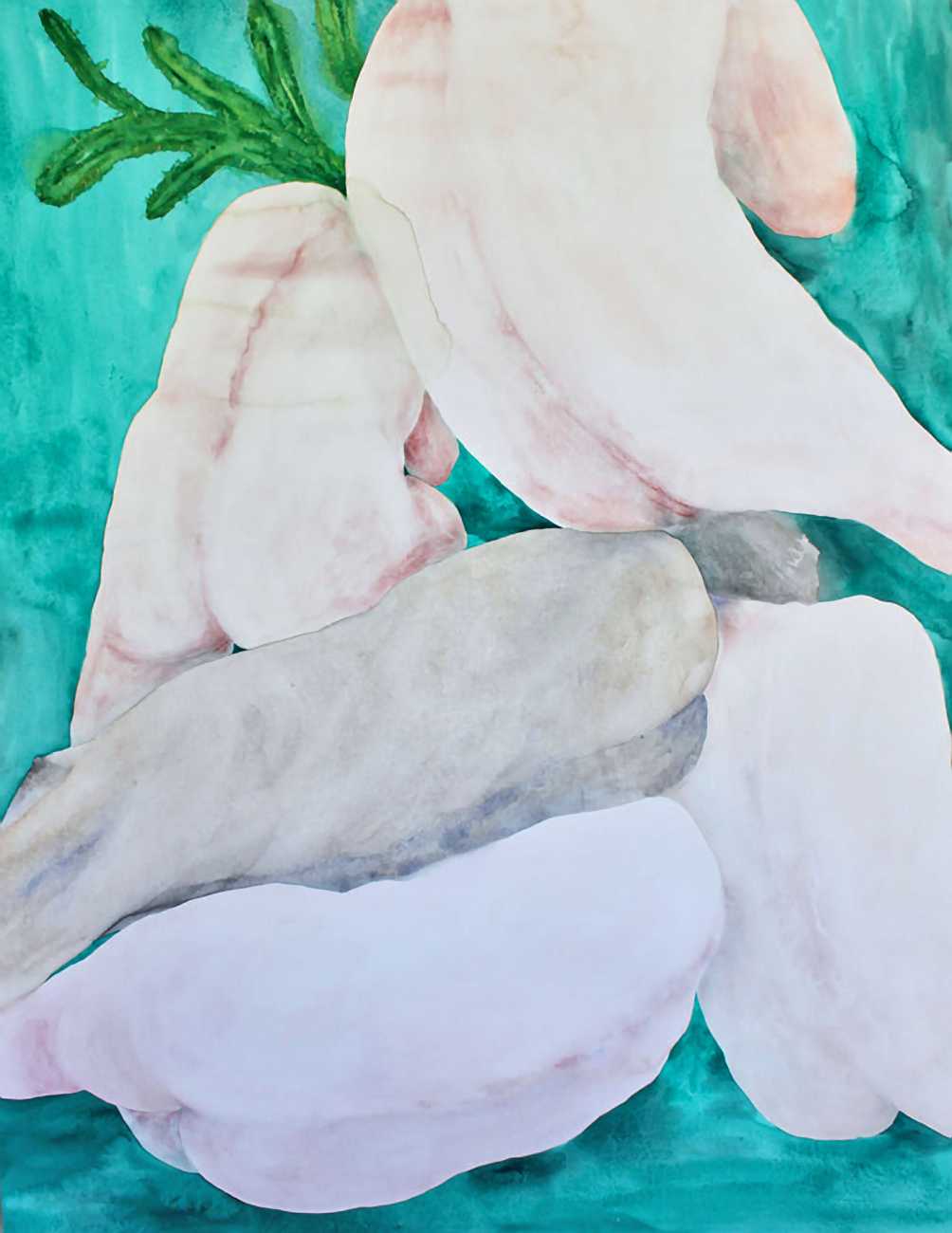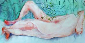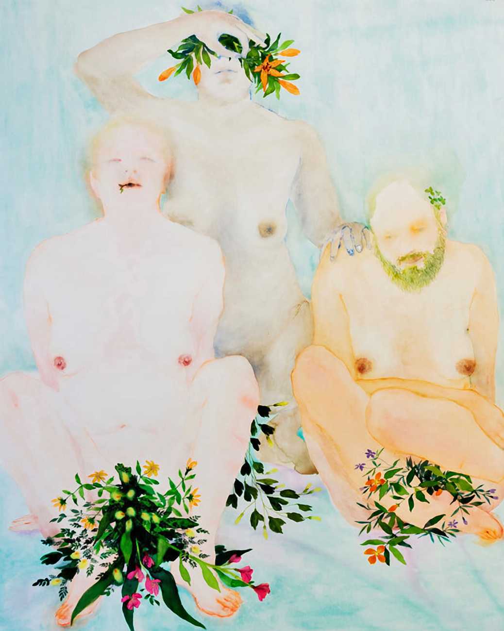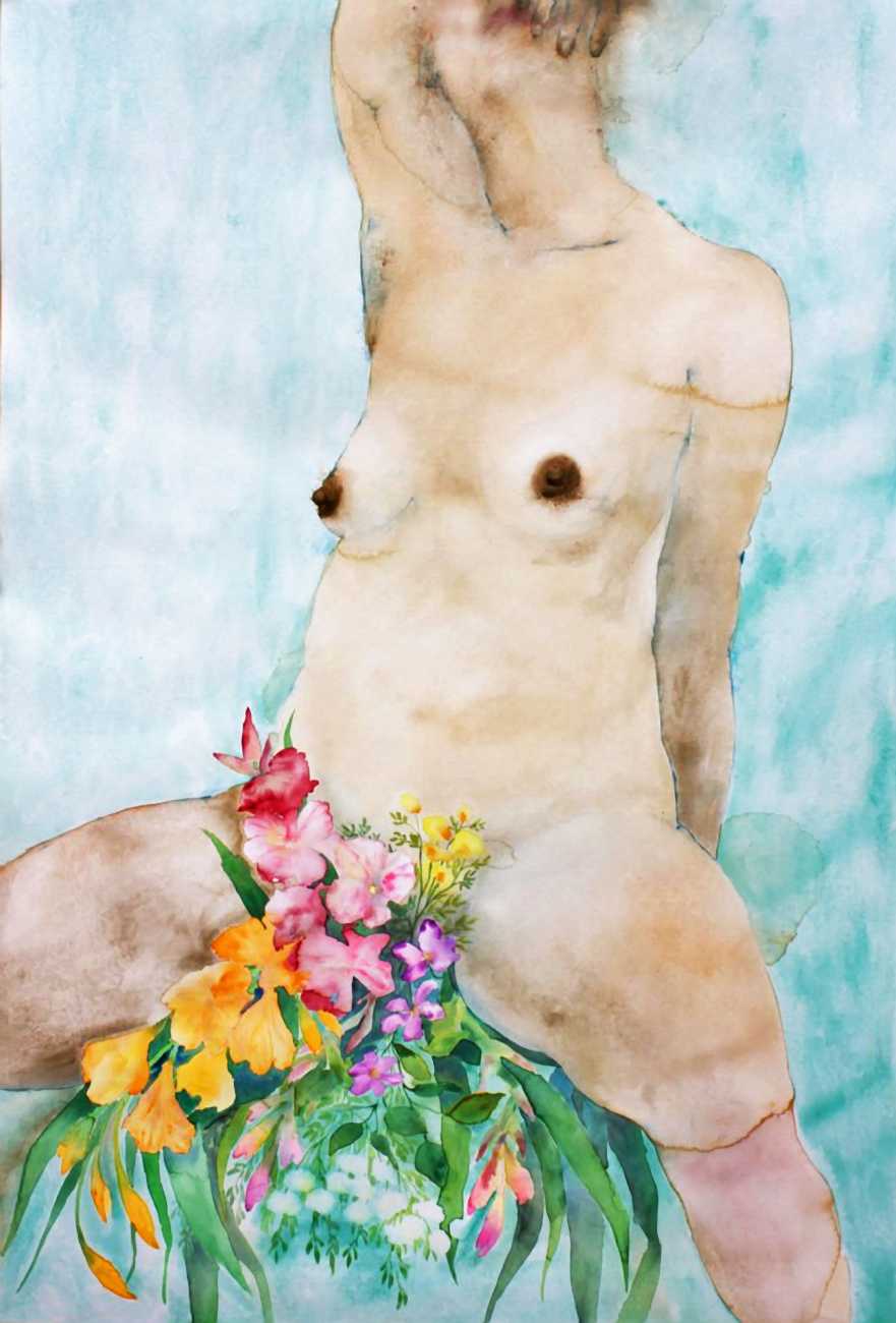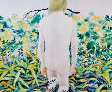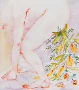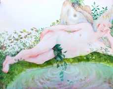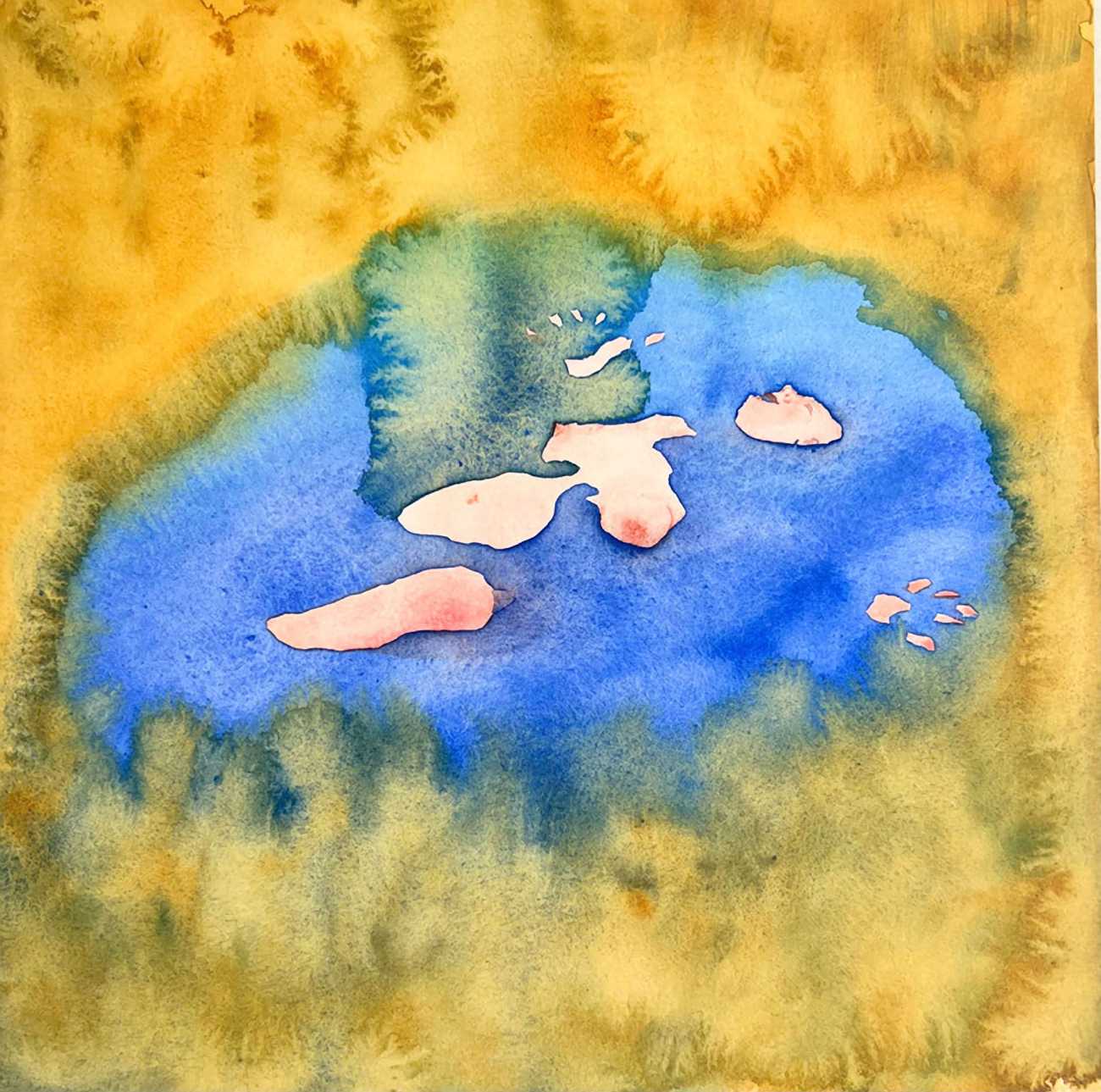 The majority of her watercolours include naked bodies, sometimes interacting with each other but more often in relationship with the natural world. Her subjects’ pale bodies relate intimately with plants and water, and she has a particular interest in pissing in the open air, which as she says ‘is a beautiful moment where the body is connected to nature. When you piss outside, your fluids are simultaneously in your body and on the ground.’