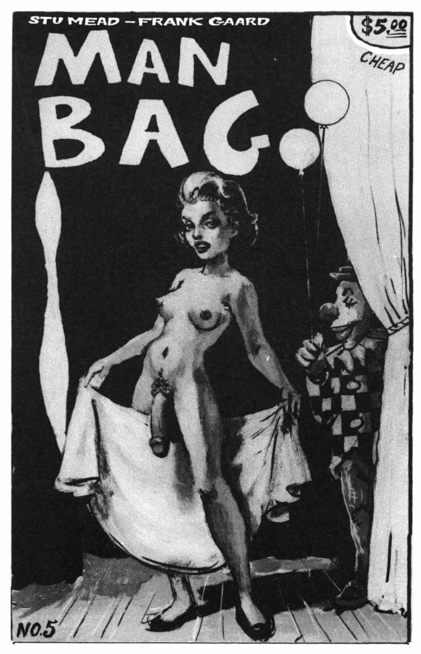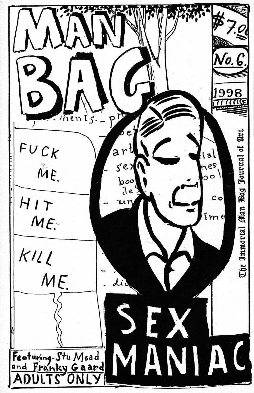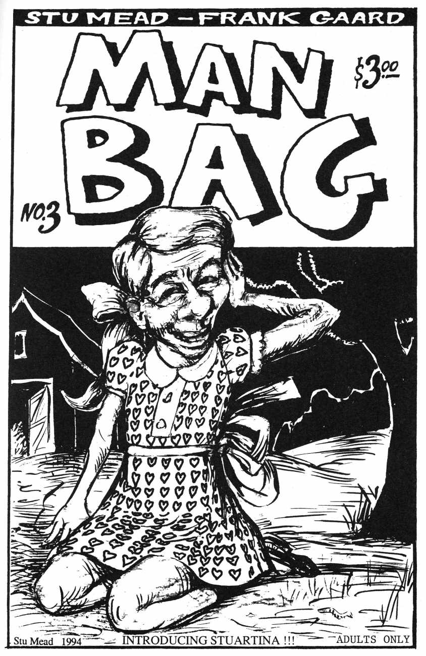 At the late age of 27, in 1979 he moved to Minneapolis to study art at the Minneapolis College of Art and Design, where he became acquainted with artist and future collaborator Frank Gaard, who taught at the college. Sitting in on Gaard’s lectures he found them disturbingly anarchic, but was pleasantly surprised at how insightful and generous he was with his students. In 1987 Mead began contributing to the artist zine Artpolice, which Frank Gaard edited, and participated in the publication from 1987 until its final issue in 1994. Artpolice gave Mead a forum where he could freely explore taboo themes, including adolescent sexuality, bestiality, and scatology. In 1991 Stu Mead, in collaboration with Gaard, began publishing the zine Man Bag. An offshoot of Artpolice, Man Bag focused on sexual issues.