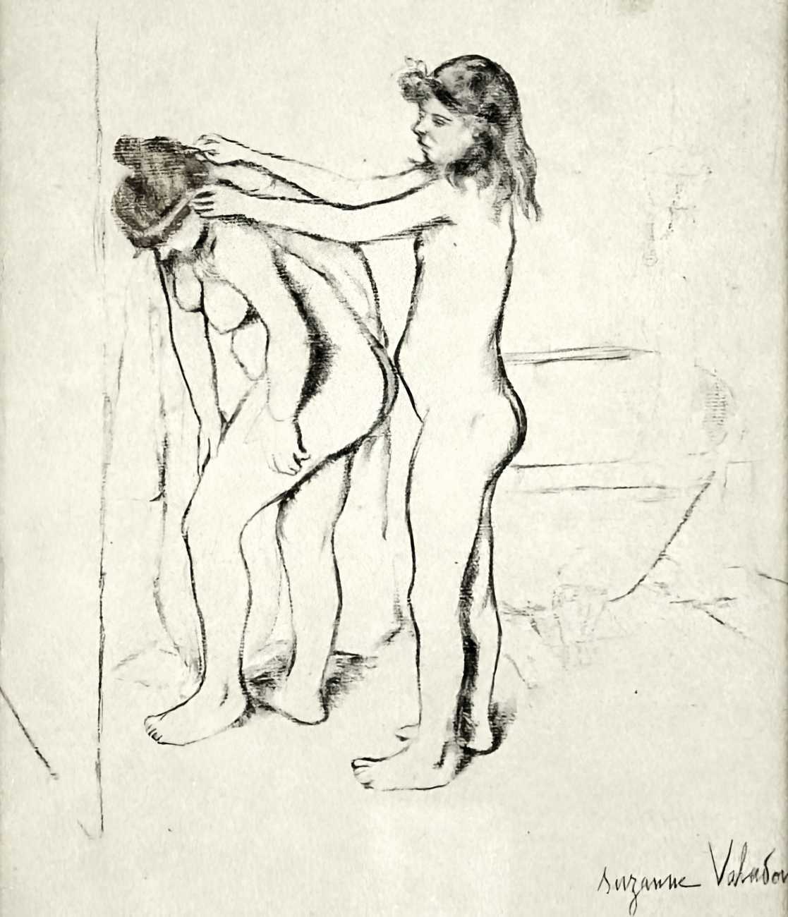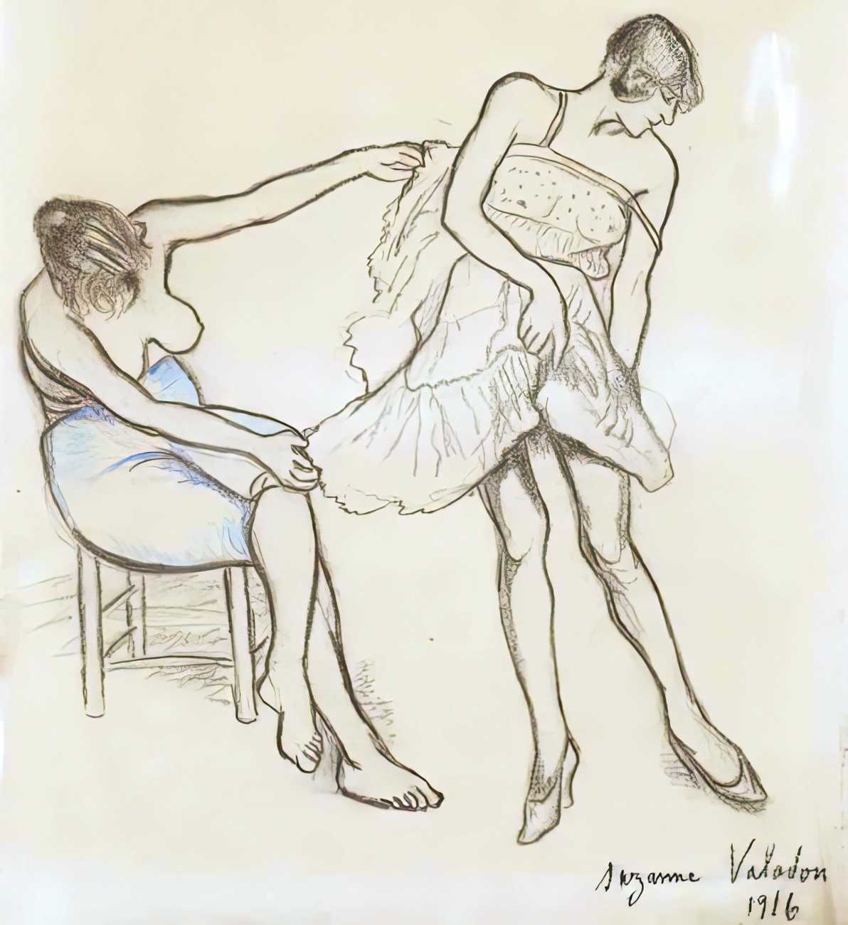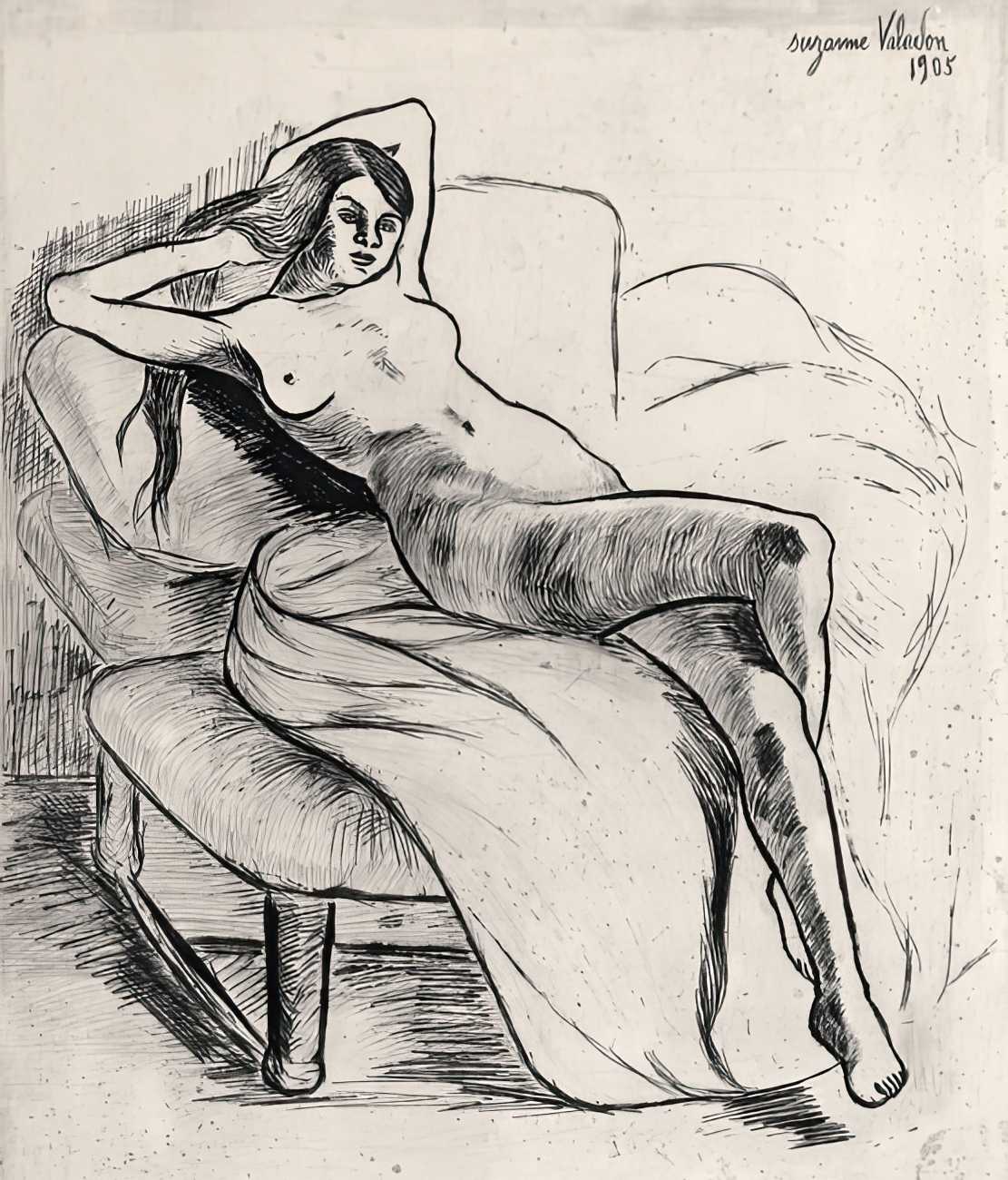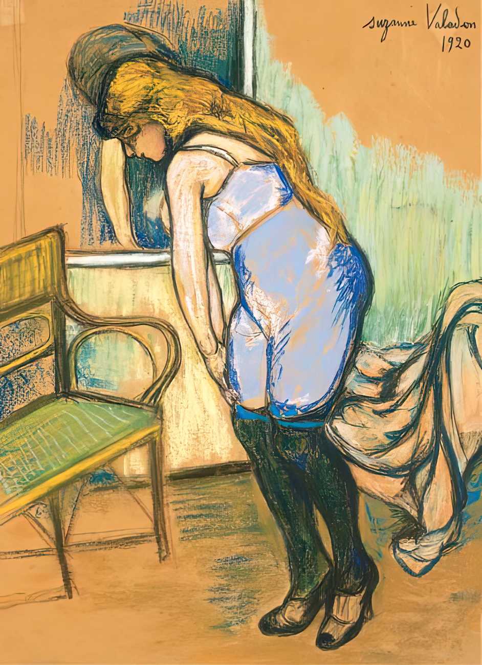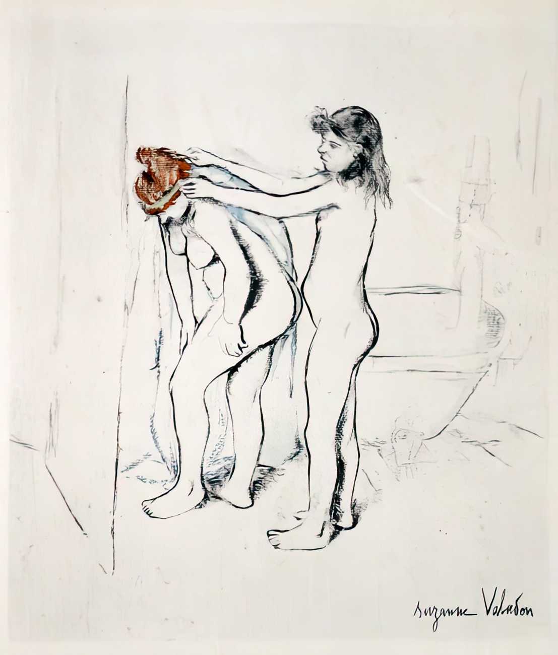 Valadon taught herself how to draw, and growing up in Montmartre she pursued her interest in art, first working as a model and a muse for artists, observing and learning their techniques, as she could not afford art lessons herself. Valadon began working as a model in 1880, and posed for more than ten years for artists including Berthe Morisot, Pierre-Cécile Puvis de Chavannes, Théophile Steinlen, Pierre-Auguste Renoir, Jean-Jacques Henner and Henri de Toulouse-Lautrec. She modelled under the name Maria before being nicknamed Suzanne by Toulouse-Lautrec after the biblical story of Susanna and the Elders. She was Toulouse-Lautrec’s lover for two years. She observed and learned from artists such as de Chavannes, Toulouse-Lautrec and Renoir before becoming a painter in her own right.