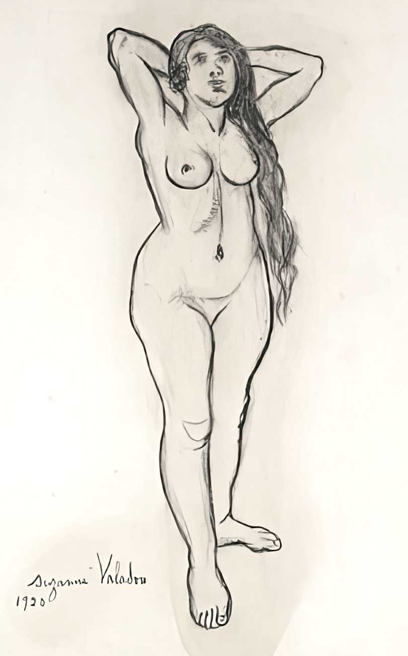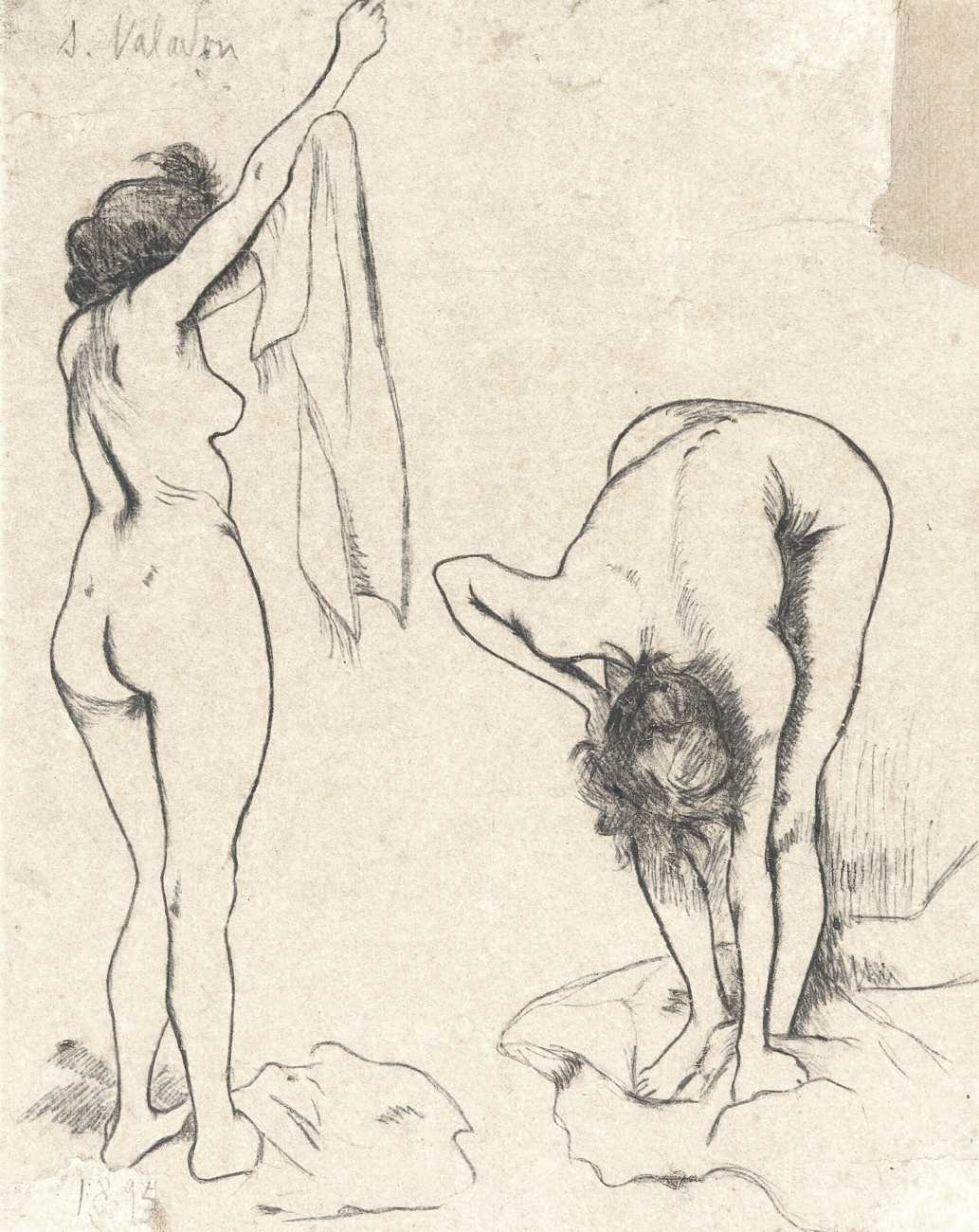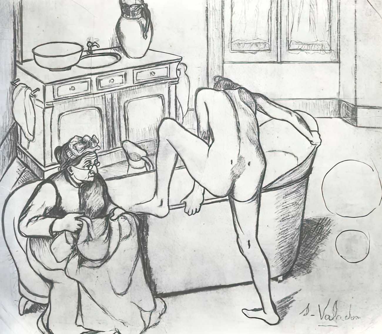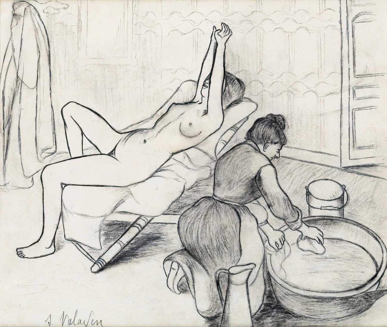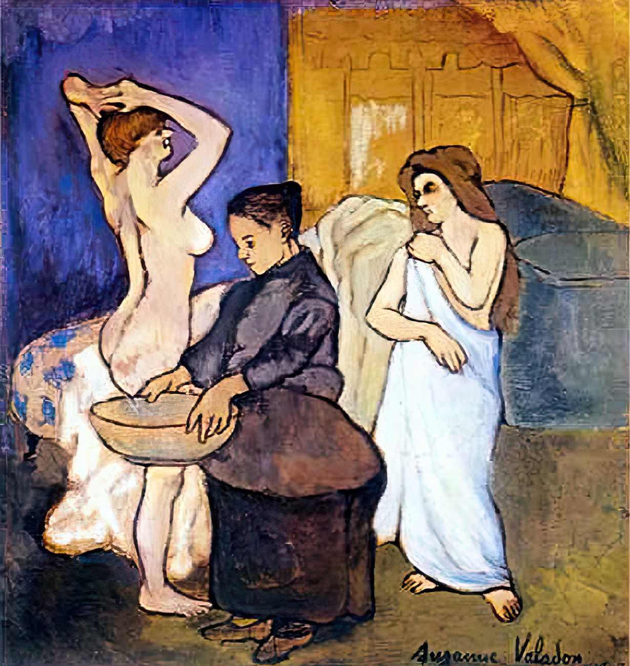Valadon taught herself how to draw, and growing up in Montmartre she pursued her interest in art, first working as a model and a muse for artists, observing and learning their techniques, as she could not afford art lessons herself. Valadon began working as a model in 1880, and posed for more than ten years for artists including Berthe Morisot, Pierre-Cécile Puvis de Chavannes, Théophile Steinlen, Pierre-Auguste Renoir, Jean-Jacques Henner and Henri de Toulouse-Lautrec. She modelled under the name Maria before being nicknamed Suzanne by Toulouse-Lautrec after the biblical story of Susanna and the Elders. She was Toulouse-Lautrec’s lover for two years. She observed and learned from artists such as de Chavannes, Toulouse-Lautrec and Renoir before becoming a painter in her own right.