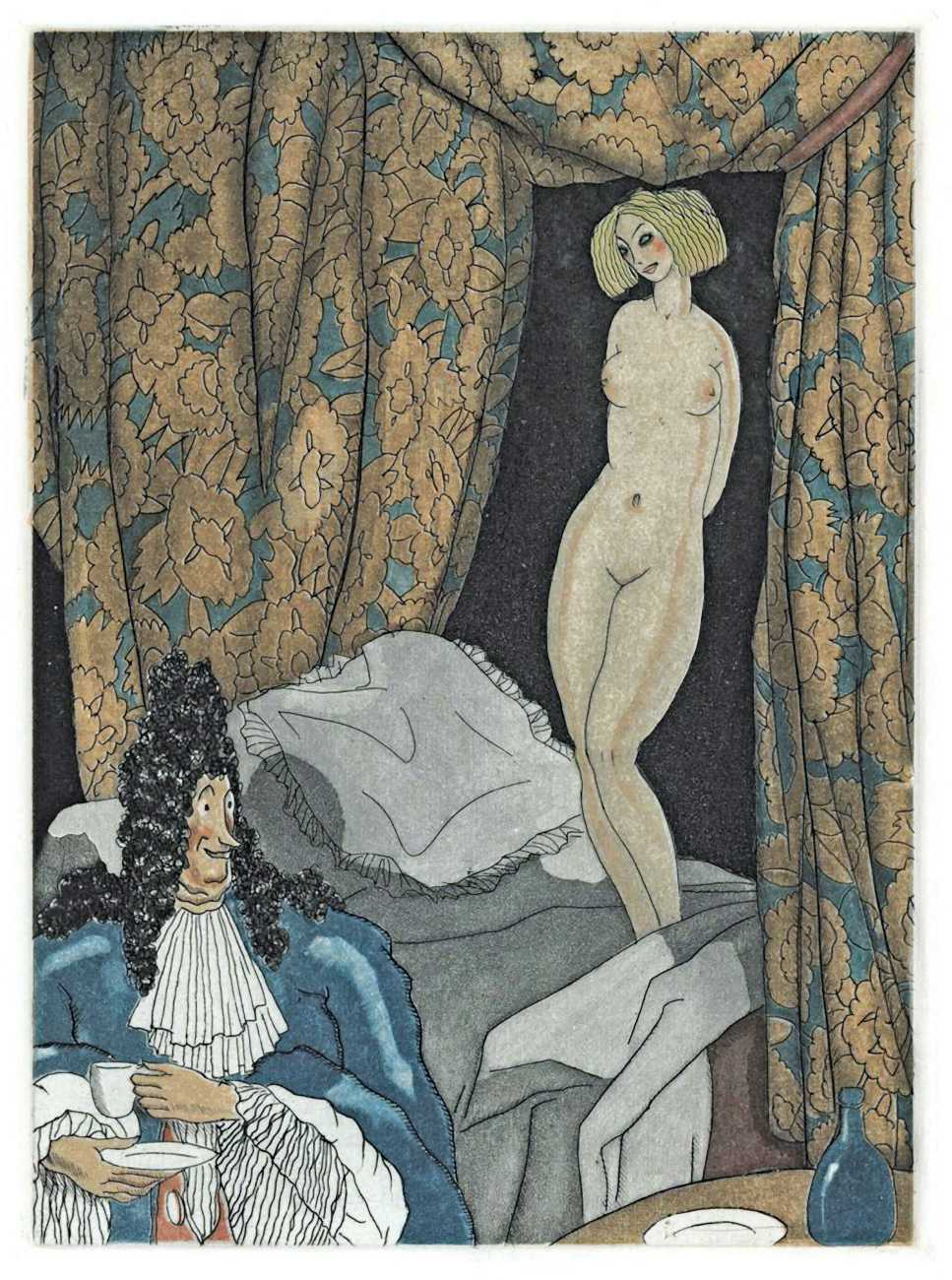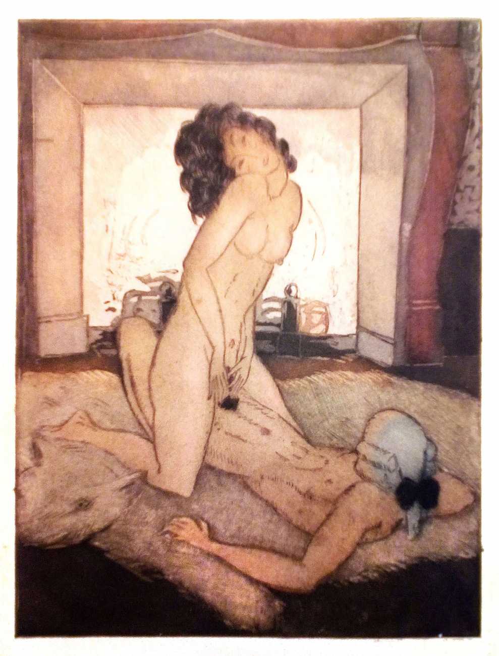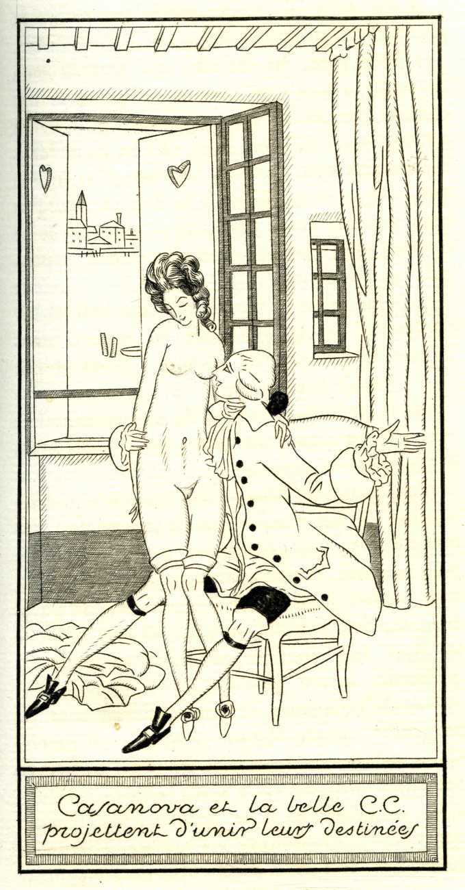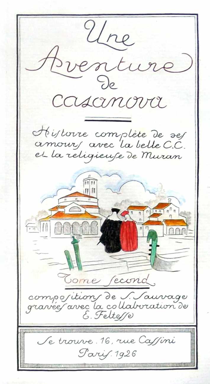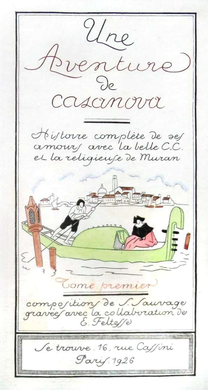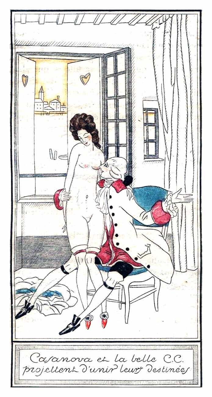 His first major artistic project was to illustrate the amorous adventures of Casanova, which started as a self-published portfolio and later as a book in collaboration with Paris publisher Paul Cotinaud. Une aventure de Casanova, which the demanding artist insisted should be produced to perfection, resulted in a range of different versions including some complex colour work. It is probably no coincidence that Sylvain Sauvage’s main body of erotic illustration coincided with his early years of marriage.