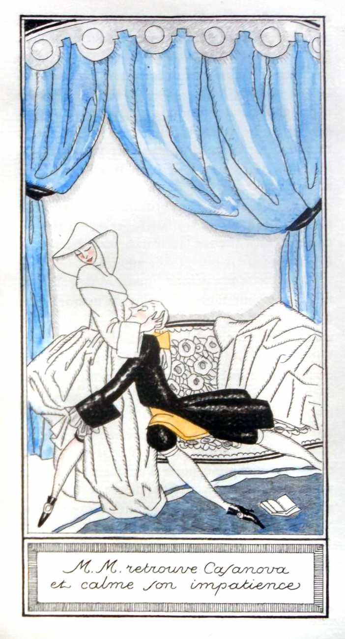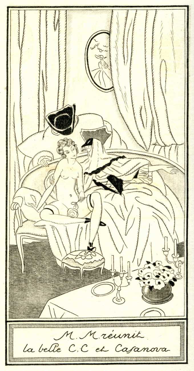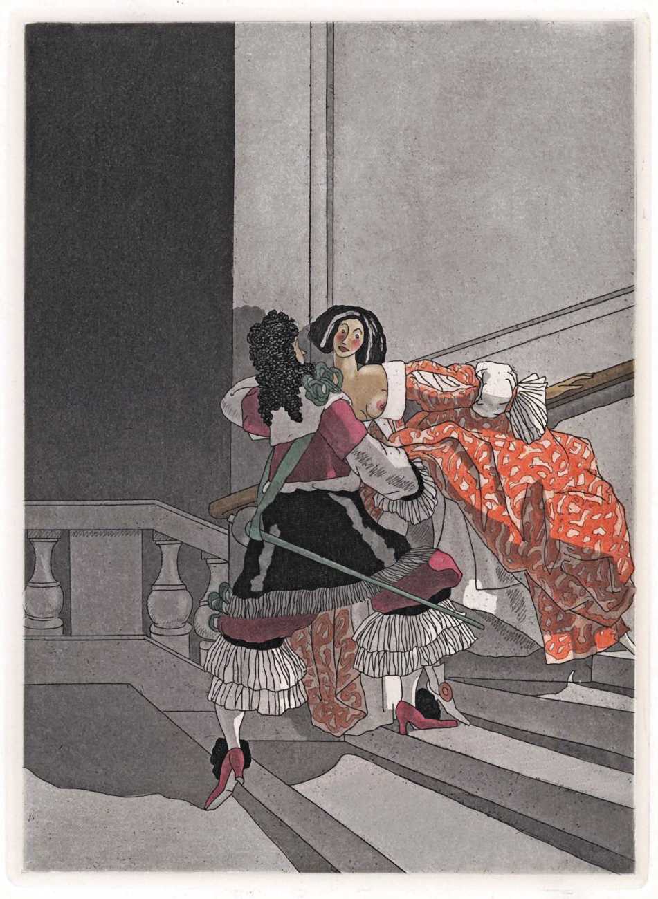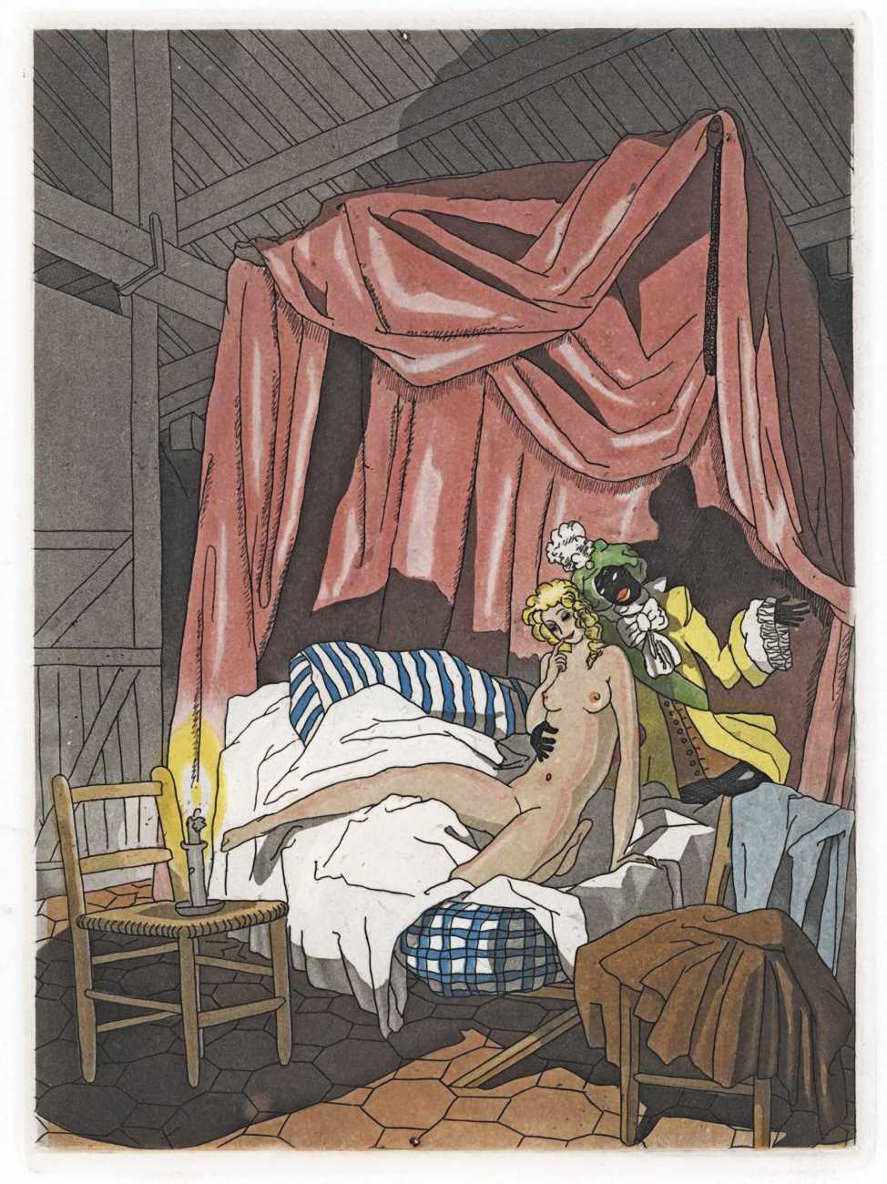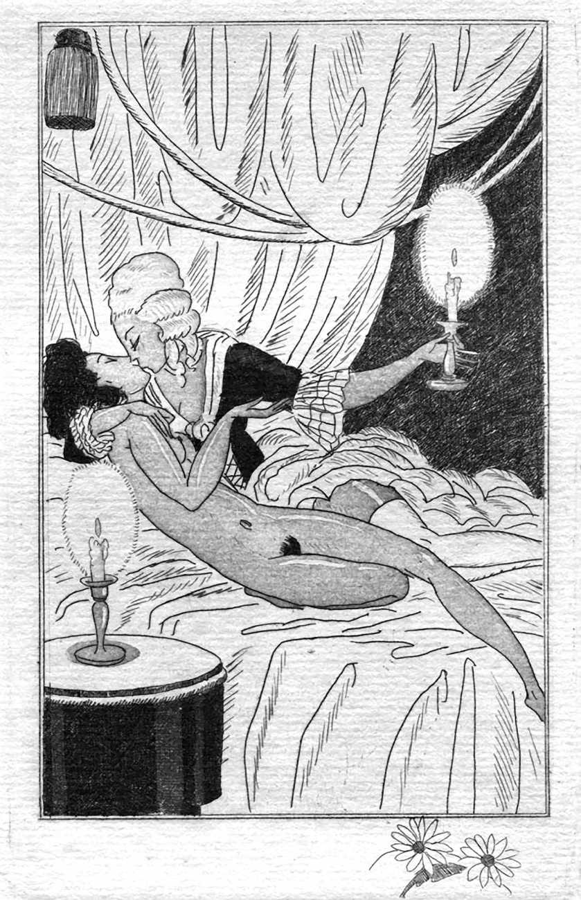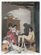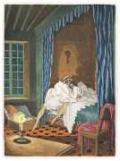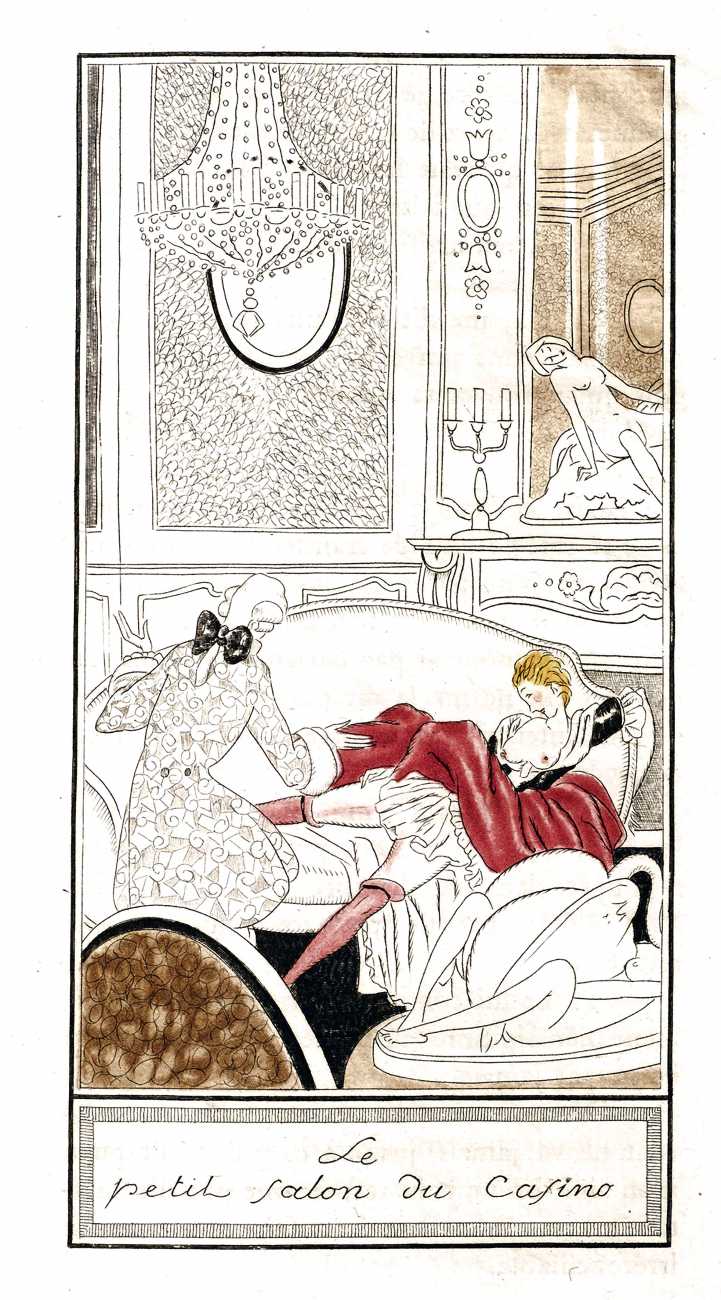 His first major artistic project was to illustrate the amorous adventures of Casanova, which started as a self-published portfolio and later as a book in collaboration with Paris publisher Paul Cotinaud. Une aventure de Casanova, which the demanding artist insisted should be produced to perfection, resulted in a range of different versions including some complex colour work. It is probably no coincidence that Sylvain Sauvage’s main body of erotic illustration coincided with his early years of marriage.