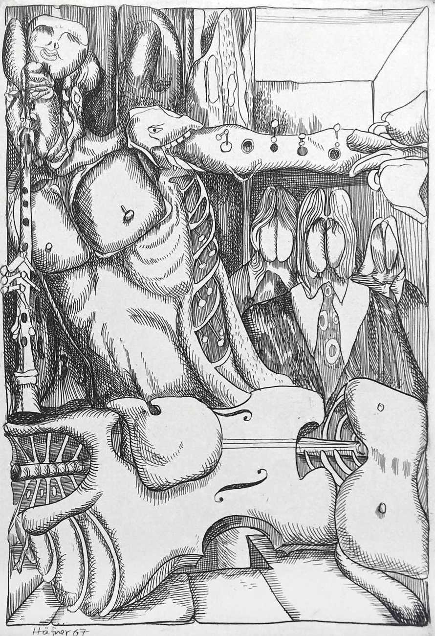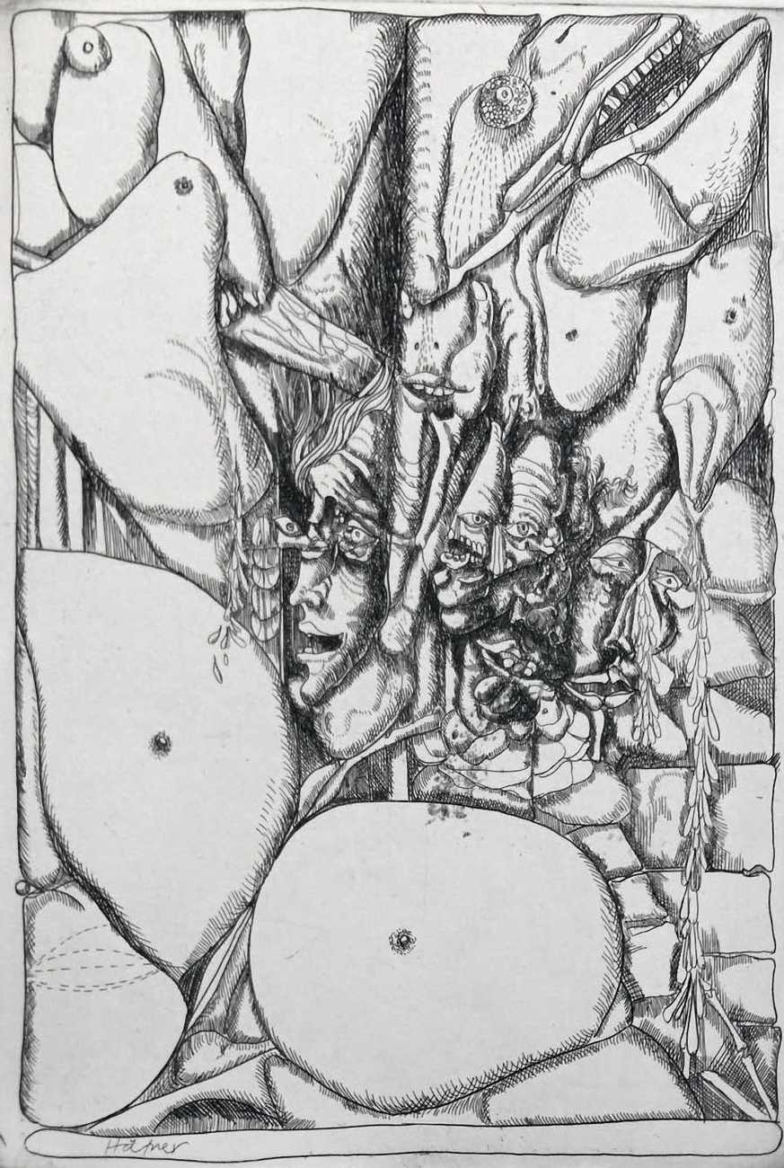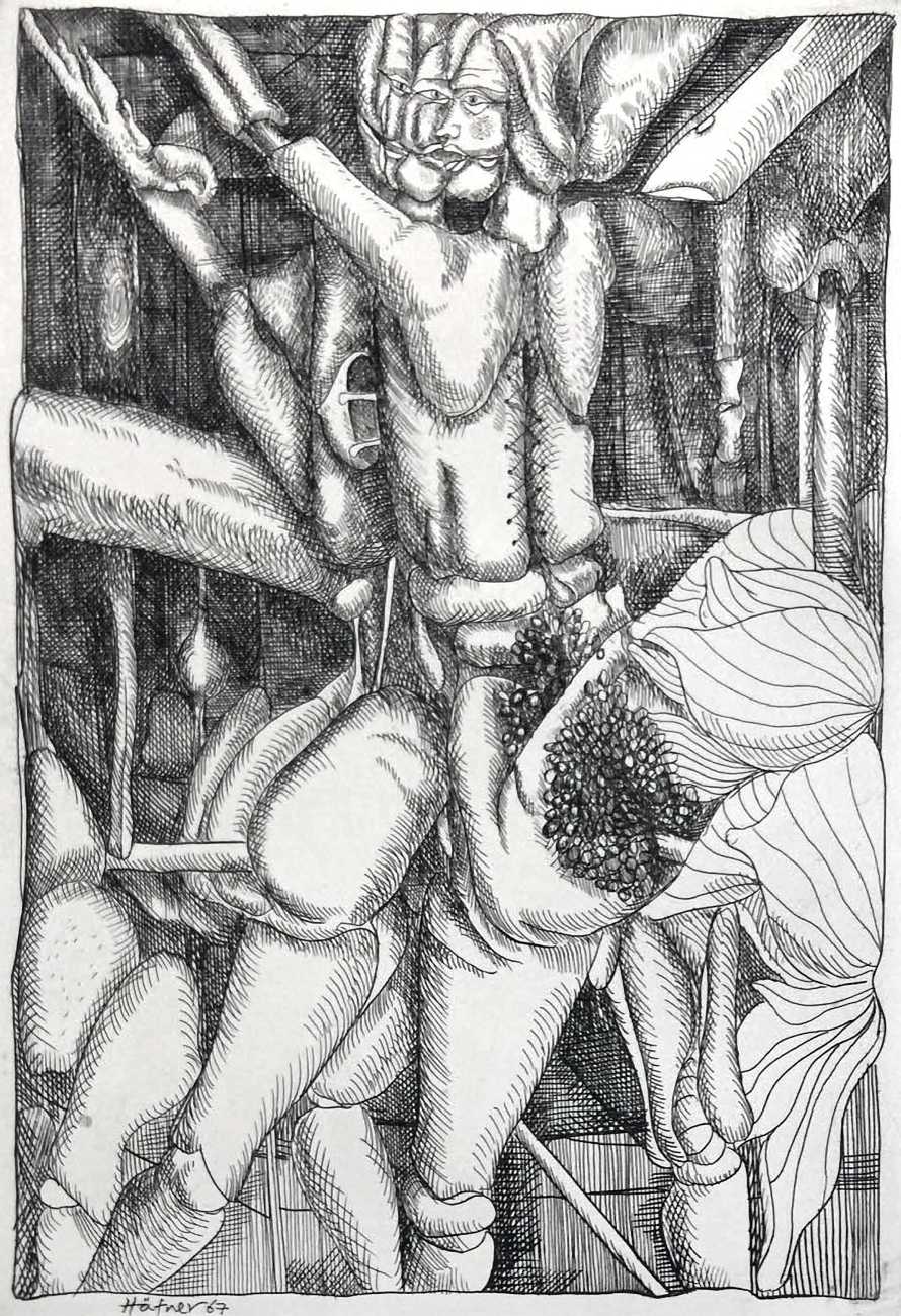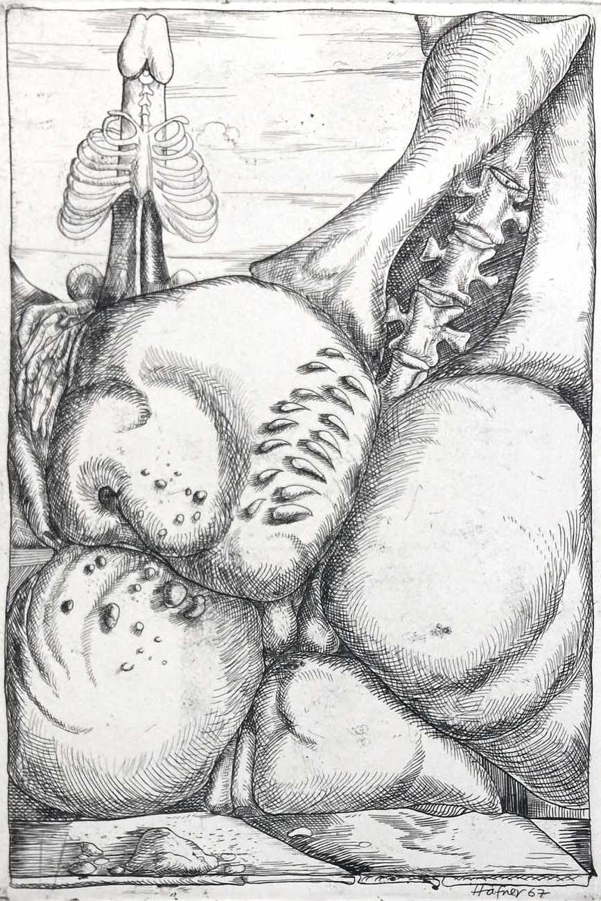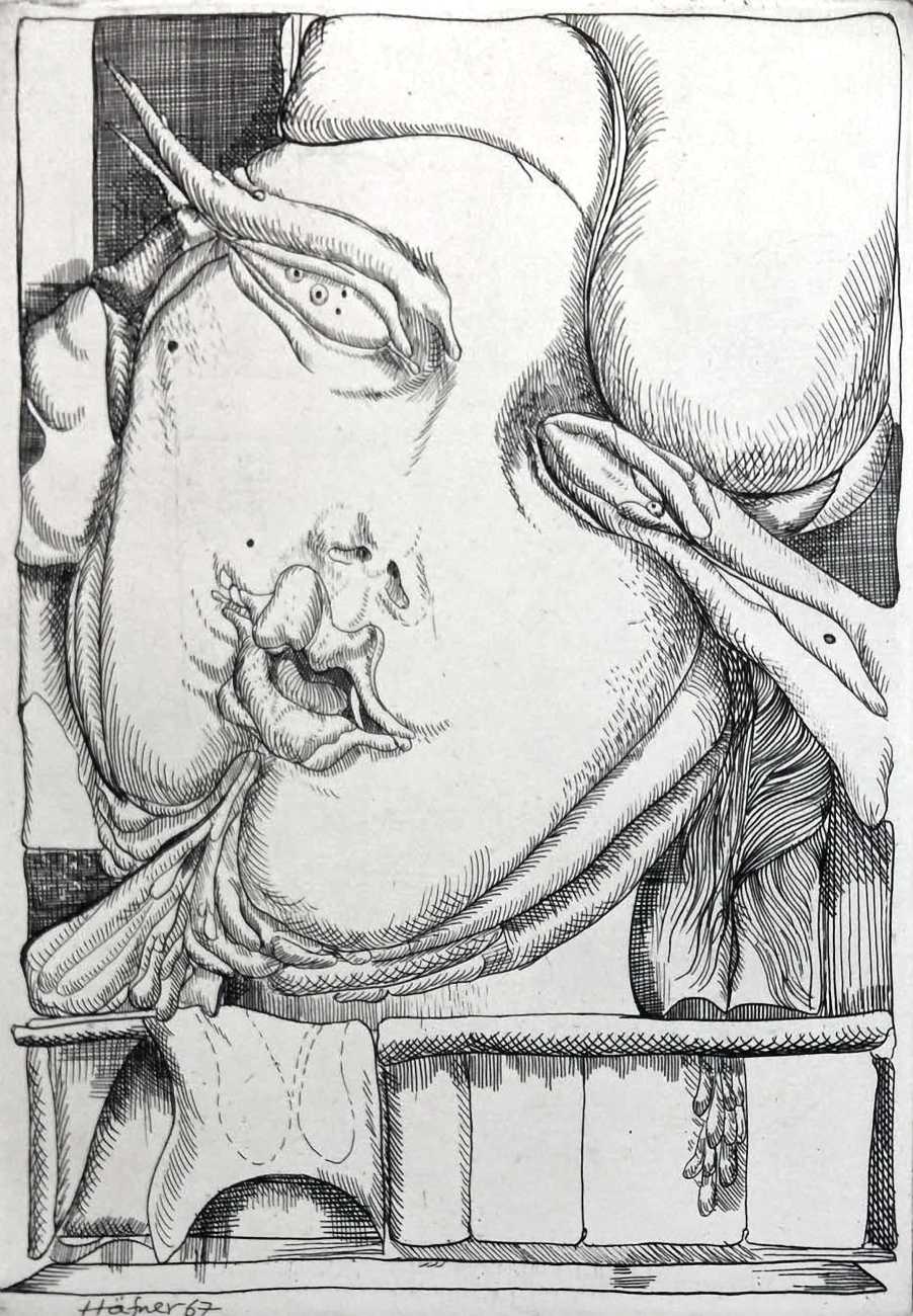 Häfner, who was very vulnerable as the son of a Jewish mother in Germany in the 1930s and 1940s, spent the Nazi era with his uncle in Ceylon, now Sri Lanka. The young Häfner was particularly fascinated by the fauna of the tropical island state, and this is probably why exotic creatures repeatedly find their way into the artist's dream and nightmare-like works. When he returned to Germany in 1948, Häfner enrolled at the Kunstakademie Düsseldorf (Düsseldorf Art Academy), where he studied with Theo Champion and Otto Pankok. From the very beginning Häfner loved to fill his pictures with numerous people in the manner of Bosch or Brueghel. At the Kunstakademie he met fellow painters Günther Cremers and Hannelore Köhler, with whom he founded the Young Realists group of artists. With numerous exhibitions in the 1950s and 1960s, this group of artists opposed the one-sided primacy of abstract painting.