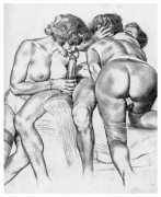 His erotica is very much of its time, the clothing is very clearly from the 1940s and 50s; the keenly-observed drawings, many clearly drawn from life, are characterised by an exuberance and joie de vivre on the part of the participants.