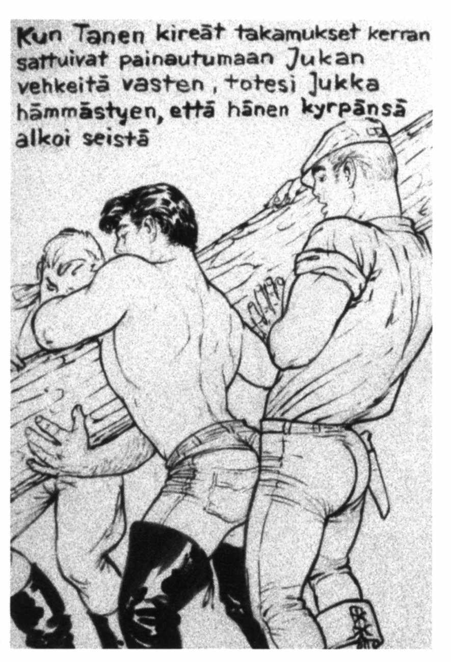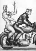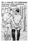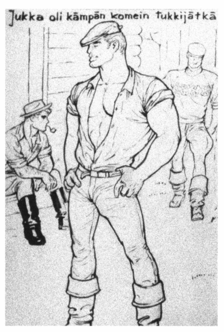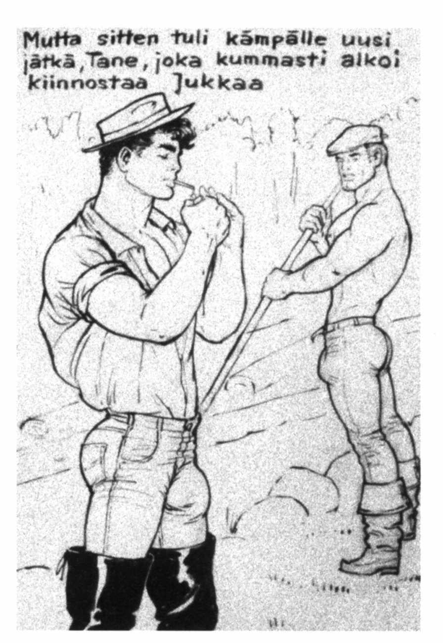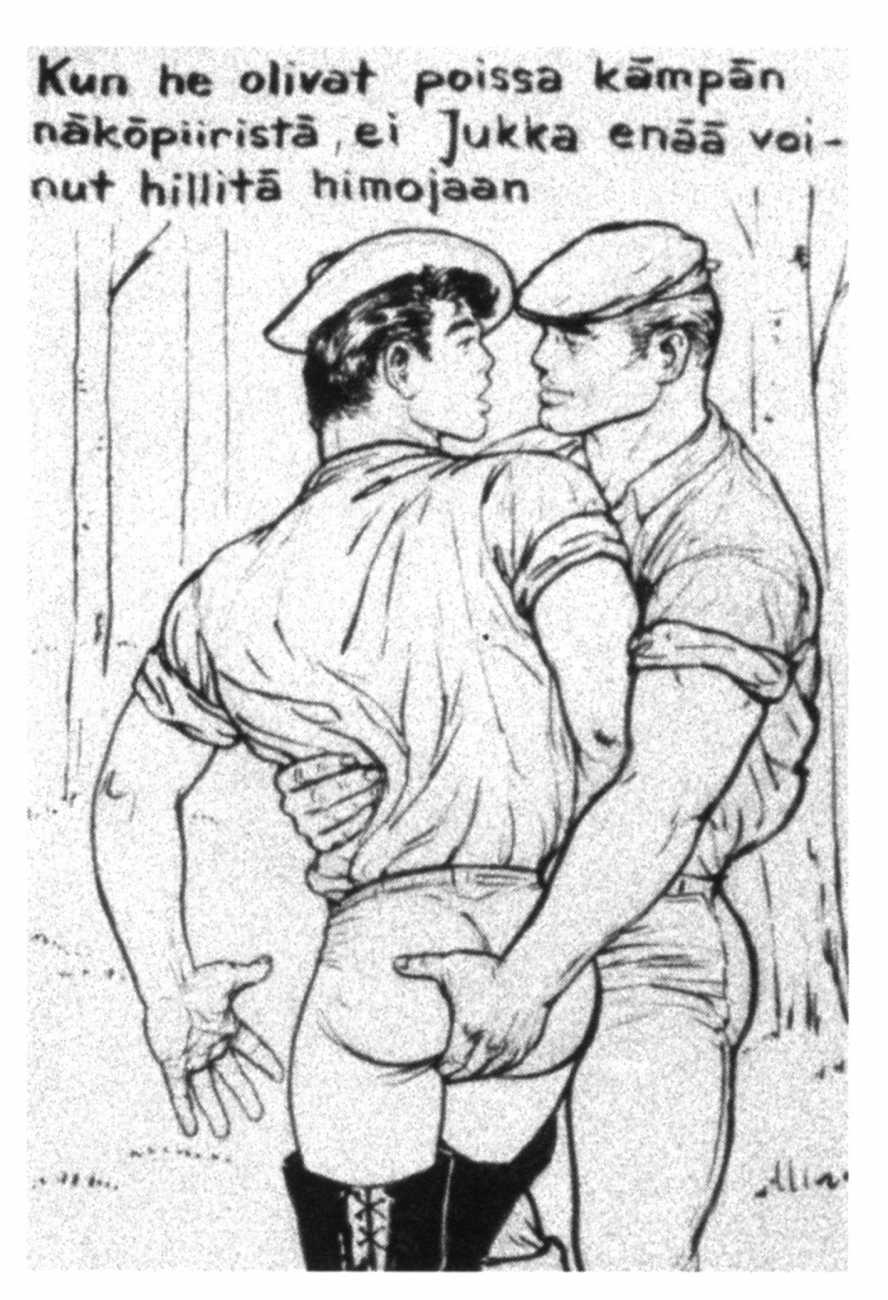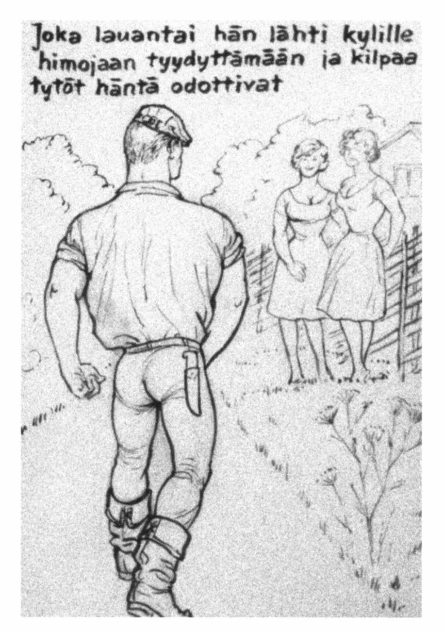Laaksonen’s style and content in the late 1950s and early 1960s was in the ‘beefcake’ genre, attractive, muscular young men in athletic poses. Their primary market was gay men, but because of the conservative and homophobic social culture of the time, gay erotica was illegal in most countries. During this period Laaksonen was mostly working with private commissions, and his more explicit work remaining unpublished. In 1968, however, he found a market for his work in comic books, including a popular series featuring Kake, a dark-haired, moustached leatherman, who in a series of twenty-six comic books travels the world on his motorcycle to spread the seeds of ecstatically explicit gay sex.