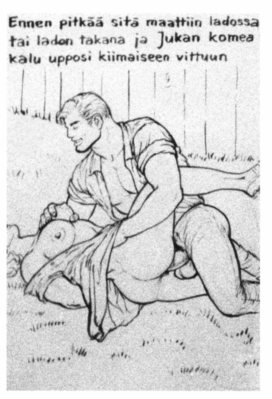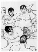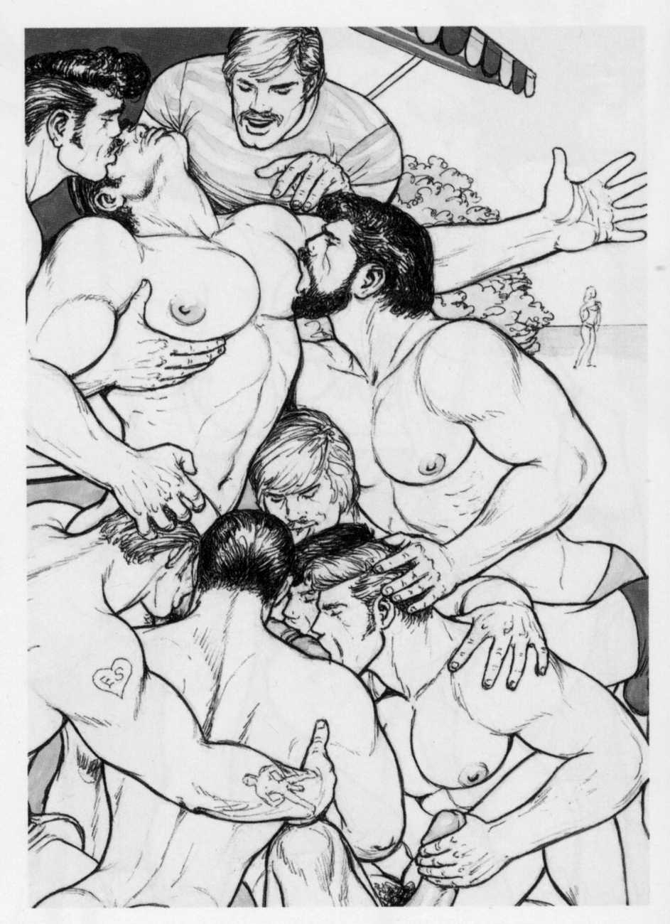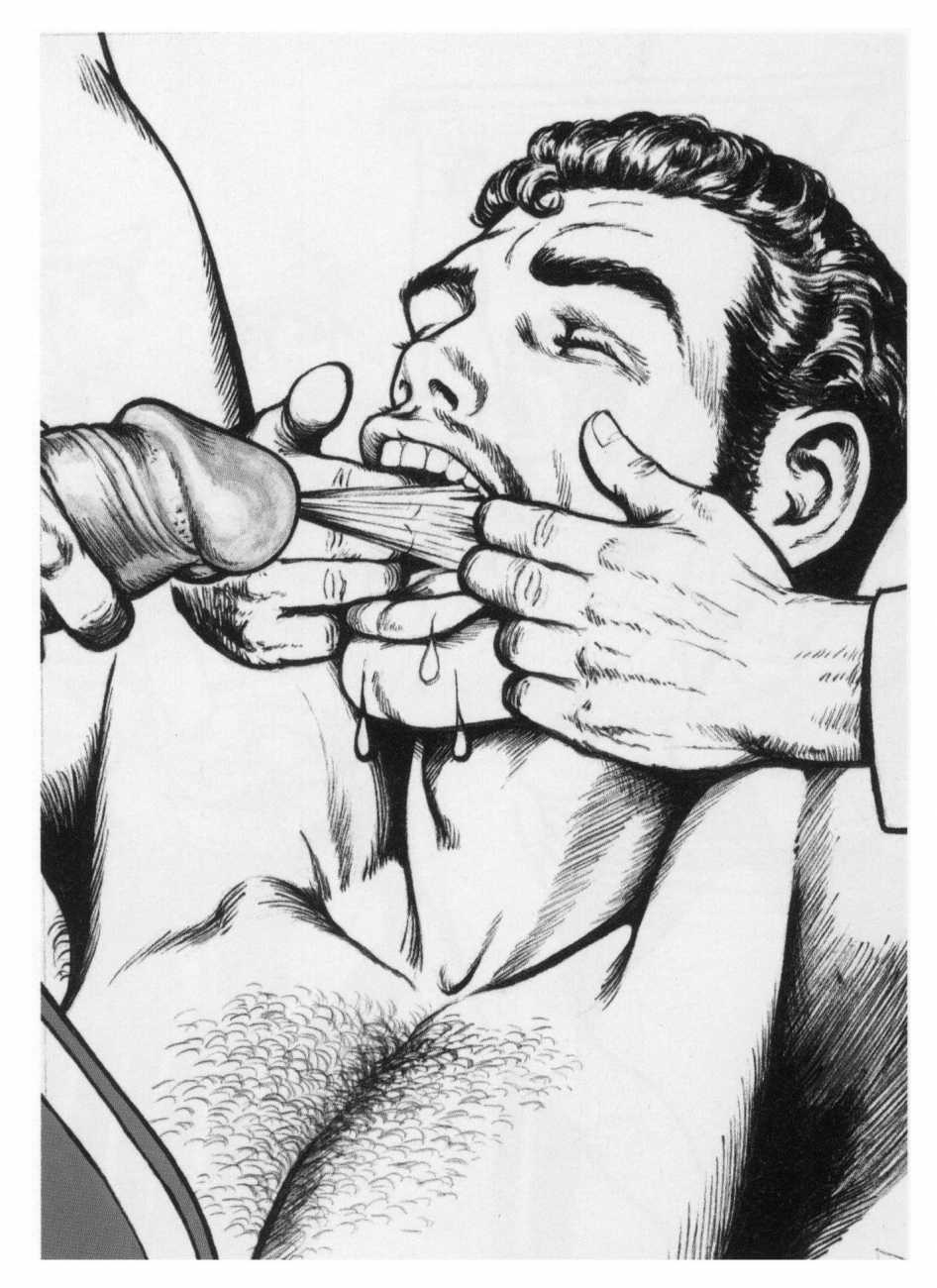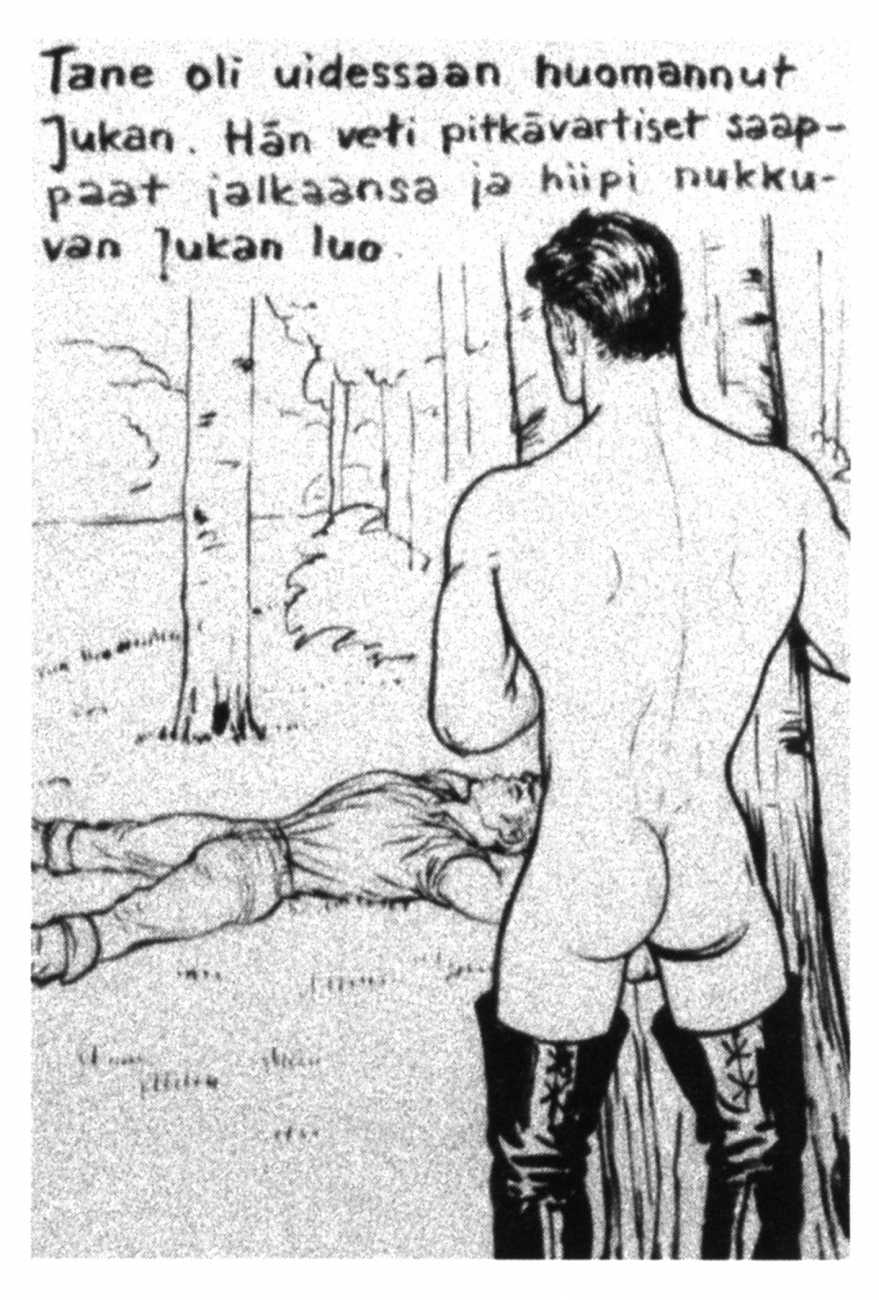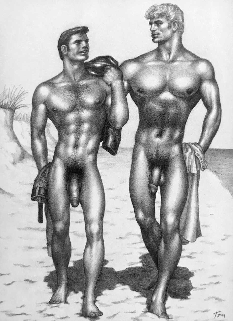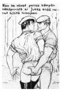 Laaksonen’s style and content in the late 1950s and early 1960s was in the ‘beefcake’ genre, attractive, muscular young men in athletic poses. Their primary market was gay men, but because of the conservative and homophobic social culture of the time, gay erotica was illegal in most countries. During this period Laaksonen was mostly working with private commissions, and his more explicit work remaining unpublished. In 1968, however, he found a market for his work in comic books, including a popular series featuring Kake, a dark-haired, moustached leatherman, who in a series of twenty-six comic books travels the world on his motorcycle to spread the seeds of ecstatically explicit gay sex.