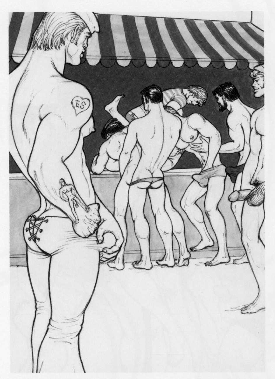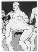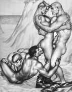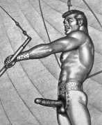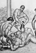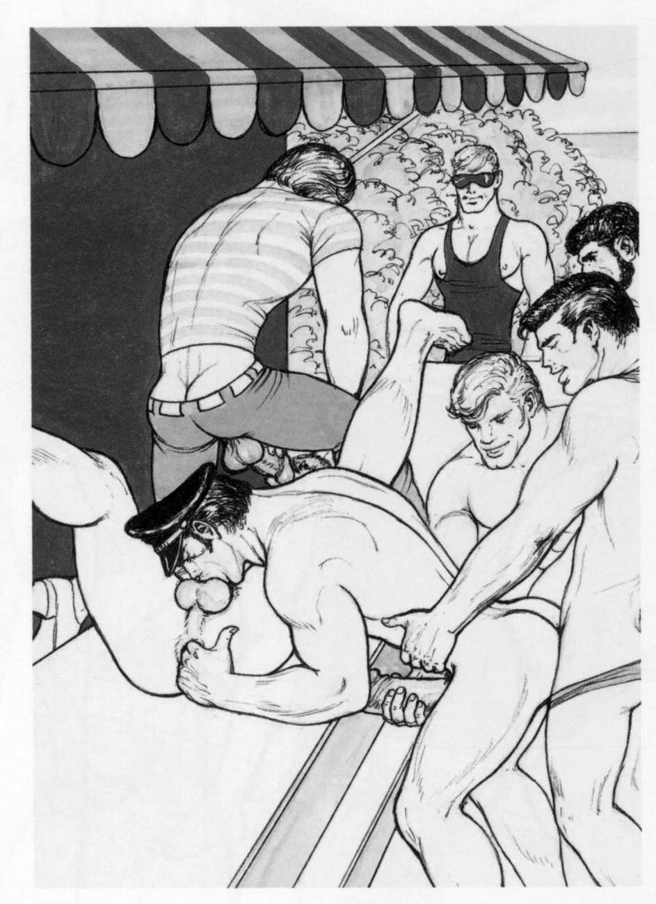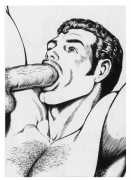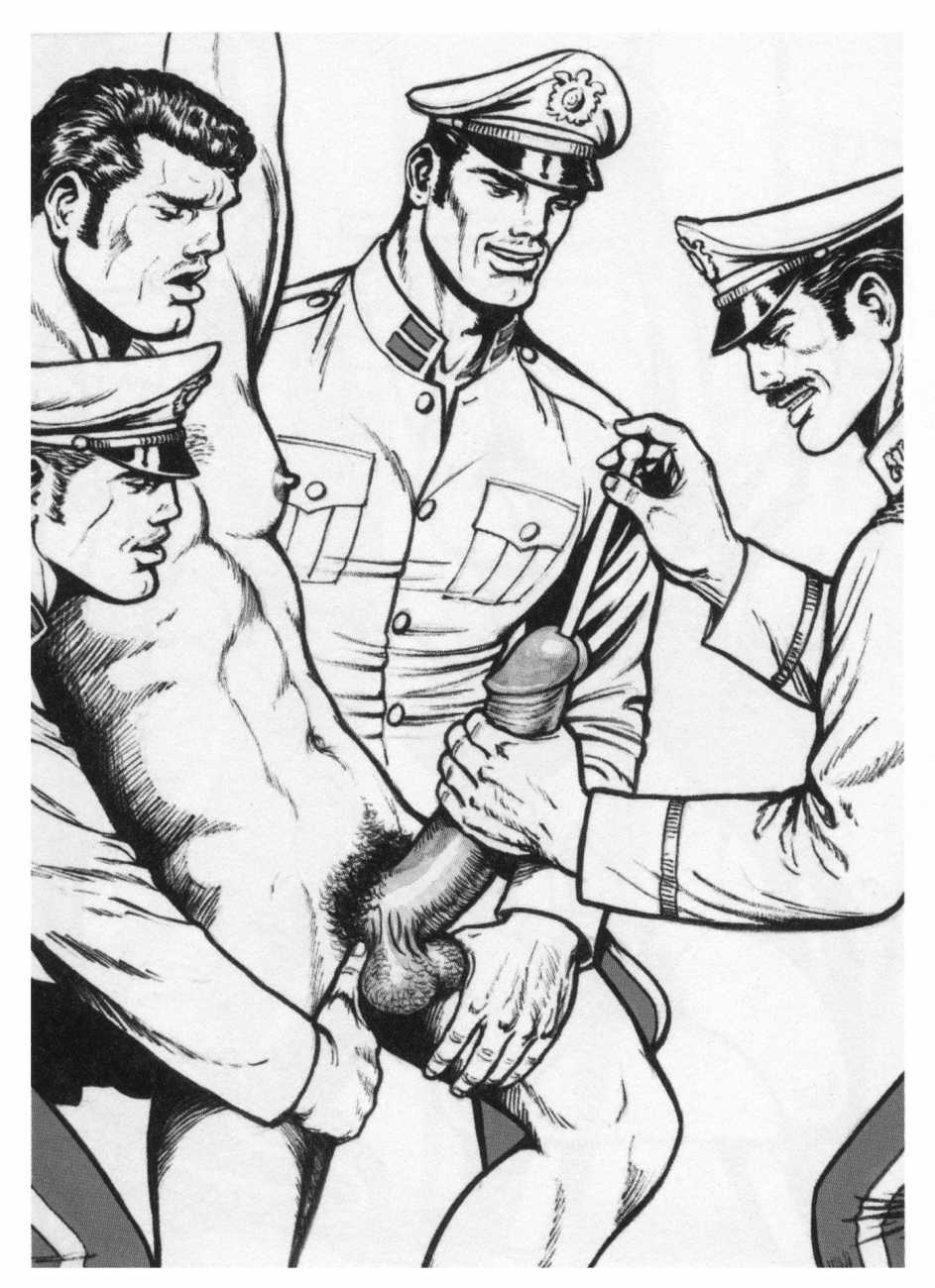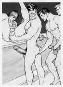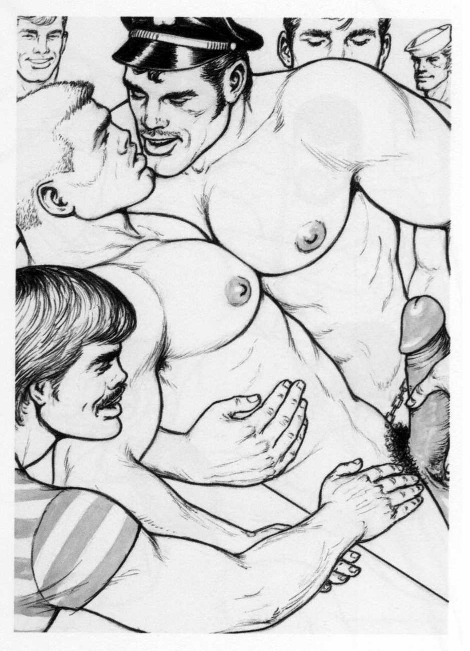 Laaksonen’s style and content in the late 1950s and early 1960s was in the ‘beefcake’ genre, attractive, muscular young men in athletic poses. Their primary market was gay men, but because of the conservative and homophobic social culture of the time, gay erotica was illegal in most countries. During this period Laaksonen was mostly working with private commissions, and his more explicit work remaining unpublished. In 1968, however, he found a market for his work in comic books, including a popular series featuring Kake, a dark-haired, moustached leatherman, who in a series of twenty-six comic books travels the world on his motorcycle to spread the seeds of ecstatically explicit gay sex.