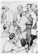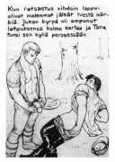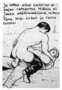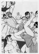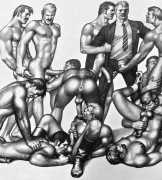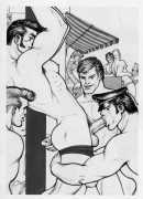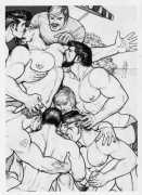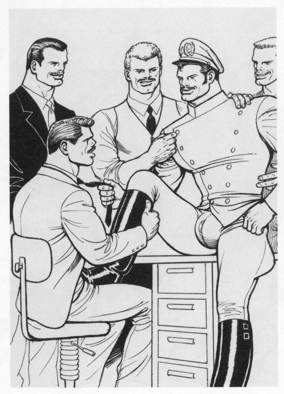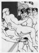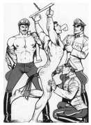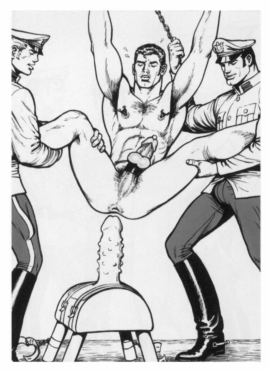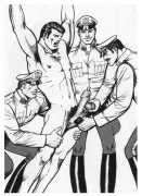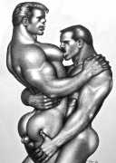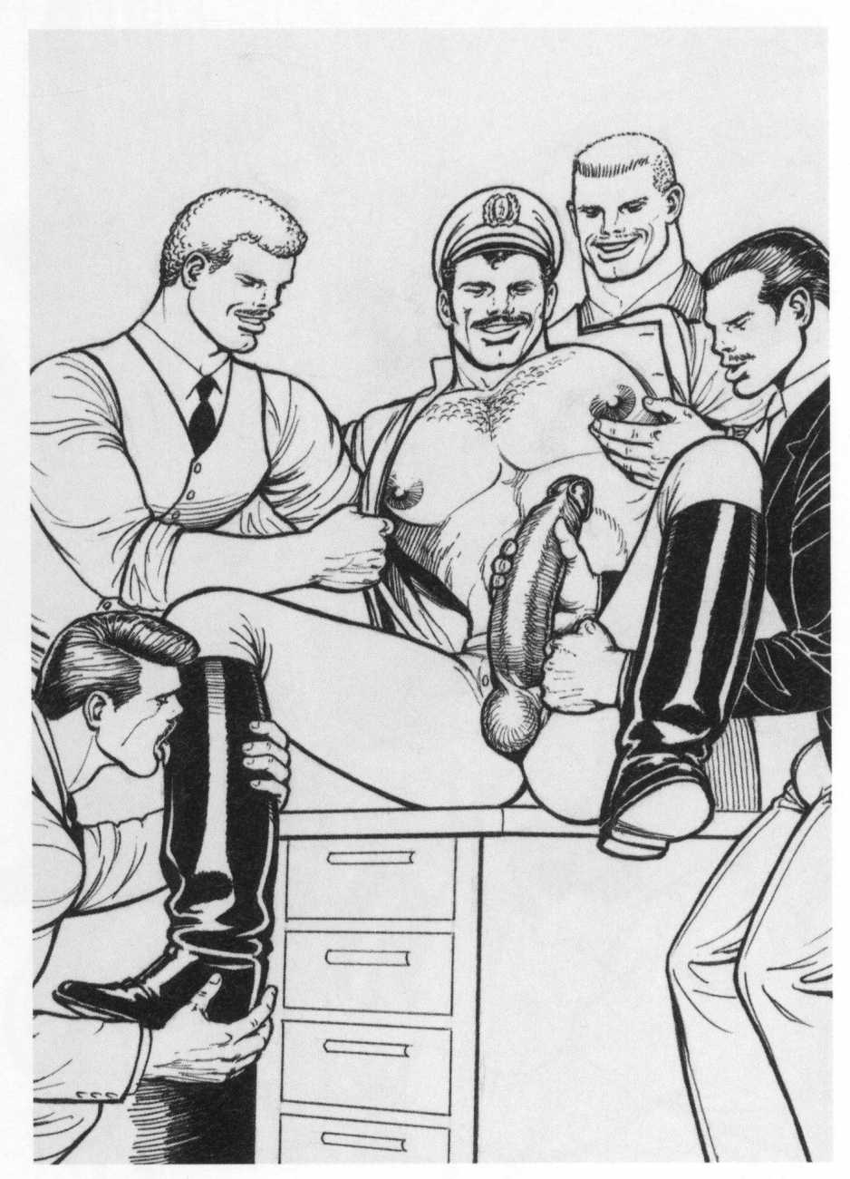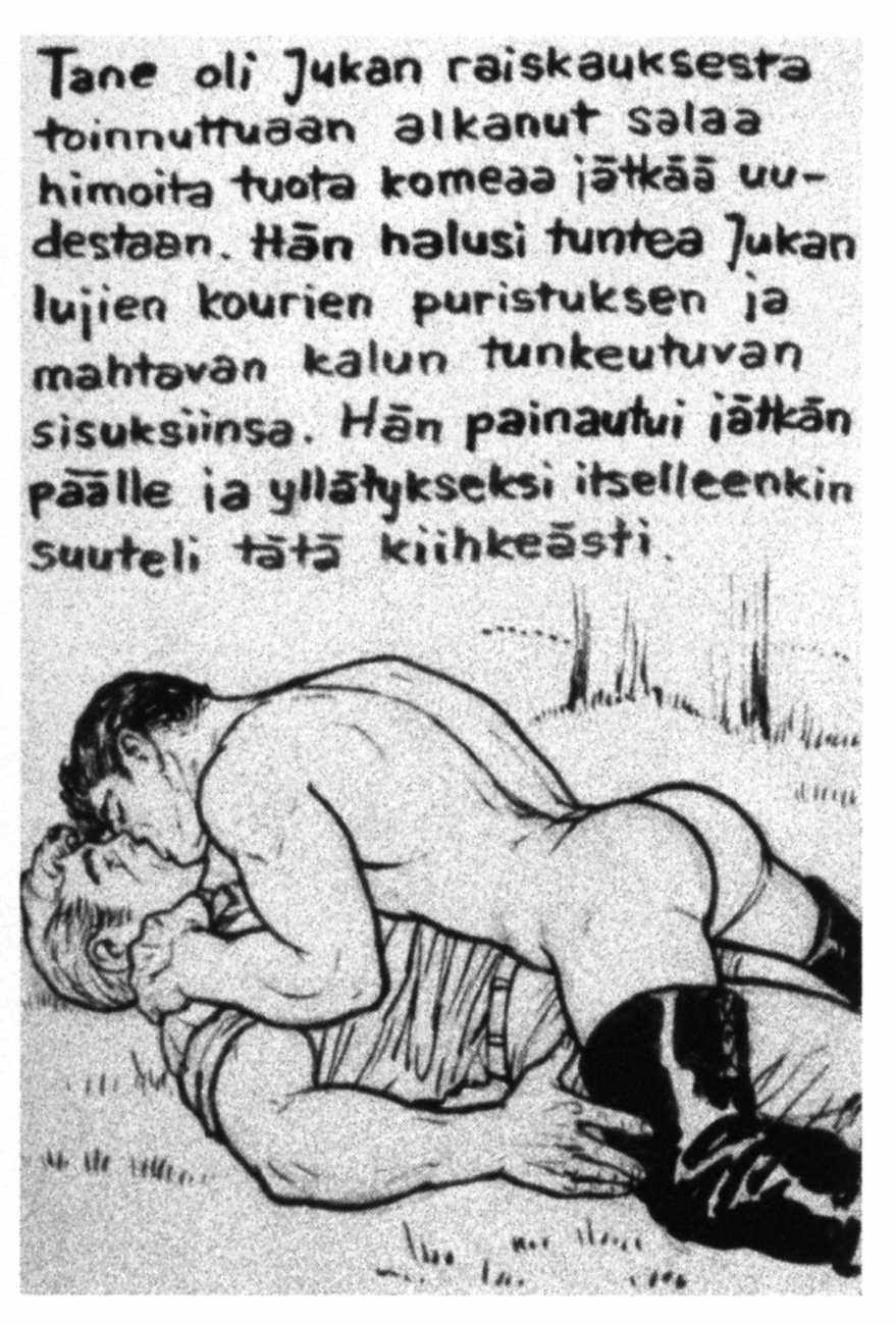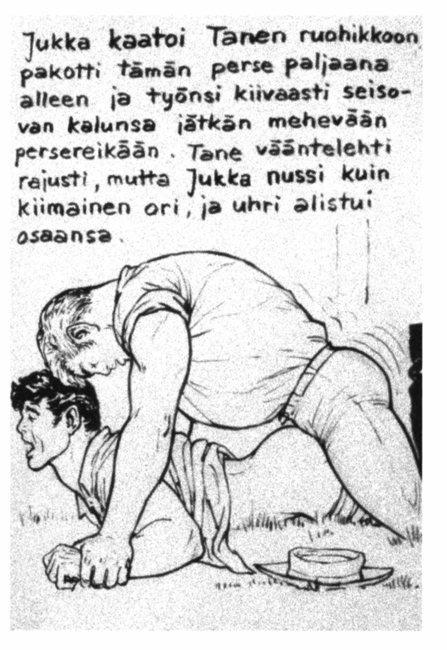 Laaksonen’s style and content in the late 1950s and early 1960s was in the ‘beefcake’ genre, attractive, muscular young men in athletic poses. Their primary market was gay men, but because of the conservative and homophobic social culture of the time, gay erotica was illegal in most countries. During this period Laaksonen was mostly working with private commissions, and his more explicit work remaining unpublished. In 1968, however, he found a market for his work in comic books, including a popular series featuring Kake, a dark-haired, moustached leatherman, who in a series of twenty-six comic books travels the world on his motorcycle to spread the seeds of ecstatically explicit gay sex.