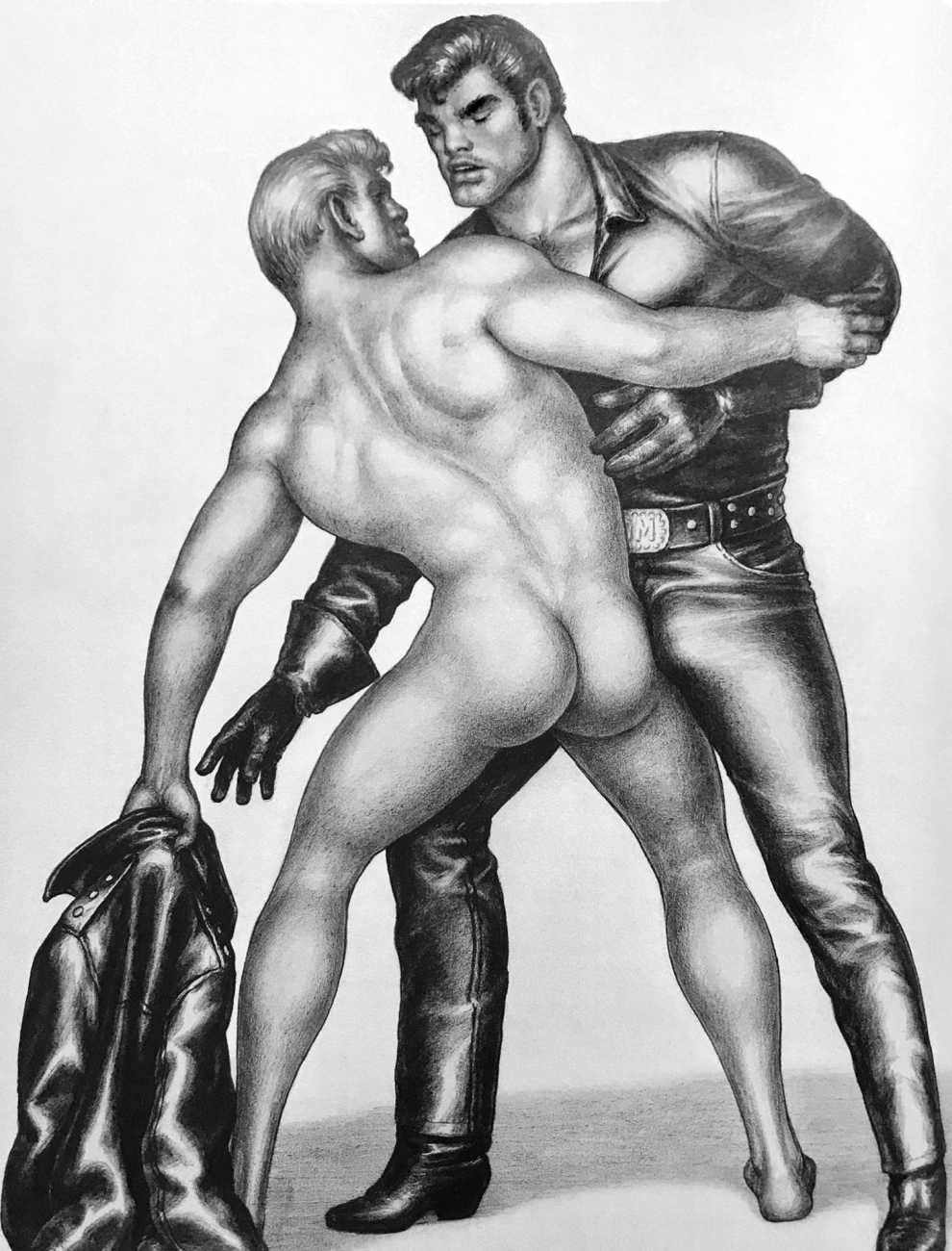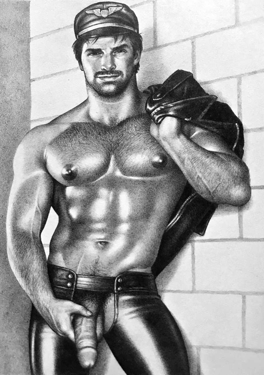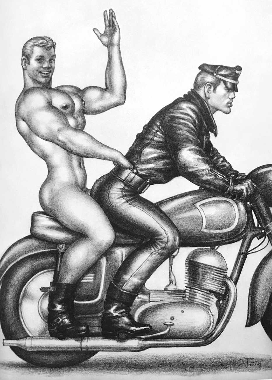 In 1956 Laaksonen submitted drawings to the influential American magazine Physique Pictorial, which premiered the images in the 1957 Spring issue under the pseudonym Tom, as it resembled his given name Touko. In the Winter issue later that year, editor Bob Mizer coined the credit ‘Tom of Finland’. The post-World War II era saw the rise of the biker, and Laaksonen’s drawings of bikers and leathermen capitalised on the leather and denim outfits, featuring gay men who were untamed, physical, and self-empowered, in contrast with the prevailing mainstream straight perception of the time of gay men as sad and oversensitive.