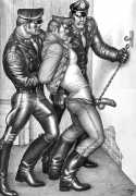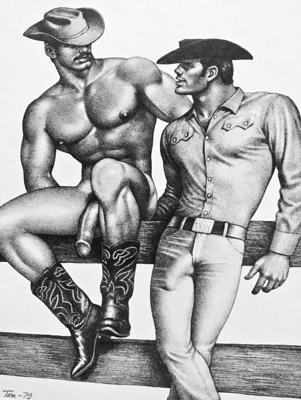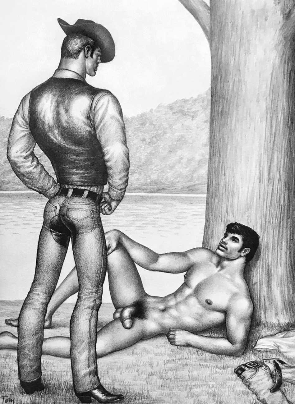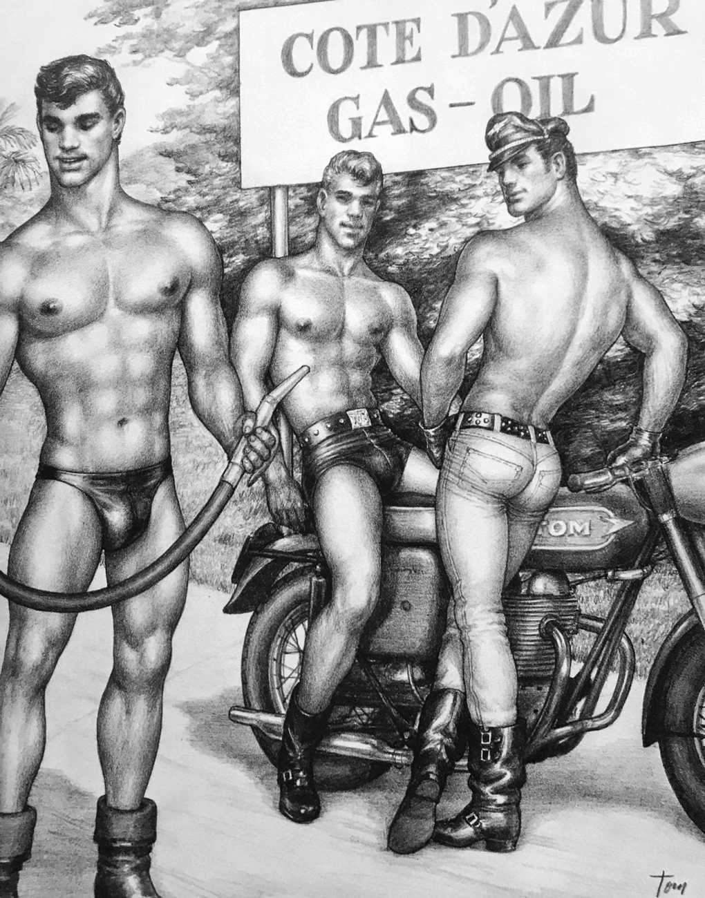 In 1956 Laaksonen submitted drawings to the influential American magazine Physique Pictorial, which premiered the images in the 1957 Spring issue under the pseudonym Tom, as it resembled his given name Touko. In the Winter issue later that year, editor Bob Mizer coined the credit ‘Tom of Finland’. The post-World War II era saw the rise of the biker, and Laaksonen’s drawings of bikers and leathermen capitalised on the leather and denim outfits, featuring gay men who were untamed, physical, and self-empowered, in contrast with the prevailing mainstream straight perception of the time of gay men as sad and oversensitive.