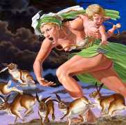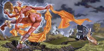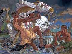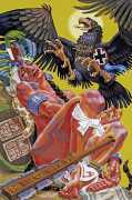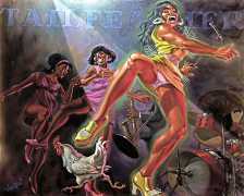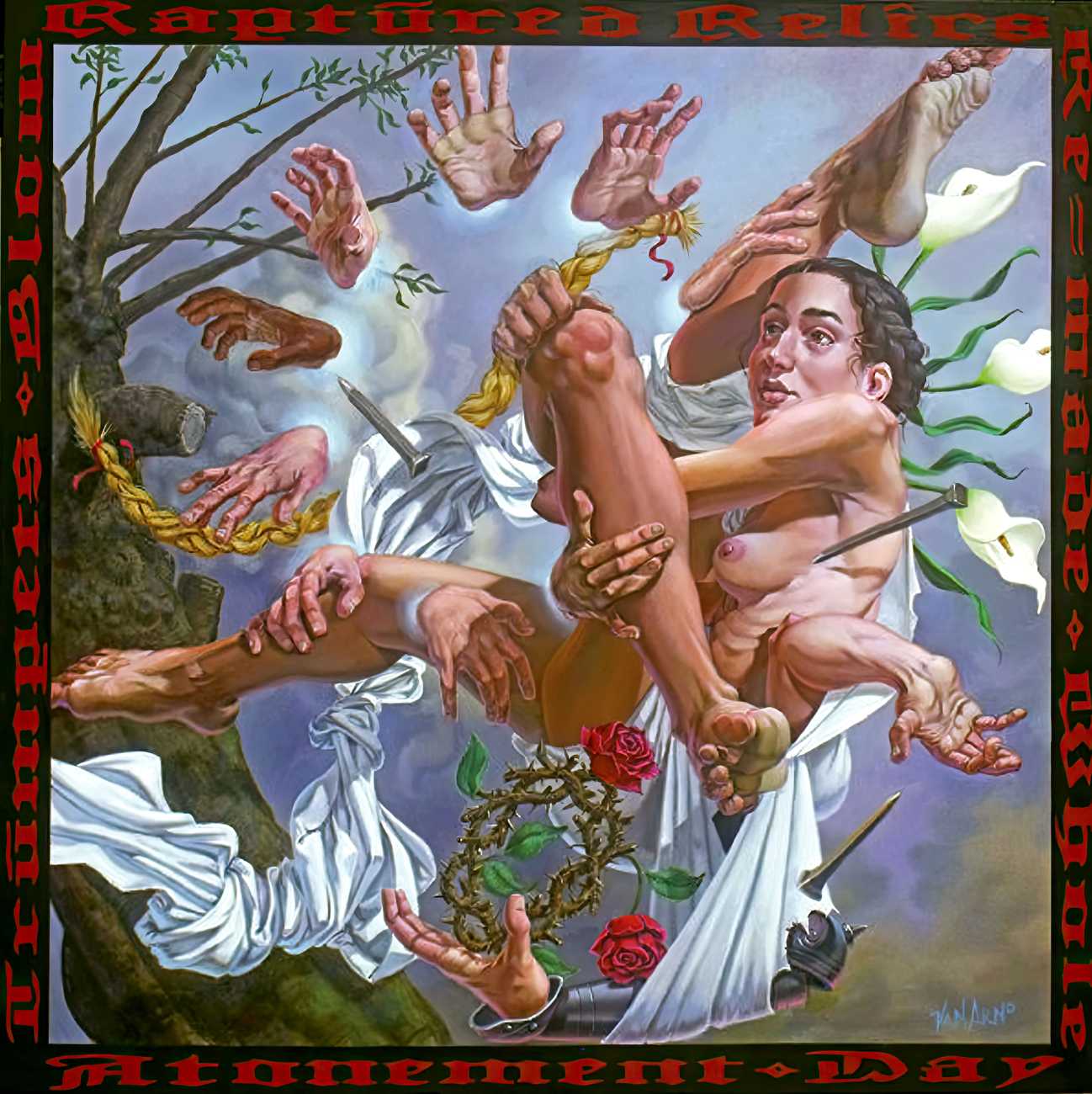 As a young illustrator his work appeared on album covers, video game box art, and nightclub posters, and in the late eighties he began producing large ‘cut-out’ paintings blending cartoon imagery with portraits of cultural and historical icons. These early paintings used black lines and luridly cartoon colour to depict characters ranging from John F. Kennedy to Herman Goering to Othello. To celebrate Christmas 1962 his guerrilla installation of a twelve-foot-tall angel hovered over Sunset Boulevard in Hollywood. Van Arno became fascinated with the calendar of the ancient Maya, and travelled to Yucatan to see the ruins at Chichen Itza, Coba and Tulum. During the early 1970s he began to create heroic figurative works featuring religious and folk heroes from Christian, Mayan and American history.