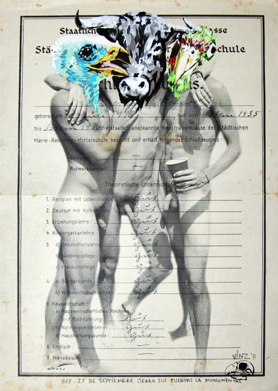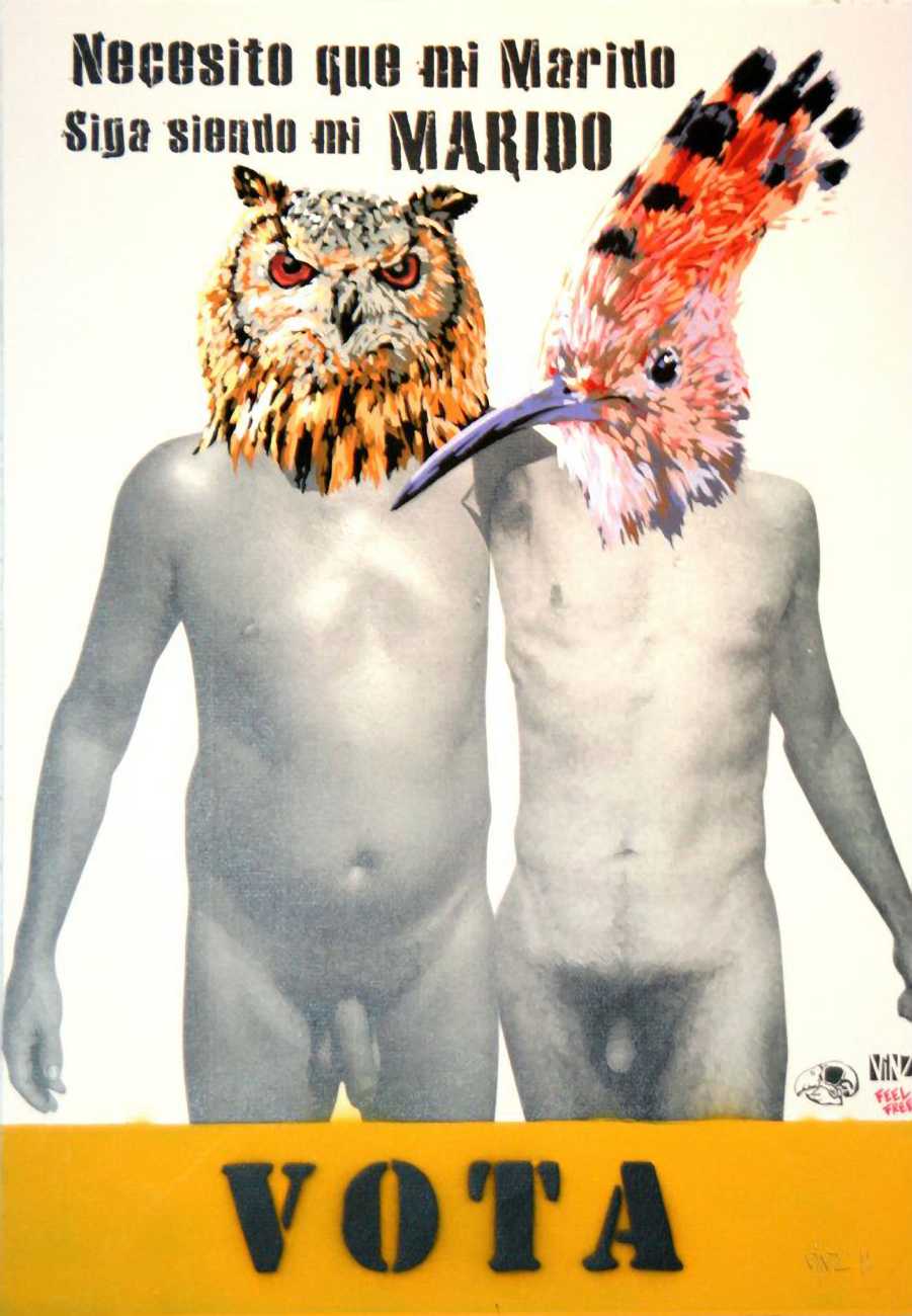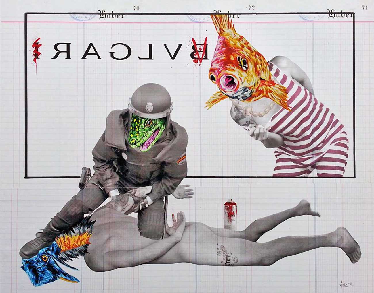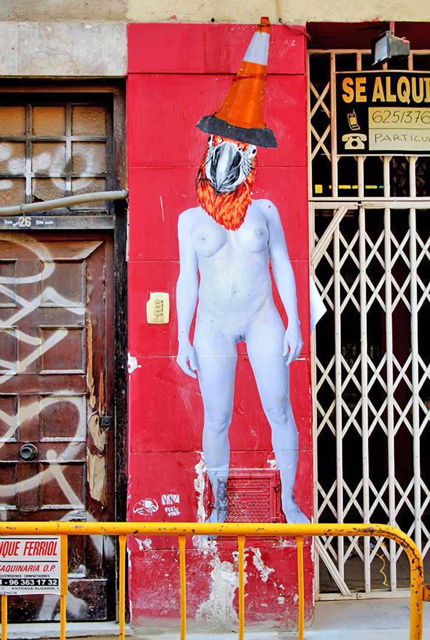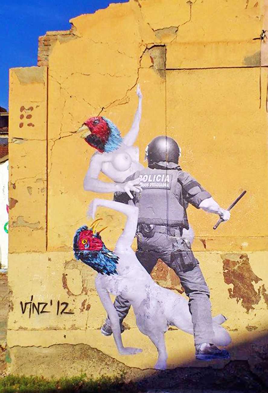 During the 5th Valencis Incubarte Festival in 2012 he created the wall art entitled No tú tú teme (Don't Be Afraid) in the neighbourhood of El Carmen de Valencia, showing three riot police officers deploying their batons against three women with naked bodies and birds’ heads. He created it partly as a tribute to the wives of miners from Asturias, León and Teruel who had begun a march towards Madrid in support of workers’ rights. When the mural was painted over, apparently by police officers, leaving the naked figures but eliminating the police figures, it generated a controversy in the media that reached the Congress of Deputies. In 2020 the complete restored work was acquired and incorporated into the Contemporary Art Collection of the Generalitat Valenciana. Since then murals by Vinz have been integrated into the French Institute of Valencia (La Marca €spaña, 2013) , the Circular Room of the Valencia City Council (Nosaltres el Poble, 2015), the Valencia Museum of Illustration and Modernity MUVIM (Gràcies!, 2020), and the Saló de Corts of the Palace of the Valencian Government in 2021.
