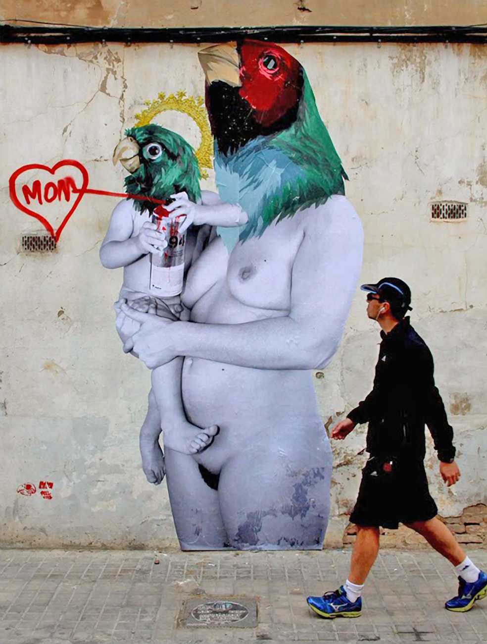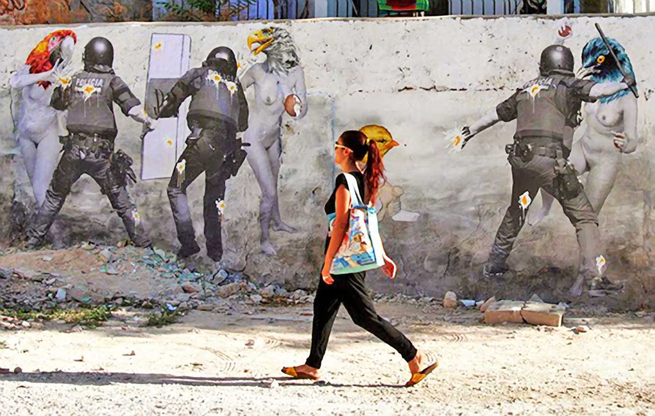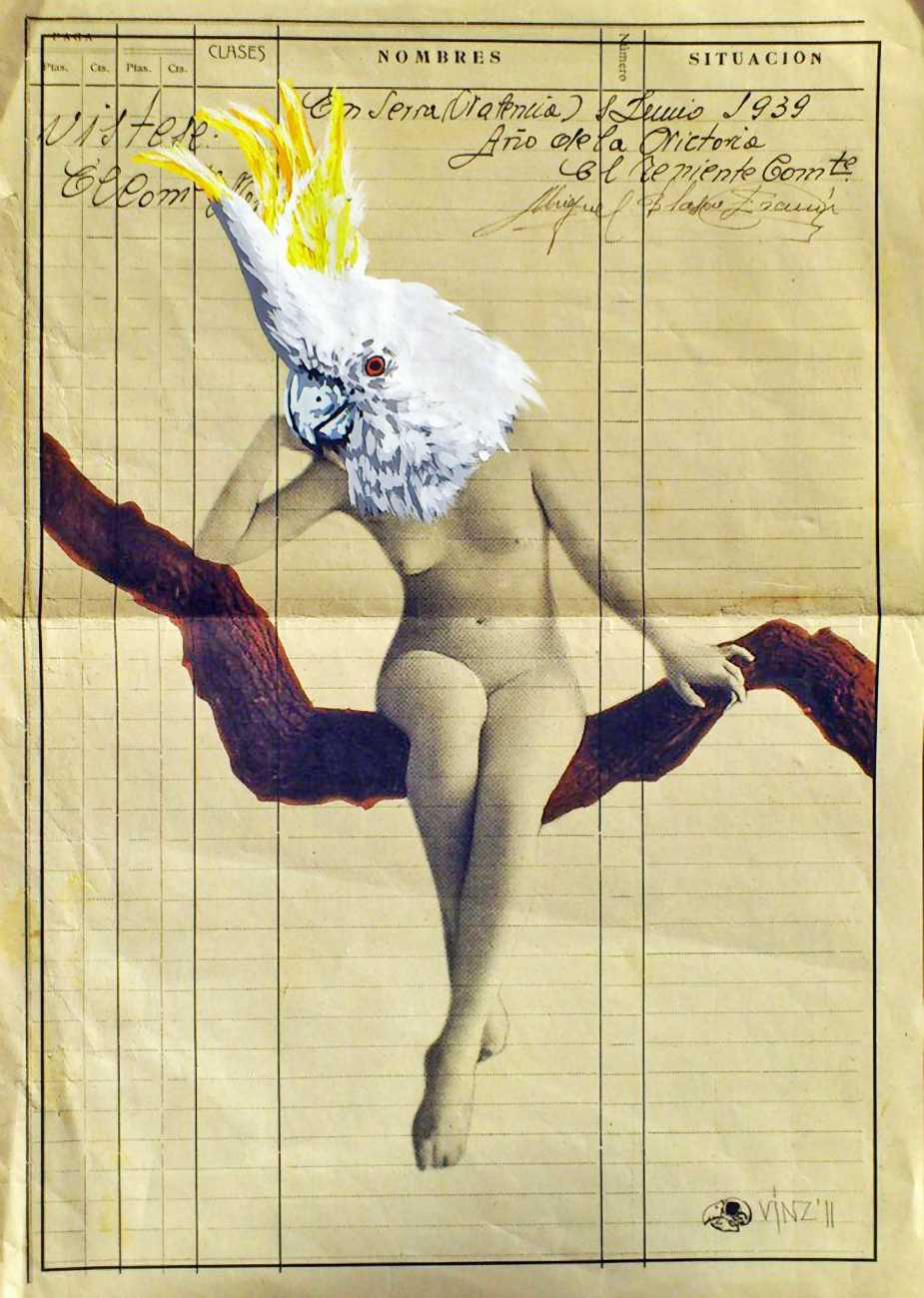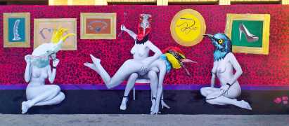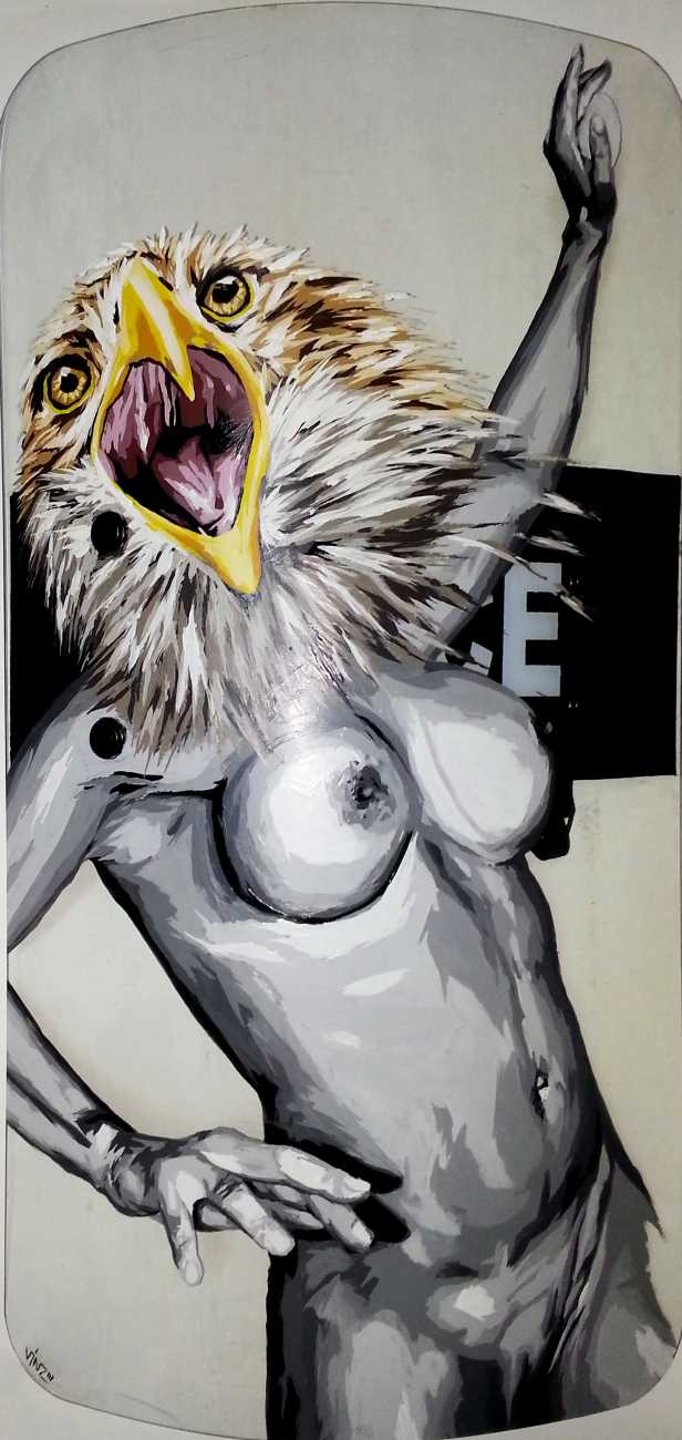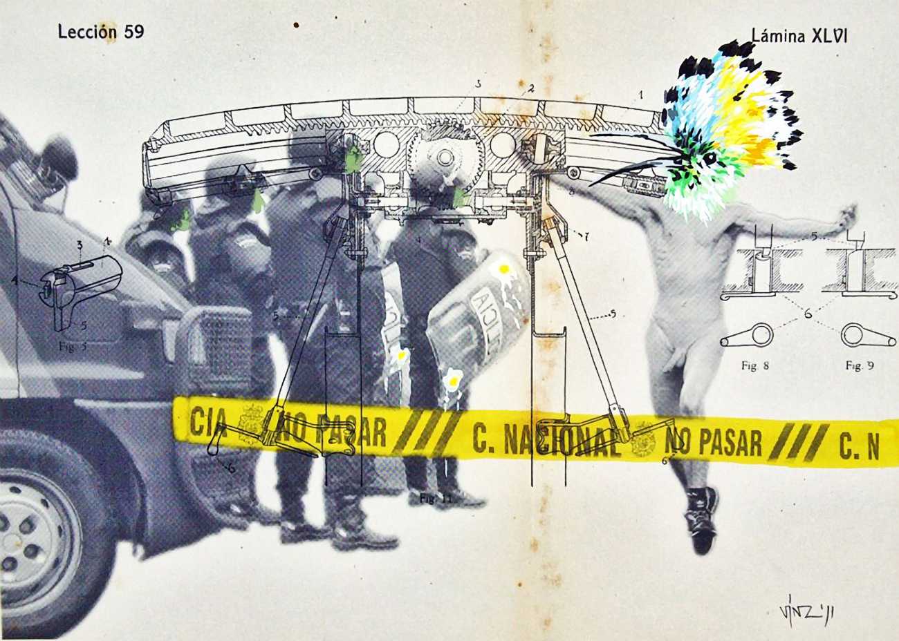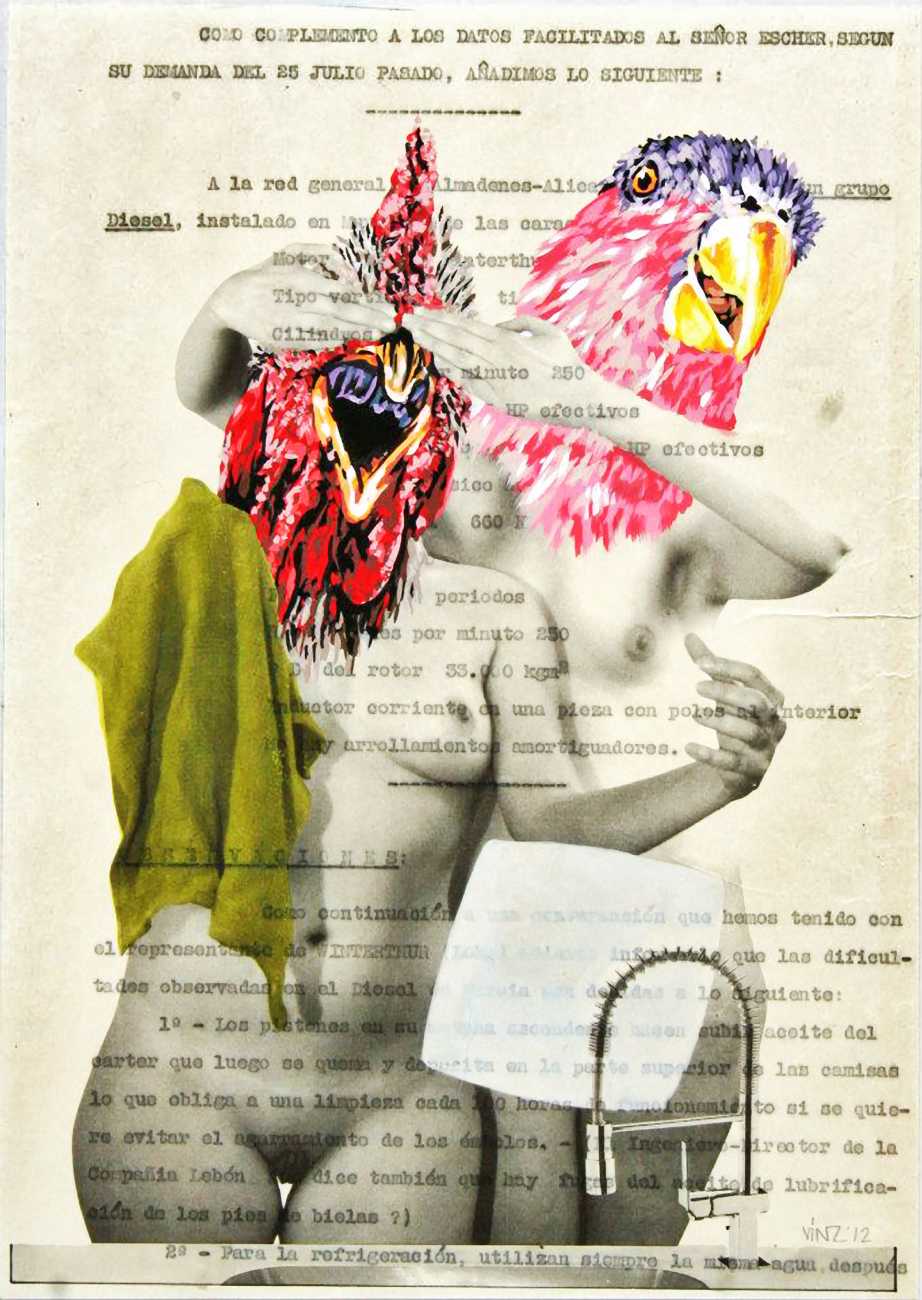 During the 5th Valencis Incubarte Festival in 2012 he created the wall art entitled No tú tú teme (Don't Be Afraid) in the neighbourhood of El Carmen de Valencia, showing three riot police officers deploying their batons against three women with naked bodies and birds’ heads. He created it partly as a tribute to the wives of miners from Asturias, León and Teruel who had begun a march towards Madrid in support of workers’ rights. When the mural was painted over, apparently by police officers, leaving the naked figures but eliminating the police figures, it generated a controversy in the media that reached the Congress of Deputies. In 2020 the complete restored work was acquired and incorporated into the Contemporary Art Collection of the Generalitat Valenciana. Since then murals by Vinz have been integrated into the French Institute of Valencia (La Marca €spaña, 2013) , the Circular Room of the Valencia City Council (Nosaltres el Poble, 2015), the Valencia Museum of Illustration and Modernity MUVIM (Gràcies!, 2020), and the Saló de Corts of the Palace of the Valencian Government in 2021.