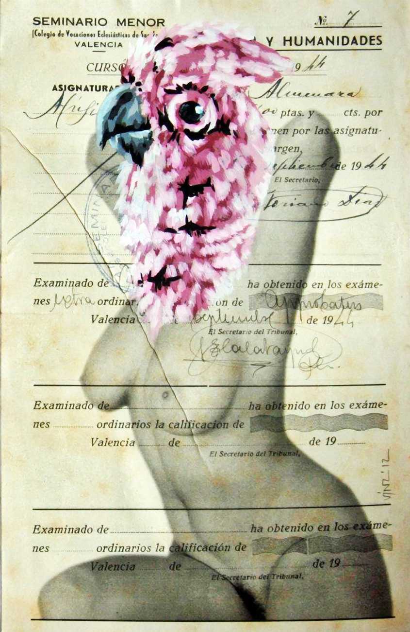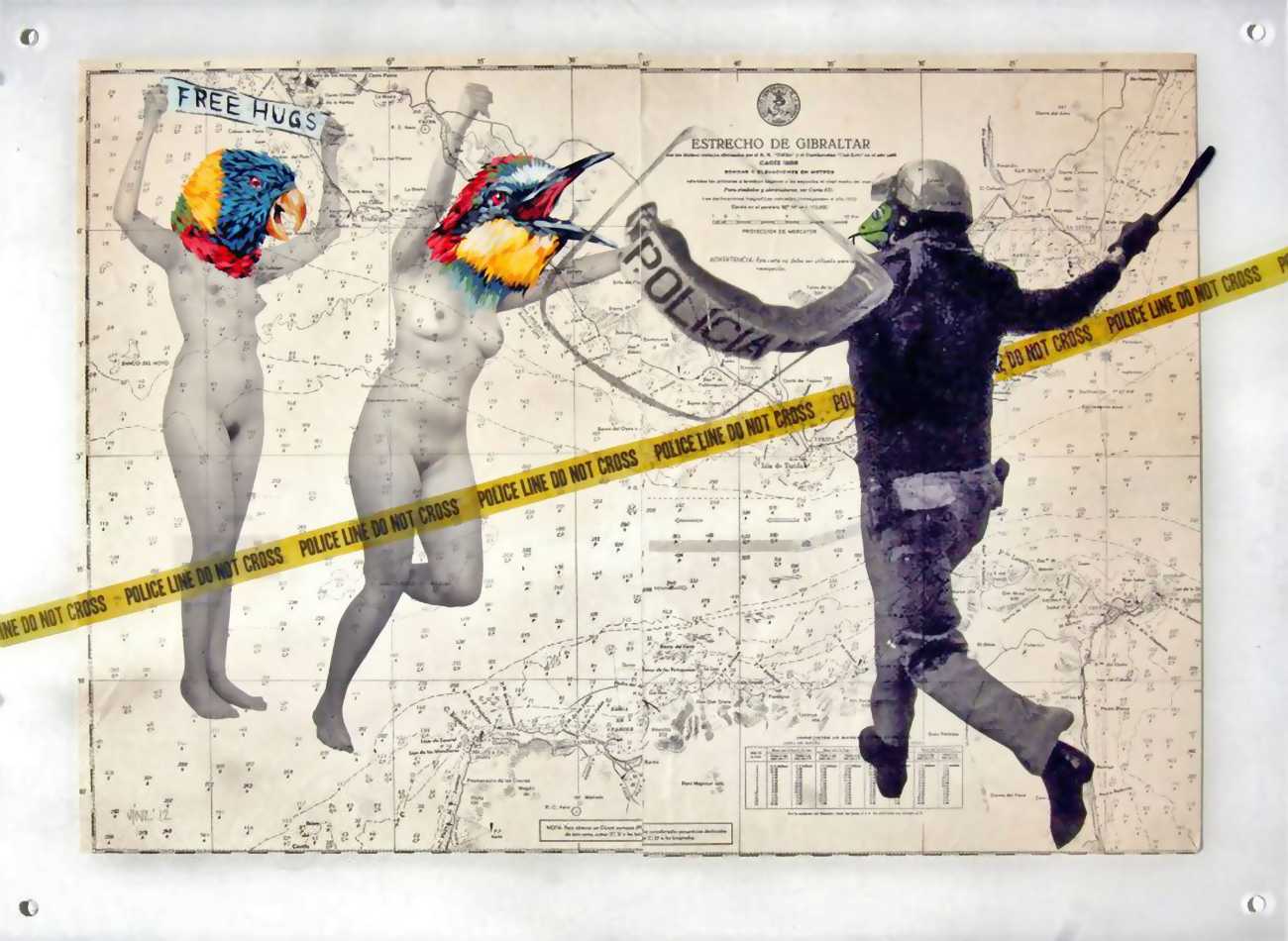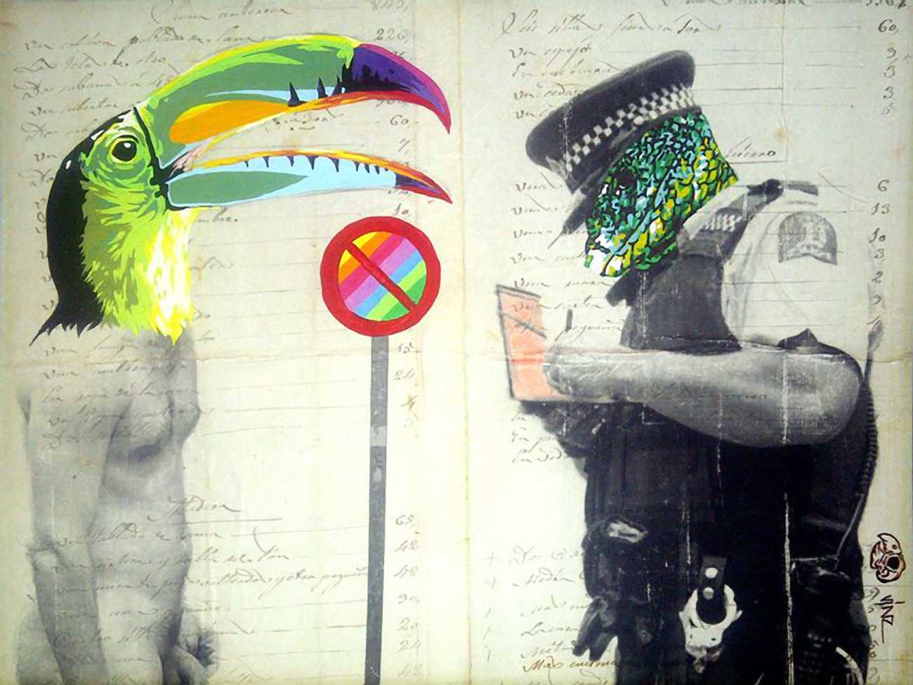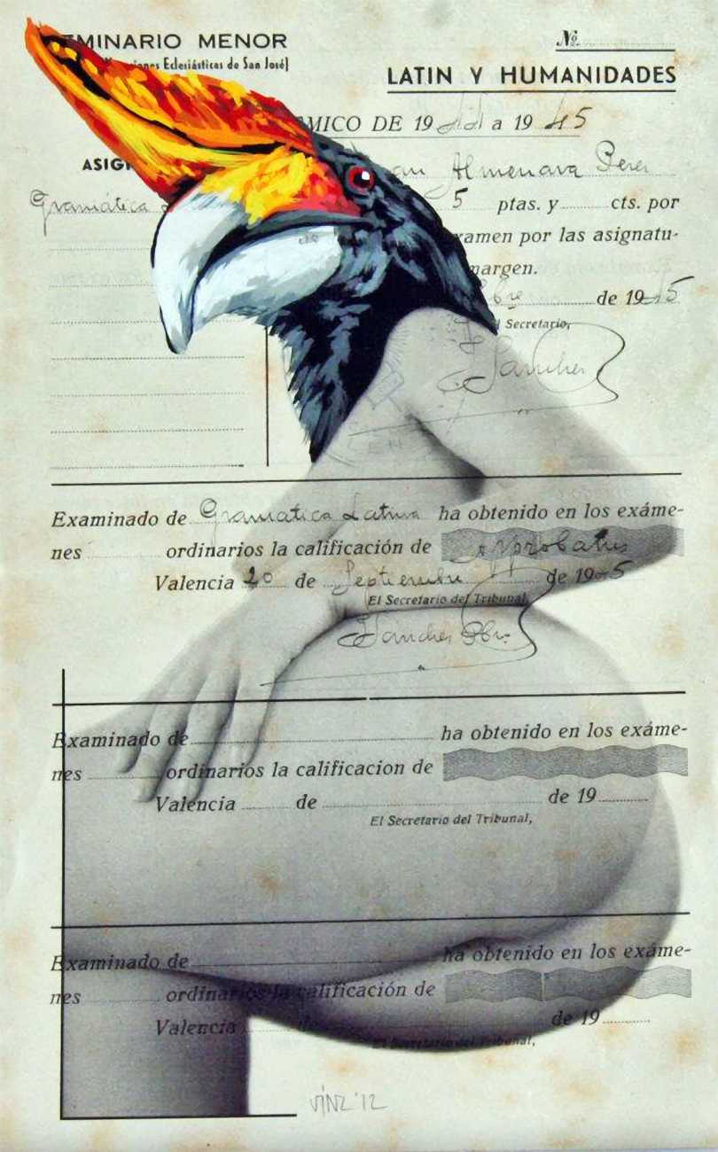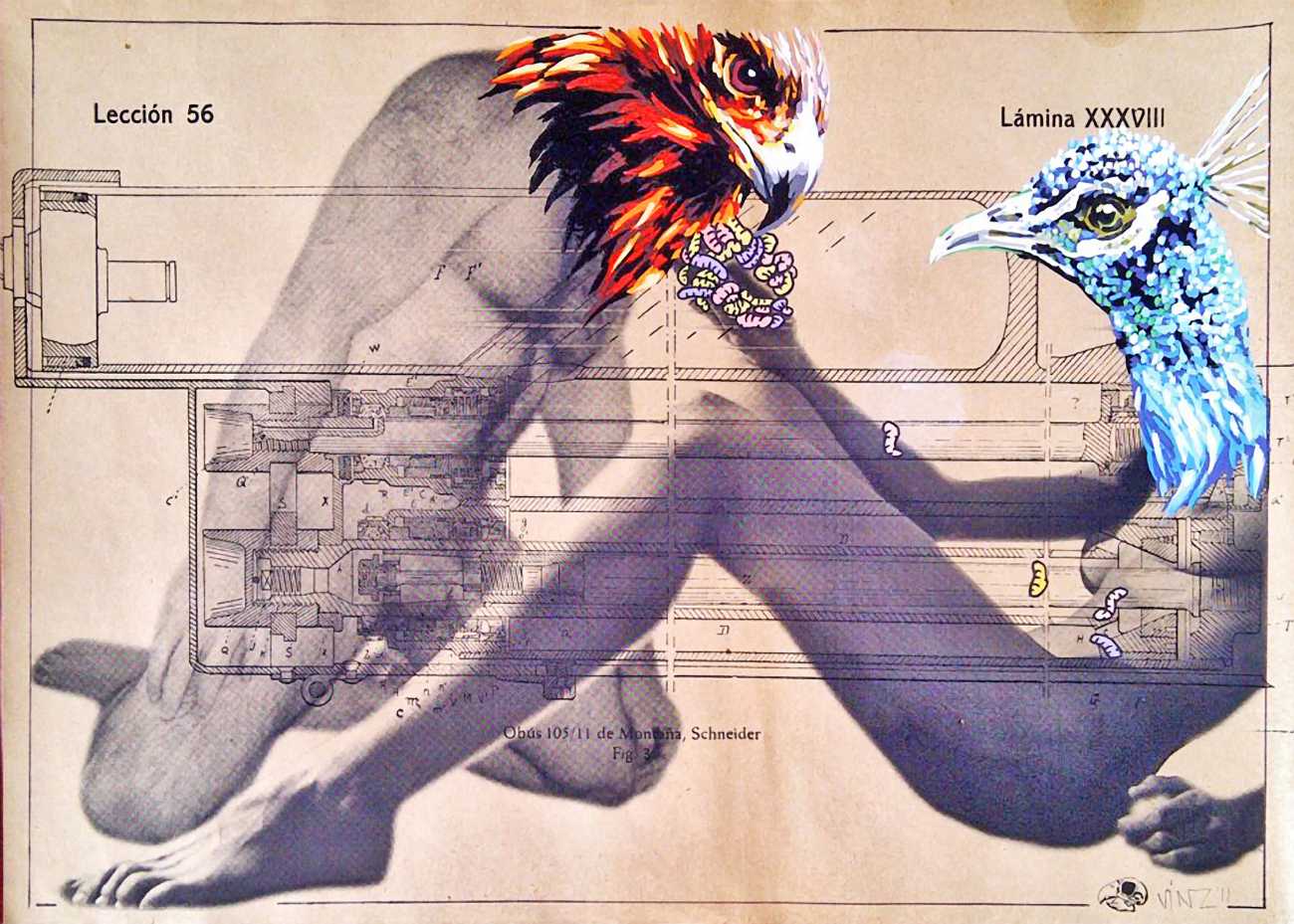 During the 5th Valencis Incubarte Festival in 2012 he created the wall art entitled No tú tú teme (Don't Be Afraid) in the neighbourhood of El Carmen de Valencia, showing three riot police officers deploying their batons against three women with naked bodies and birds’ heads. He created it partly as a tribute to the wives of miners from Asturias, León and Teruel who had begun a march towards Madrid in support of workers’ rights. When the mural was painted over, apparently by police officers, leaving the naked figures but eliminating the police figures, it generated a controversy in the media that reached the Congress of Deputies. In 2020 the complete restored work was acquired and incorporated into the Contemporary Art Collection of the Generalitat Valenciana. Since then murals by Vinz have been integrated into the French Institute of Valencia (La Marca €spaña, 2013) , the Circular Room of the Valencia City Council (Nosaltres el Poble, 2015), the Valencia Museum of Illustration and Modernity MUVIM (Gràcies!, 2020), and the Saló de Corts of the Palace of the Valencian Government in 2021.