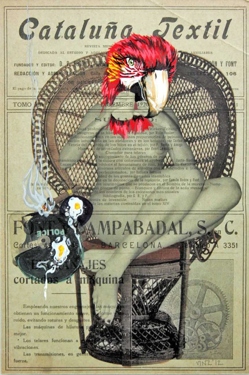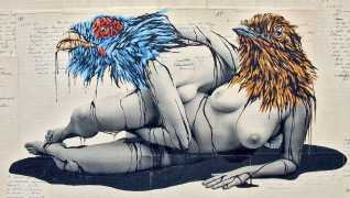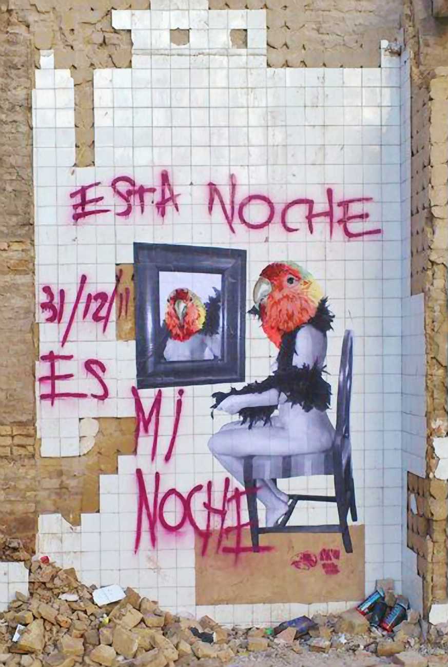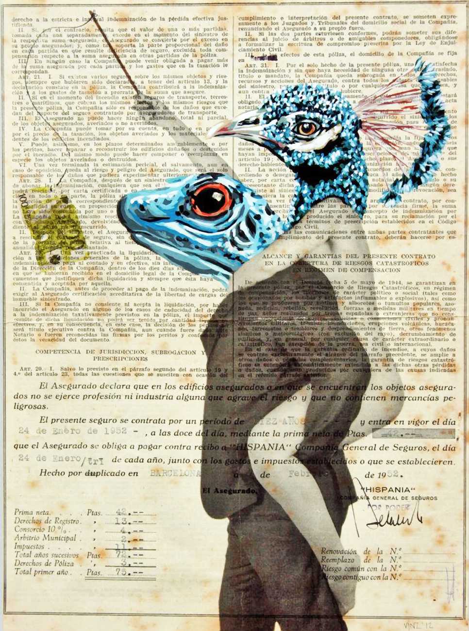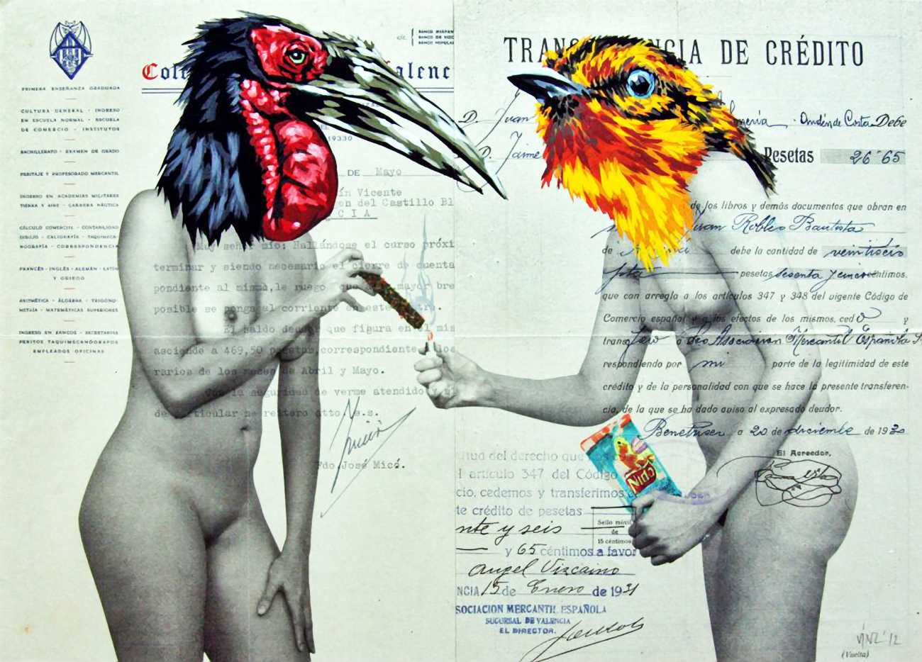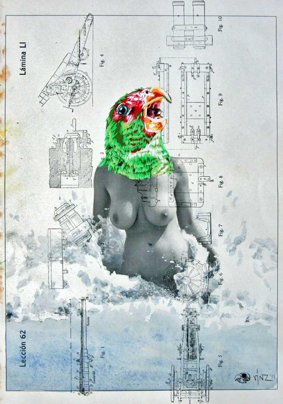 During the 5th Valencis Incubarte Festival in 2012 he created the wall art entitled No tú tú teme (Don't Be Afraid) in the neighbourhood of El Carmen de Valencia, showing three riot police officers deploying their batons against three women with naked bodies and birds’ heads. He created it partly as a tribute to the wives of miners from Asturias, León and Teruel who had begun a march towards Madrid in support of workers’ rights. When the mural was painted over, apparently by police officers, leaving the naked figures but eliminating the police figures, it generated a controversy in the media that reached the Congress of Deputies. In 2020 the complete restored work was acquired and incorporated into the Contemporary Art Collection of the Generalitat Valenciana. Since then murals by Vinz have been integrated into the French Institute of Valencia (La Marca €spaña, 2013) , the Circular Room of the Valencia City Council (Nosaltres el Poble, 2015), the Valencia Museum of Illustration and Modernity MUVIM (Gràcies!, 2020), and the Saló de Corts of the Palace of the Valencian Government in 2021.