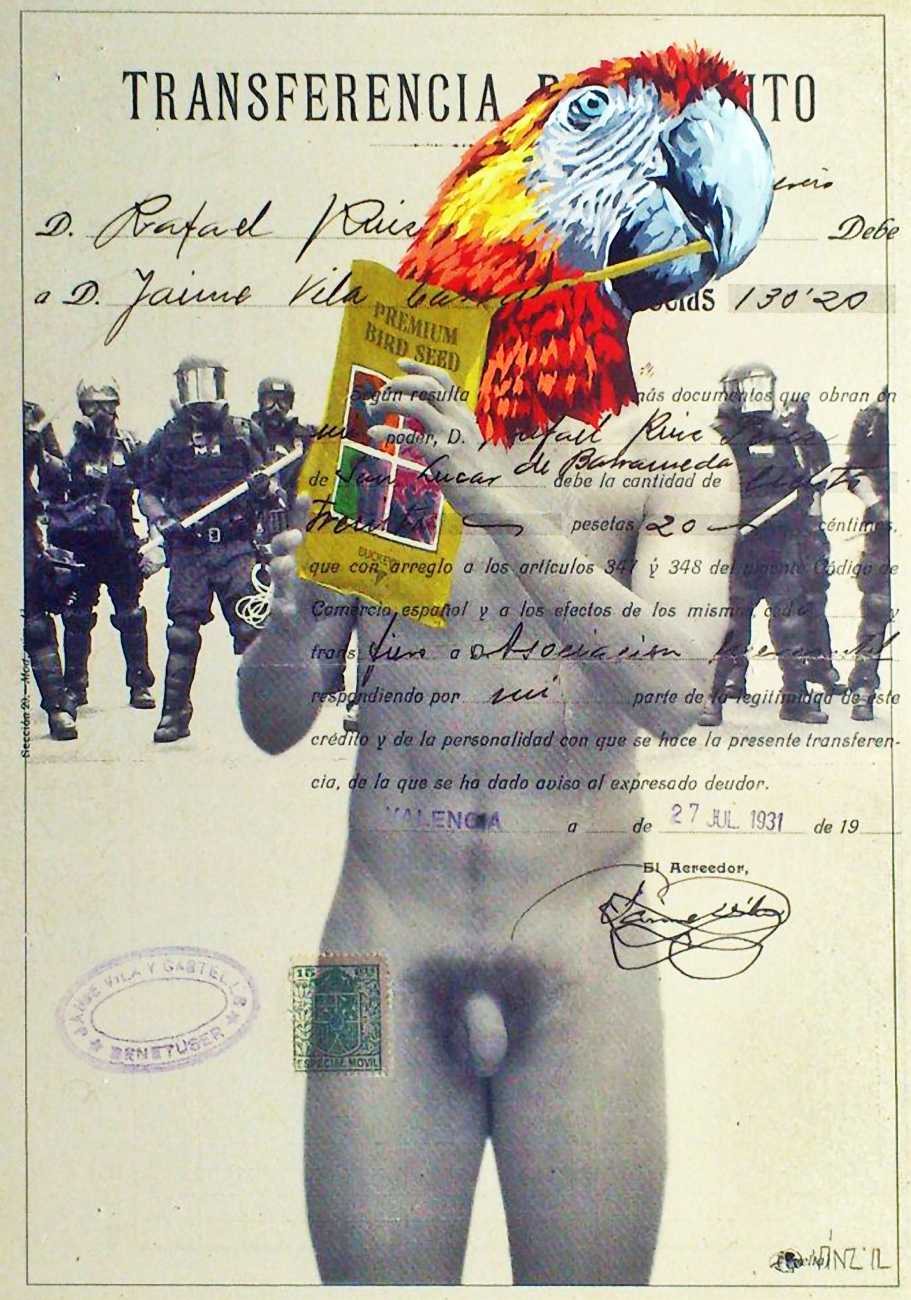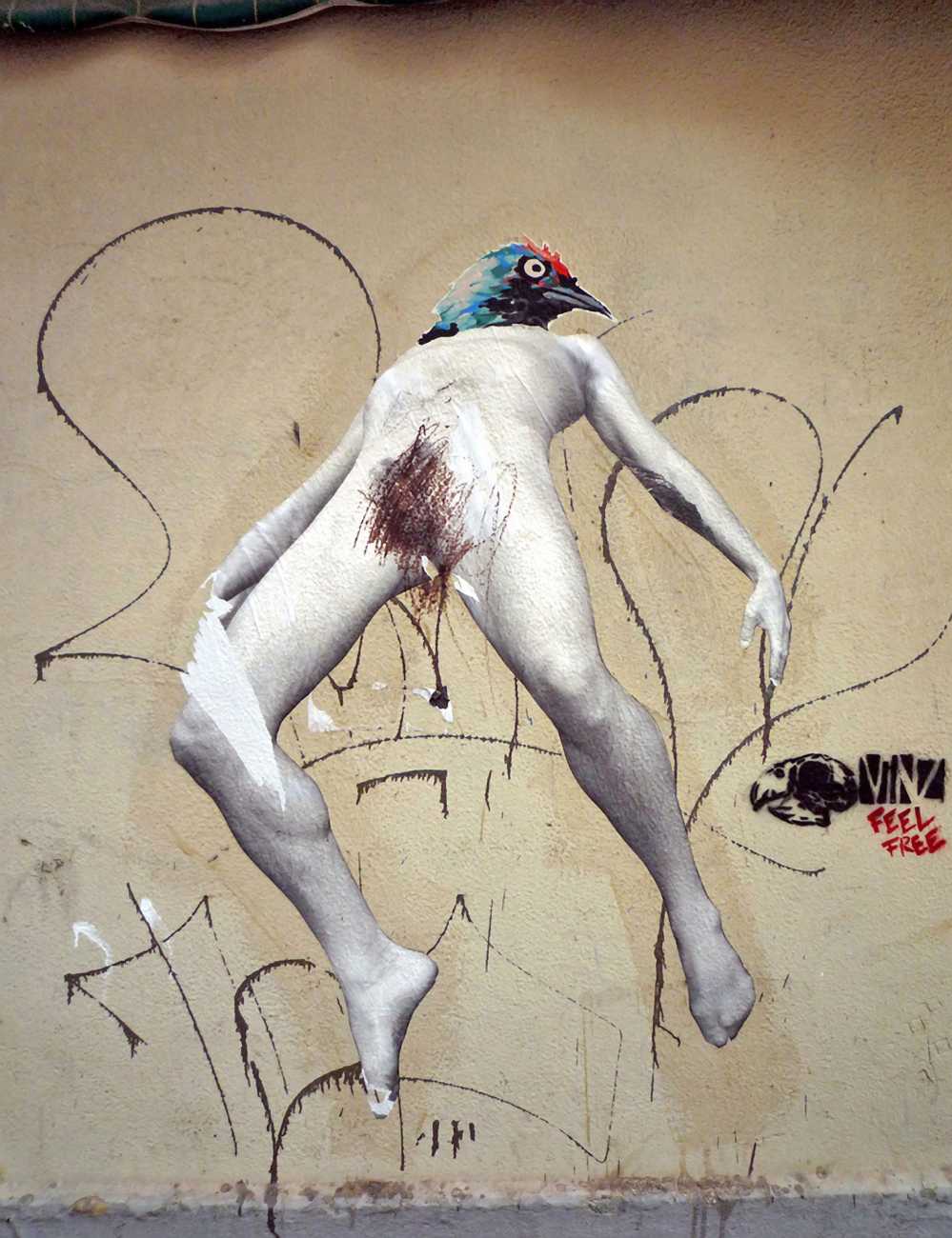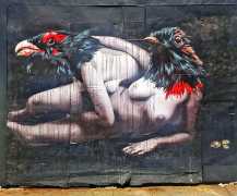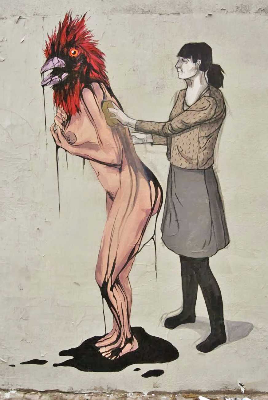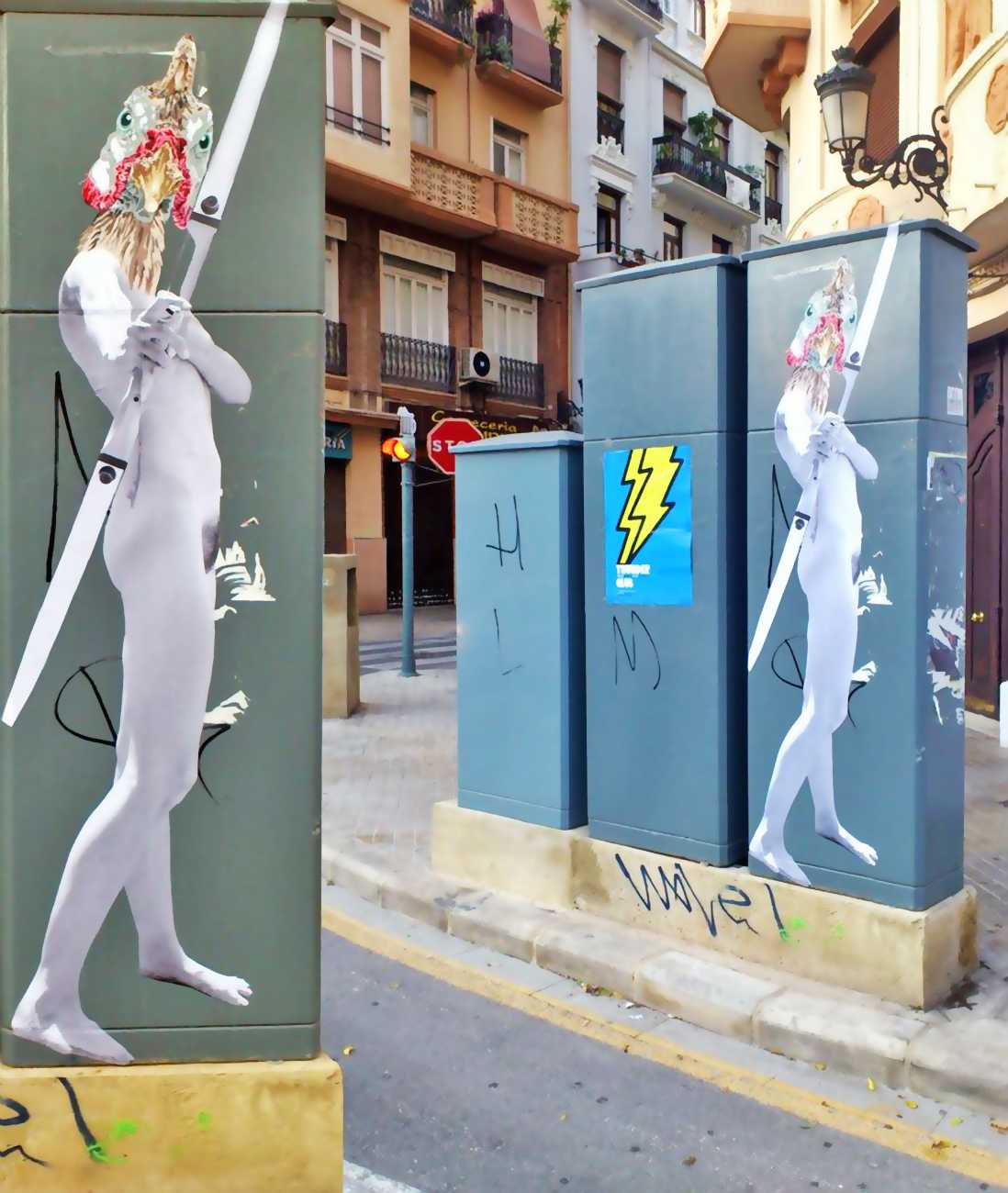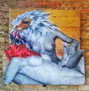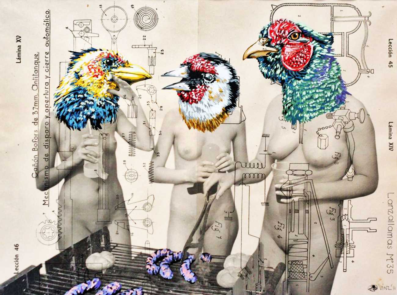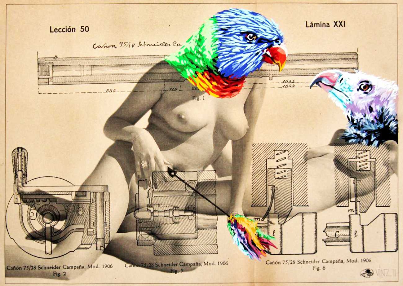 During the 5th Valencis Incubarte Festival in 2012 he created the wall art entitled No tú tú teme (Don't Be Afraid) in the neighbourhood of El Carmen de Valencia, showing three riot police officers deploying their batons against three women with naked bodies and birds’ heads. He created it partly as a tribute to the wives of miners from Asturias, León and Teruel who had begun a march towards Madrid in support of workers’ rights. When the mural was painted over, apparently by police officers, leaving the naked figures but eliminating the police figures, it generated a controversy in the media that reached the Congress of Deputies. In 2020 the complete restored work was acquired and incorporated into the Contemporary Art Collection of the Generalitat Valenciana. Since then murals by Vinz have been integrated into the French Institute of Valencia (La Marca €spaña, 2013) , the Circular Room of the Valencia City Council (Nosaltres el Poble, 2015), the Valencia Museum of Illustration and Modernity MUVIM (Gràcies!, 2020), and the Saló de Corts of the Palace of the Valencian Government in 2021.